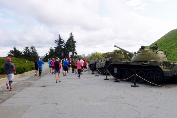 Dann Panzer: Hier stehen einige Exemplare aus den letzten Jahrzehnten. Ich erkenne einen T34. Wir kommen nun an mehreren Museen und Gedenkstätten vorbei. Unter der ewigen Flamme hindurch. Links und rechts riesige Skulpturen mit Kämpfern des zweiten Weltkriegs. Viele Läufer fotografieren mit ihren Handys. Das ist hier schon recht beeindruckend. Im September 1941 eroberte die deutsche Wehrmacht die Stadt. Viele Gefangene wurden gemacht, die in der Folge verhungerten. Zwei Drittel der jüdischen Bewohner konnten vorher fliehen. 33.000 Juden wurden in einem nahen Wald erschossen. Die deutschen Besatzer hatten in der Folge mit Zeitzündern in Gebäuden zu kämpfen, in der die Wehrmacht untergebracht war. Ein dadurch ausgelöster Brand griff auf viele andere Gebäude über und konnte erst nach fünf Tagen gelöscht werden.