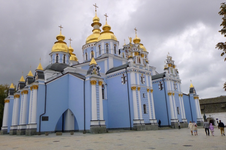 Umkleide und Taschenaufbewahrung befinden sich direkt vor dem Außenministerium. Daneben das St. Michaelskloster, gewidmet dem Erzengel, der als Schutzpatron der Stadt Kiew fungiert. Der einkuppelige Originalbau aus dem Jahr 1108 fiel immer wieder Zerstörungen anheim und wurde 1936 vom Sowjetregime abgerissen. Das heutige Gotteshaus mit den sieben goldglänzenden Kuppeln ist erst 19 Jahre alt. Davor recht klein ein Denkmal, welches an die Opfer der Hungerkatastrophe in den Jahren 1932-1933 erinnert. Durch eine stalinistische Landreform und eine Dürreperiode verringerte sich die Produktion und das wenige geerntete Getreide wurde dann auch noch teilweise an das kapitalistische Ausland verkauft. Für die Bevölkerung blieb kaum etwas übrig.