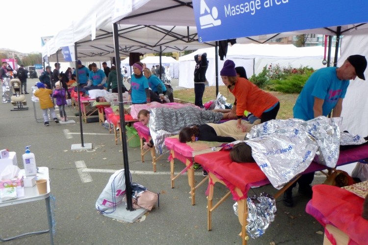 Dafür treffe ich noch einige andere deutsche Läufer und viele Mitstreiter von der Strecke. Ein vorübergehend einsetzender Nieselregen treibt uns in die Umkleidezelte. Duschmöglichkeiten gibt es wohl keine. Dafür wird die Massage gelobt, die manch einer auch schon vor dem Start in Anspruch nahm. Die Zielverpflegung ist in Ordnung, lediglich bei den Heißgetränken besteht noch Optimierungsbedarf. Und ein alkoholfreies Bier würde auch bei einstelligen Temperaturen munden.