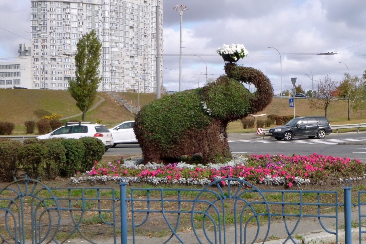 Der Aufstieg zur Pivnichnyi-Brücke ist schon schwer. Der Name bedeutet wohl „Nördliche Brücke“. Von 1976 bis 2018 hieß sie Moskovskyi. Für uns ist eine Spur gut abgesperrt. Der Wind pfeift. Der Blick nach rechts entschädigt für alle Mühen. Eine Kulisse wie in Singapur: Wohnhochhäuser, soweit das Auge reicht. Goldener Sandstrand. „Tempelchen“, die man hier wohl eher als orthodoxe Kirchen bezeichnen würde. Ein chinesisches Restaurant. Elefanten... Tatsächlich: Ein Elefant in Form einer Blumeninstallation wartet an der nächsten Verkehrskreuzung auf uns. Entweder bin ich schon völlig weggetreten oder es ist wirklich beeindruckend. Noch mal drei Kilometer bis Kiew-Podil. Links wird eine neue Brücke über den Dnepr gebaut, für den Auto- und Schienenverkehr. Bei Km 35 noch mal auftanken. Dann hinauf auf die Havansky-Brücke. Diese überquert eine Zufahrt zu einem Hafenbecken. Wunderbare Ausblicke auf die Innenstadt samt Völkerfreundschaftsbogen. Unten die Ausflugsschiffe, oben die St.-Andreas-Kirche. Podil empfängt uns mit kleinen Hafenkaschemmen. Ein Schlenker, dann an Mädels im Dirndl vorbei auf die Nyzhnii Val. Das Viertel wurde nach einem Großbrand 1811 im klassizistischen Stil erneuert. Nicht unbedingt auf unserer Straße, sondern ein Stück links um den Kontraktowa-Platz herum. Joe durfte hier letztes Jahr noch laufen. Hoffe, das Schleifchen wird wieder eingebaut. Wir hatten das gestern auf dem Sightseeing-Programm.