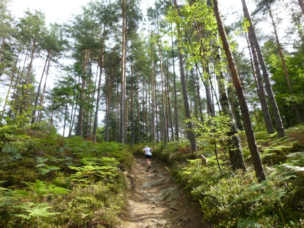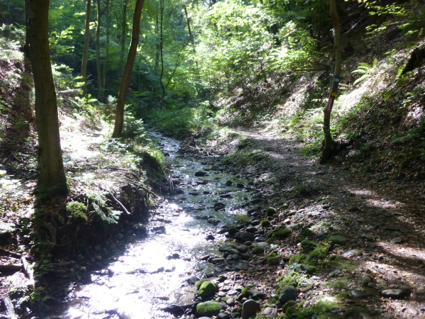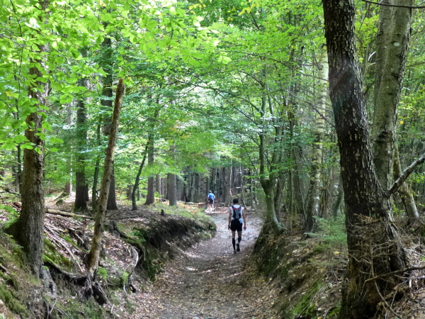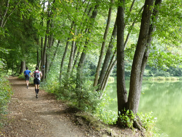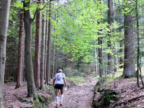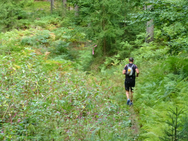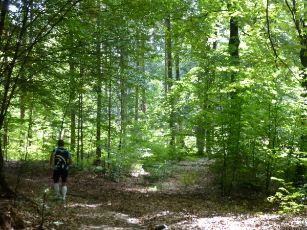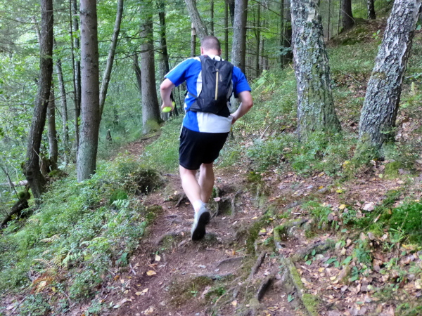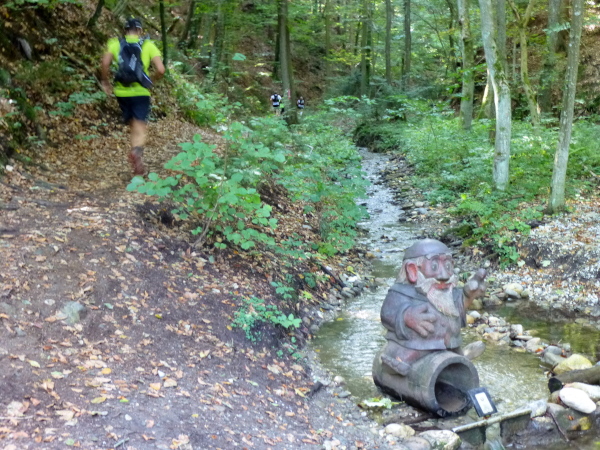 Irgendwann habe ich genug vom Asphalt und so freue ich mich, dass es ab Cap Wörth hinter der wundervoll gelegenen Schlossvilla Miralago wieder weg vom Ufer hinein in den Wald geht. Die folgenden Kilometer sind profilmäßig im Vergleich zu dem, was uns am Nordufer abverlangt wurde, vergleichsweise harmlos. Wir folgen einem kleinen Bach in ein verwunschenes Tal hinein. Die Sonne strahlt durch das Blätterdach, das gurgelnde Wasser glänzt, die Blätter leuchten – und ich träume zu viel. Denn auf einmal stehe ich mutterseelenallein im Wald, niemand vor, niemand hinter mir, und vor allem: von einer Streckenmarkierung keine Spur. Jetzt hat es mich doch erwischt, ich bin ab vom Kurs. Da hilft nur eines: zurück laufen. Erleichtert bin ich dann doch, dass ich nach einem Weilchen einen anderen Läufer in der Ferne erspähe. Der erkennt mein Missgeschick sofort und weist mit der Hand in die richtige Richtung.