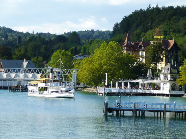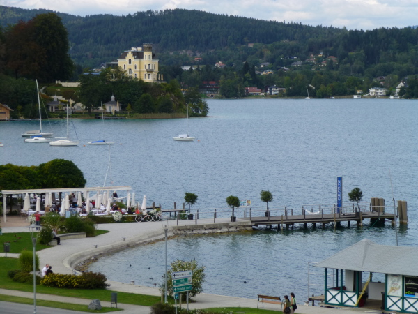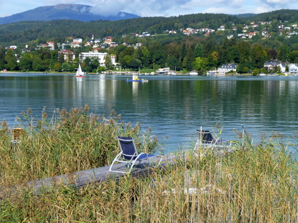 Etwa zwei Kilometer folgen wir auf bequemem Fußweg unmittelbar dem Seeufer. Marinas und exklusive Strandbäder geben sich die Klinke, Bataillone von Liegestühlen stehen auf den Holzstegen bereit. Doch sie sind alle .... leer. Mit Erstaunen muss ich feststellen, dass die Saison in Velden schon gelaufen ist.