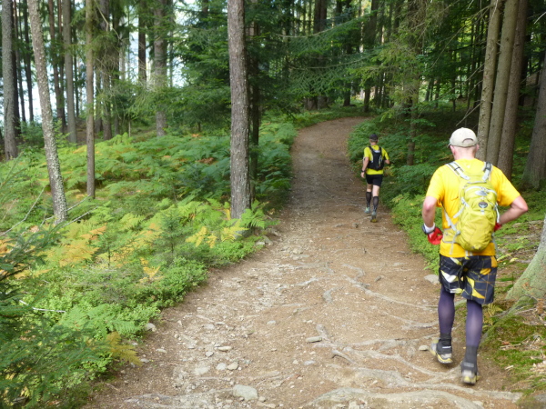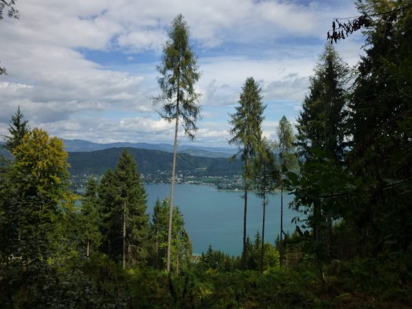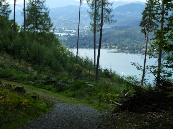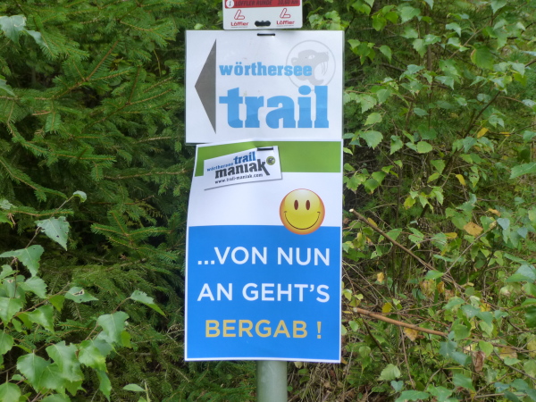 Ein smileygarniertes Schild kurz vor km 52 verkündet schließlich: "... von nun an geht´s bergab". Dazu kann ich nur sagen: Vergess es! Ein Blick zwischen den Bäumen hindurch könnte zwar Anlass zu Vermutung geben, dass Klagenfurt und damit das Ziel gar nicht mehr weit sind. Doch der Trail zieht sich, wendet sich gar in einem weiten Bogen ab vom See. Und das weiterhin in munterem Auf und Ab. Meiner Wortwahl mag man schon anmerken: Ich habe genug für heute. Aber danach geht es nicht. Mehr schlecht als recht schleppe ich mich durch den Wald und ergebe mich meinem Schicksal.