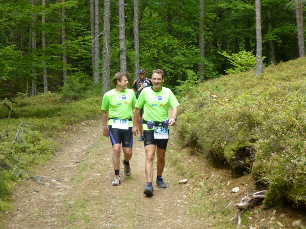 Doch das Aufreger-Highlight steht mir noch bevor. Ganz gemütlich trabe ich mit einer anderen Läuferin einen morastigen Pfad dahin. Urplötzlich, wie ein Blitz aus heiterem Himmel, kommt er über uns: ein laut brummender Schwarm. Ich weiß im ersten Moment gar nicht, was los ist. Doch als ich einen brennenden Schmerz am Hals spüre, ahne ich es schon. Mit wild fuchtelnden Armen jagen wir davon, bis wir uns einigermaßen in Sicherheit wähnen. Meine Mitläuferin hat es am Kopf erwischt und wenig später, an der Labestelle in Auen (km 31), weiß ich, dass wir keinesfalls die einzigen Opfer sind. Ein völlig aus dem Häuschen geratener, aggressiver Hornissenschwarm fällt über jeden vorbeikommenden Läufer her und fast niemanden gelingt es, da unbeschadet heraus zu kommen. Den ankommenden Läufern sieht man sofort an, wo es sie erwischt hat. Die meisten halten sich den Kopf und versuchen mit kaltem Wasser, das Brennen zu kühlen. Am ärgsten erwischt es einen Läufer mit zehn Stichen. Da ein Kollaps befüchtet wird, kommt vorsichtshalber gar ein Rettungshubschrauber. Im Ziel höre ich aber später, dass auch er die Attacke gut überstanden hat.