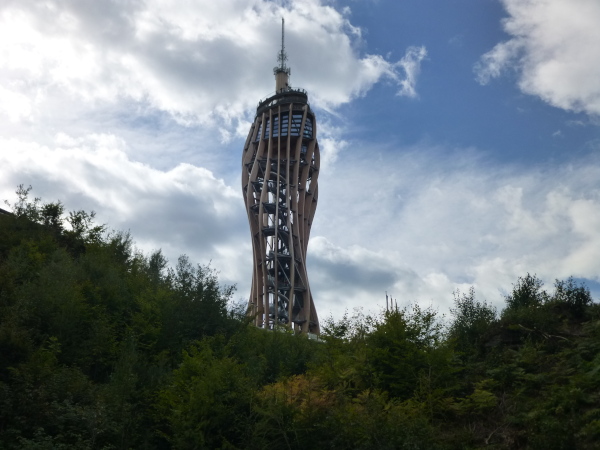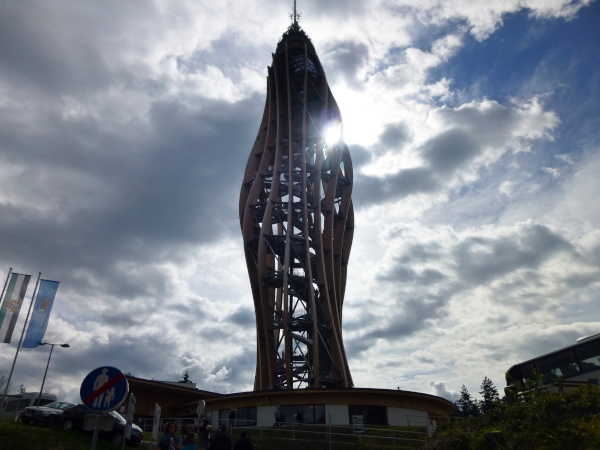 Der Gipfel des Pyramidenkogel bei km 40,4 ist mit 850 m üNN die höchste Erhebung direkt am Wörthersee. Das allein ist allerdings nicht wirklich beeindruckend. Doch was dem Gipfel aufgepflanzt wurde, das nötigt wohl jedem ein "Wow!" ab. Denn gekrönt wird er von einem eigen- wie einzigartigen Bauwerk: dem welthöchsten Holzaussichtsturm. 100 m ist er hoch, inklusive Antenne. Erst am 20.06.2013 wurde er eröffnet, nachdem der alte Turm vor kaum einem Jahr gesprengt wurde. 11 Ebenen mit sechs Aussichtsplattformen weist die futuristisch spektakulär geformte, schraubenartig gedrehte Holz-Stahl-Konstruktion auf. Die höchste Aussichtsebene liegt 72 m hoch und aus 52 m Höhe kann man per Rutsche nach unten gleiten. Ein echter Hingucker!