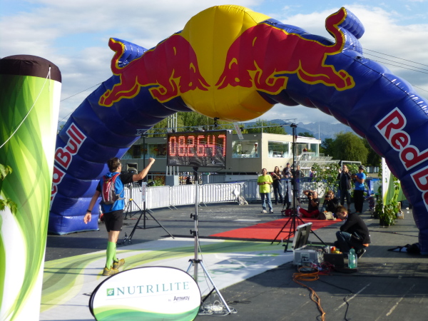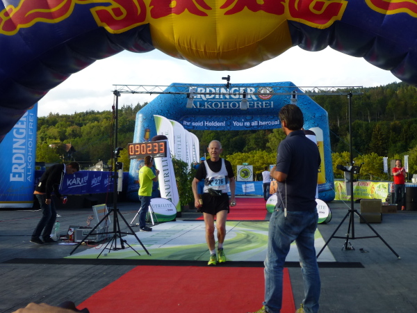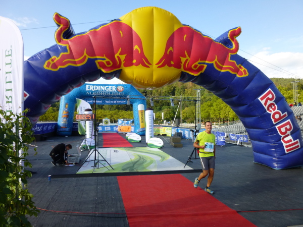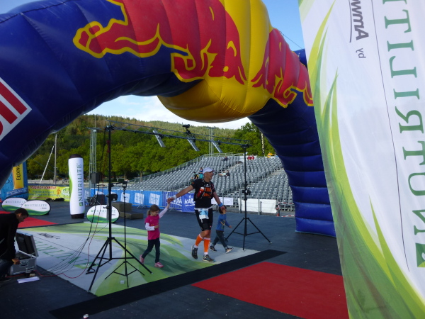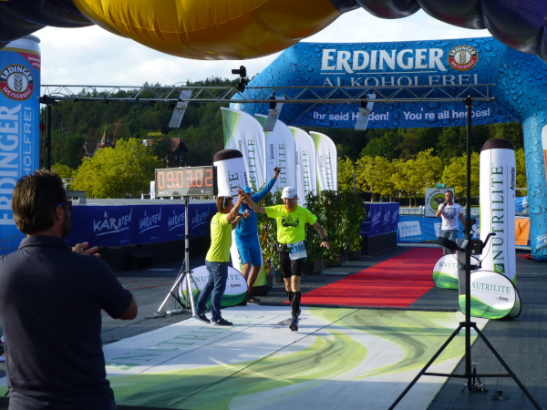 Nur im Abstand von mehreren Minuten tröpfeln die Finisher ins Ziel. Doch womit der Veranstalter die einsamen Läufer nach 57 bewältigten Kilometern empfängt, lässt niemanden kalt. Schon entlang der Seepromenade laufend höre ich laute Musik von der Seebühne und meinen Namen über den Äther schallen. Das Klatschen der die Nachmittagssonne an der Promenade genießenden Besucher begleitet mich bis zu der im See thronenden Seebühne. Ein letzter Schlenker und ich bin mitten drauf. Roter Teppich ist ausgelegt, überspannt von farbenfrohen Zielbögen und flankiert von flatternden Fahnen. Um mich herum blitzt das Wasser in der Spätnachmittagssonne. Was für ein Finish! Ein wundervoller Abschluss eines wundervollen Laufs.