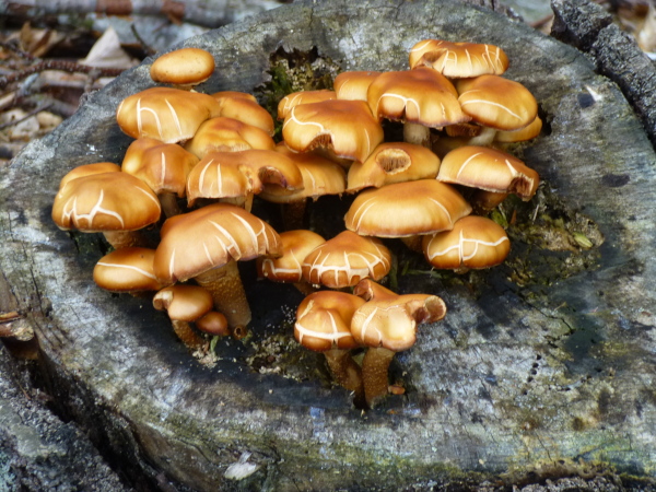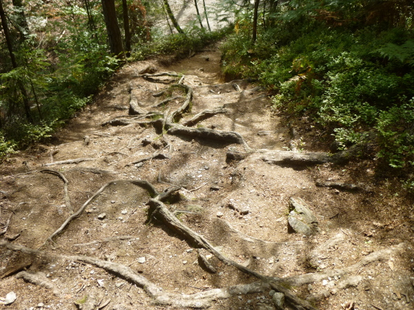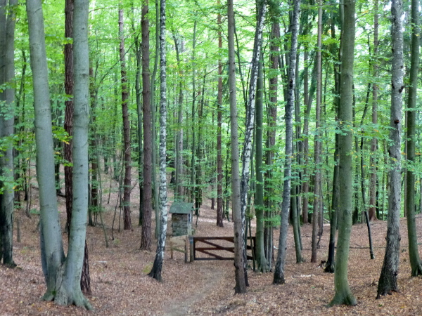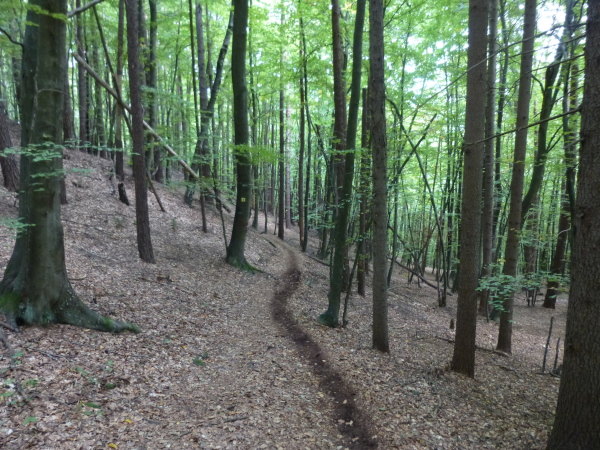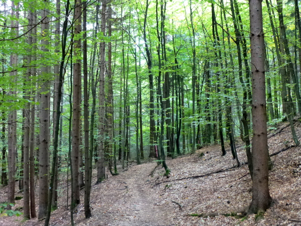 Der grün schimmernde Trattnigteich bei km 36 signalisiert uns: nun heißt es Energien zu mobilisieren. Der Gipfelsturm auf den Pyramidenkogel steht an. Durch eine ausgewaschene, altlaubgefüllte Rinne geht es durch herrlichen Laubwald. Je höher wir kommen, desto steiniger und wurzeliger wird der Untergrund. Fast schon kunstvoll wirkt es, wie die Wurzeln bisweilen verschlungen umher mäandern. Der Pfad mündet in eine Forststraße, die zwar bequemer, aber deutlich langweiliger ist. Steil ist diese Straße nicht, aber sie zieht sich Serpentine um Serpentine nicht enden wollend in die Höhe. Nur selten kann ich mich aufraffen, aus dem Marsch in leichten Trab zu verfallen, vor allem dann, wenn ich an einer Wandergruppe vorbei muss. Ganz schön albern.