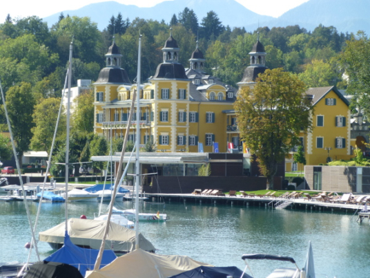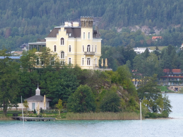 Schon von der Labestation aus sichtbar ist das Wahrzeichen Veldens, das wir kaum 200 Meter weiter passieren: das Schloss. Bereits im 16.Jahrhundert angelegt, häufig um- und ausgebaut wurde der prunkvolle Renaissancebau mit den vier Ecktürmen. Überregional berühmt wurde das Schloss aber erst Anfang der 90er-Jahre, als Roy Black selig vor laufender Kamera im "Schloss am Wörthersee" sein Unwesen trieb. Heute kann man hier für viel Geld überaus exquisit nächtigen.