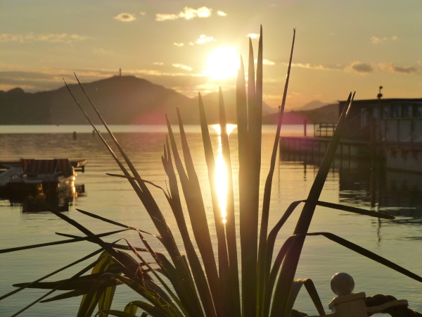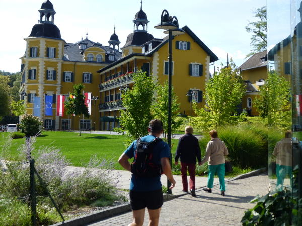 Velden – kein Ort repräsentiert den Wörthersee so wie dieser. Wörthersee ohne Velden ist ebenso undenkbar wie umgekehrt. Velden ist der bekannteste, mondänste und wohl auch schönste Ort am See. Alte Villen, exklusive Hotels und Strandbäder, chice Shops, hier fühlt sich die "Schicki-Micki-Welt" zu Hause. Durch stille, gepflegte Straßen am Ortsrand arbeiten wir uns in Richtung Zentrum vor. Das Zentrum, das ist letztlich die Gegend um Seepromenade und -corso. Direkt am See und am Rande des Kurparks ist bei km 27 unter Baldachinen unser (Fast)Halbzeit-Buffet angerichtet. Sogar ein supergesundes Dinkelsüppchen steht im Angebot; meinen Geschmacksnerv trifft sie aber nicht so ganz.