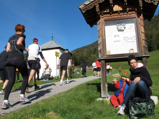 Ein Blick zurück und es ist klar, wir sind in einer traumhaft schönen Landschaft. Der See glitzert, die umliegenden Berge erscheinen schemenhaft im dunstigen Sonnenlicht, die Bäume sind schon leicht herbstlich gefärbt. 250 Höhenmeter sind es hinauf zum Falkenstein, dem Knackpunkt der Strecke, zu dem es keine Alternative gibt. Etliche Zuschauer sind den Läufern vorausgeeilt und begrüßen sie jetzt lautstark.