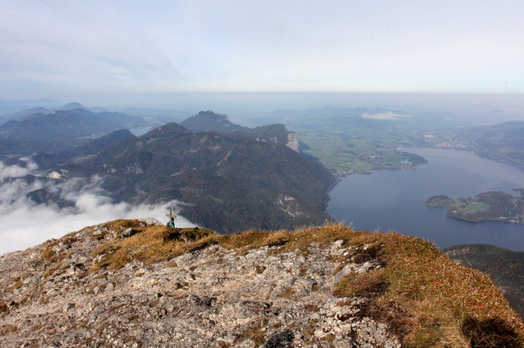 Fast immer hat man jetzt den Blick auf den 13 qkm großen See und auf die umliegenden Berge sowieso. Mal läuft man auf Teerstraßen, mal auf schmalen Uferpfaden. Ein Stück läuft man auch auf dem Damm der ehemaligen Ischler Bahn, die Bad Ischl mit den Ferienorten des Salzkammergutes verband. Auch wenn die Strecke einmal parallel zur Verkehrsstraße verläuft, stört das den Laufgenuss nicht. Die Saison ist vorbei und kaum Verkehr. Auf der anderen Seeseite sieht man den Schafberg, mit 1782 m Höhe auch kein Riese, aber ein unglaublich schöner Aussichtsberg mit Blick bis zum Dachstein und auf insgesamt 13 Seen.
