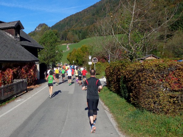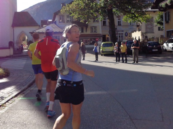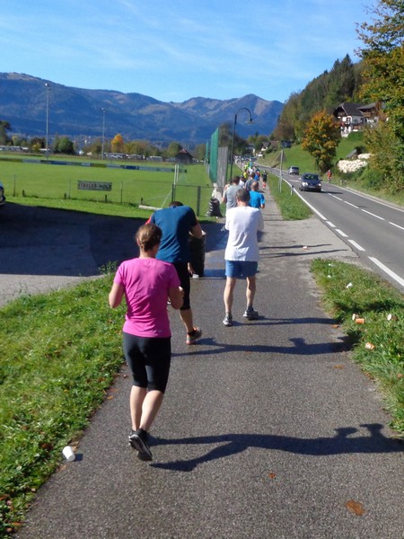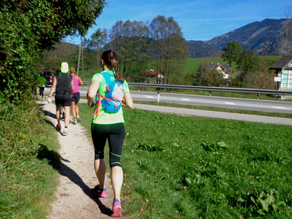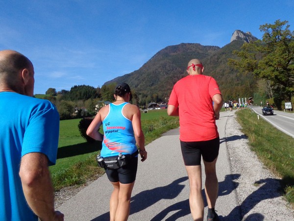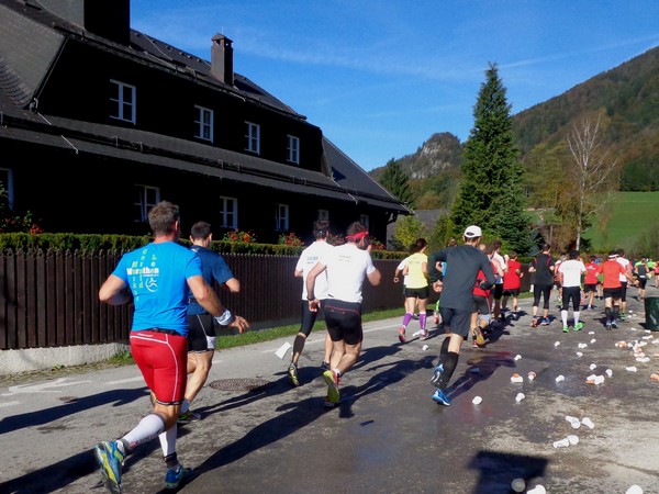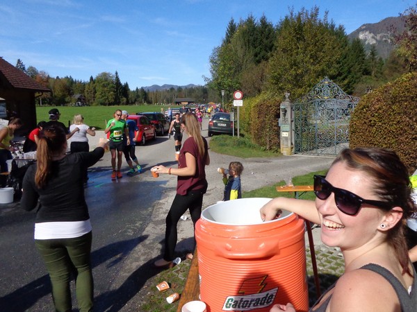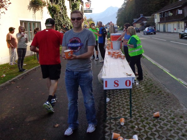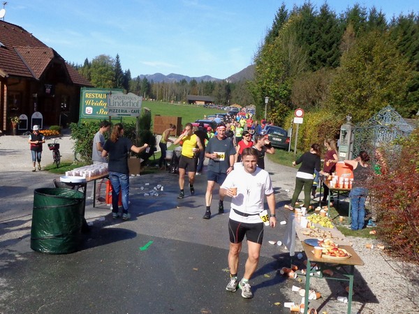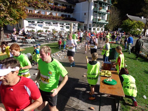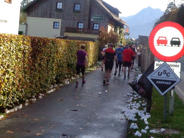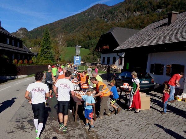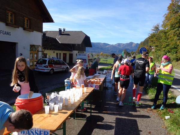 Beim Gamsjaga haben wir noch 13km vor uns und sind damit mehr als die Hälfte gelaufen. Außer Wasser, Iso, Bananen Brot und Äpfeln gibt es sogar Stiegl-Bier, ich begnüge mich mit Iso. Nun verlassen wir bald den Weg neben der Straße, ab in den Wald. Der nächste km verläuft schnurgerade und absolut eben bei idealer Temperatur, in Abersee kommen wir raus. Im Ort werden wir wieder angefeuert, die Sanitäter warten bei ihren Fahrzeugen.