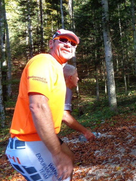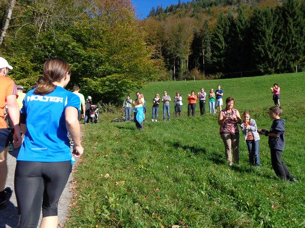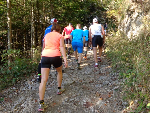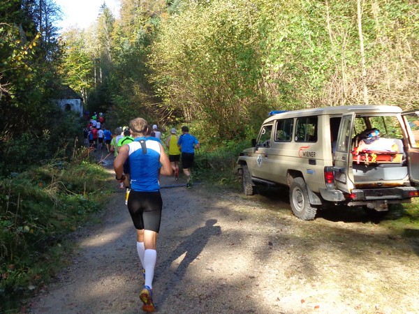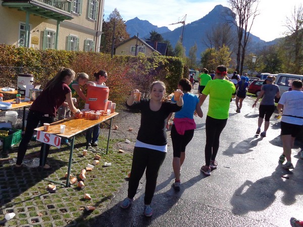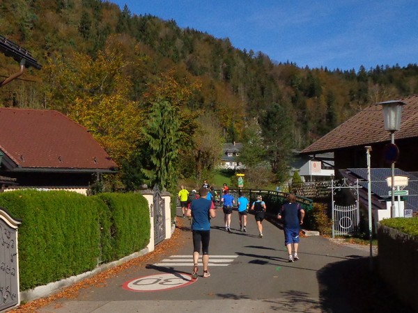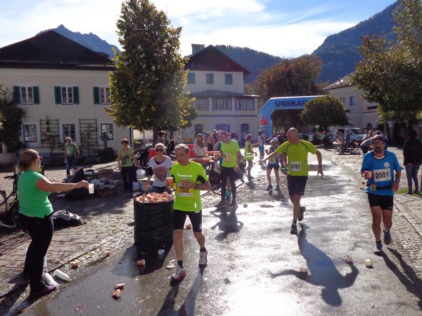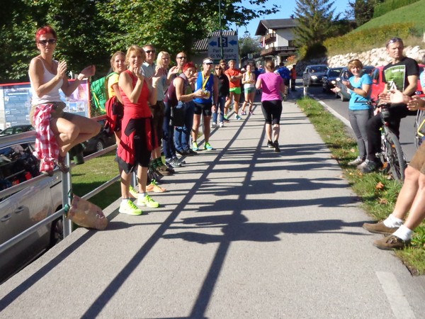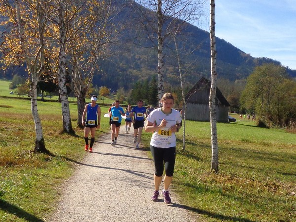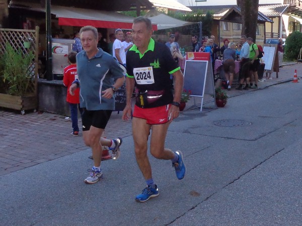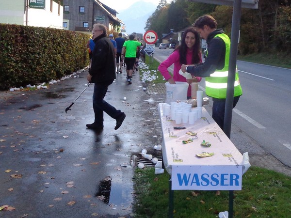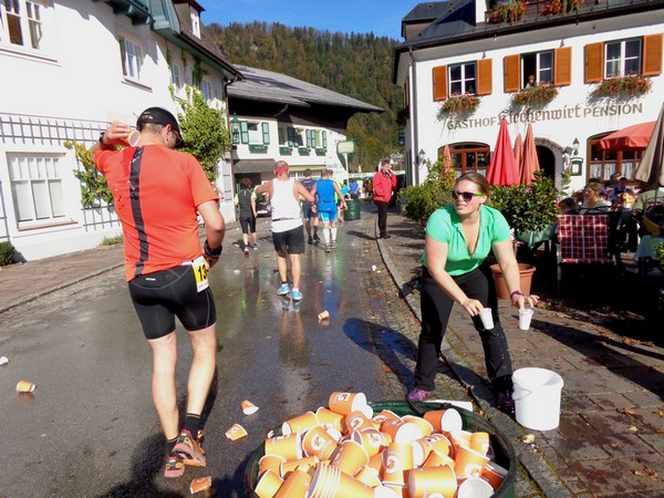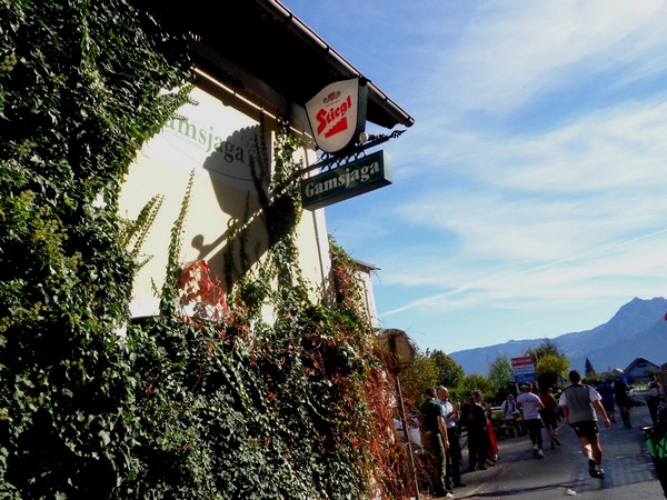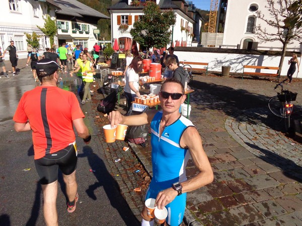 Beim Gamsjaga haben wir noch 13km vor uns und sind damit mehr als die Hälfte gelaufen. Außer Wasser, Iso, Bananen Brot und Äpfeln gibt es sogar Stiegl-Bier, ich begnüge mich mit Iso. Nun verlassen wir bald den Weg neben der Straße, ab in den Wald. Der nächste km verläuft schnurgerade und absolut eben bei idealer Temperatur, in Abersee kommen wir raus. Im Ort werden wir wieder angefeuert, die Sanitäter warten bei ihren Fahrzeugen.
