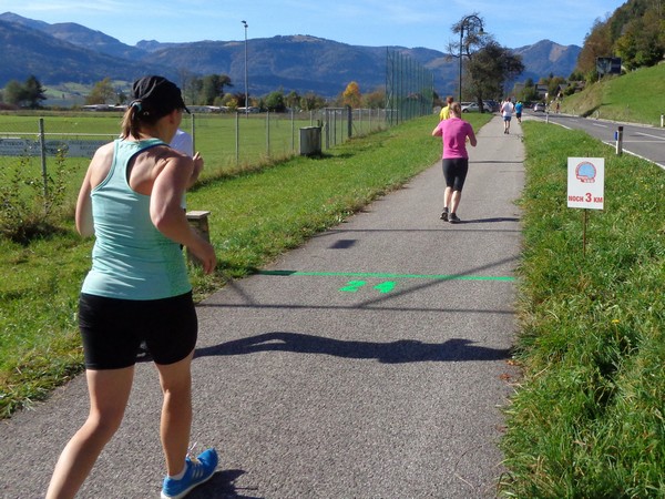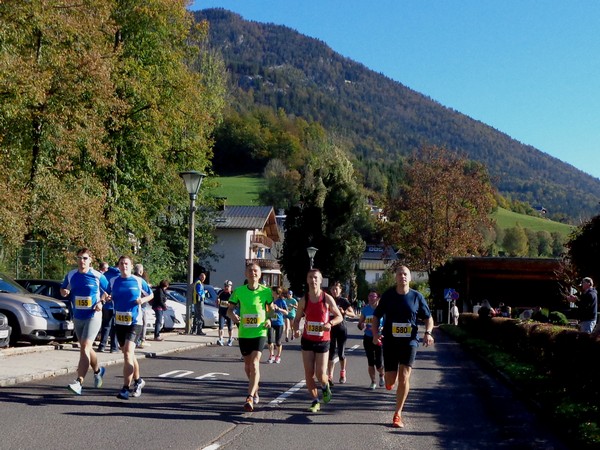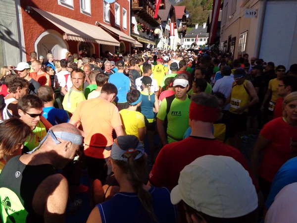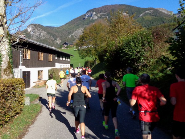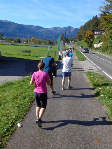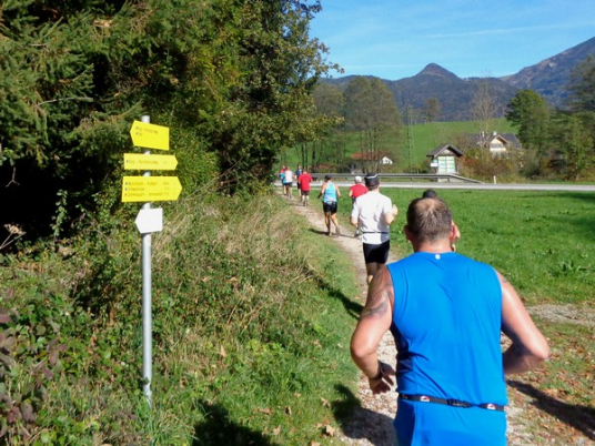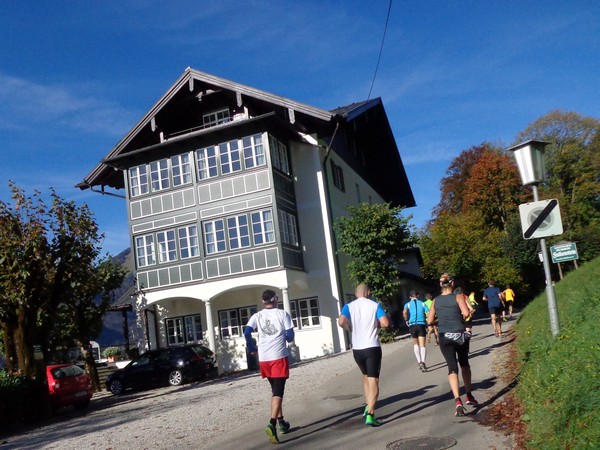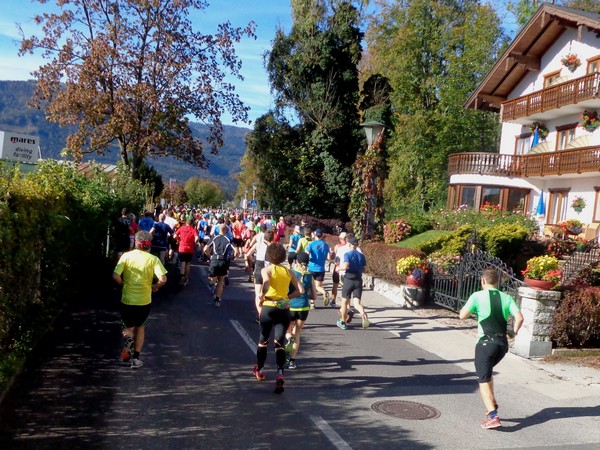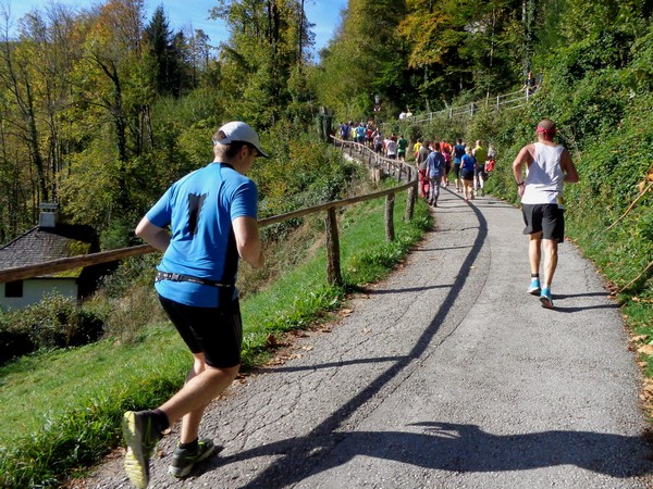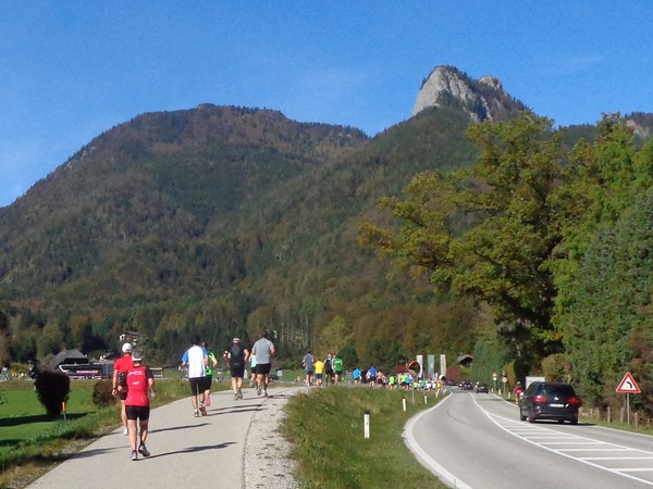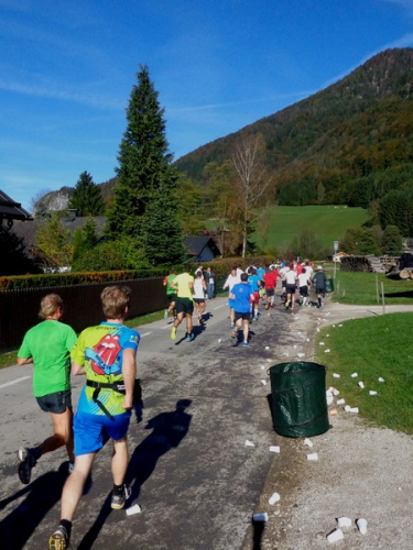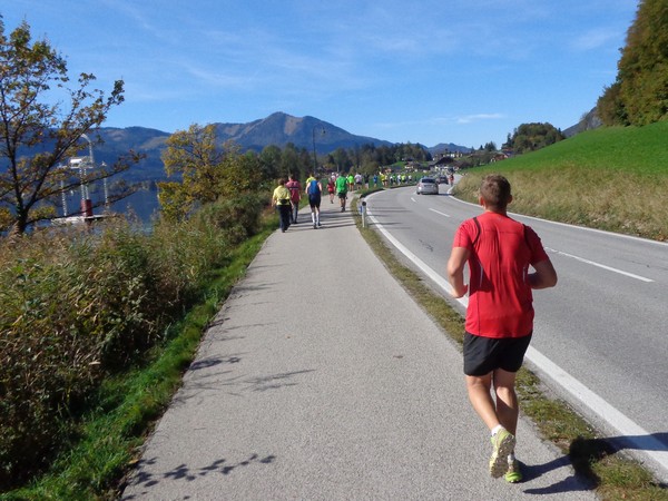 Bumm, ein Knall ertönt, und dann noch einer. Damit wird signalisiert, dass der erste Läufer oben am Falkenstein angekommen ist. Die ersten 3km geht es weitgehend flach dahin, den Wolfgangsee zu unserer Linken, den Schafberg rechts von uns. Gut für die Anwohner, die Straße ist bald zu Ende, so gibt es keinen Durchzugsverkehr. Hier muss man her wollen, zufällig kommt man nicht hierher.