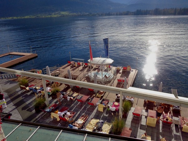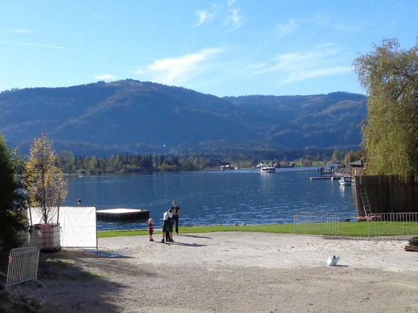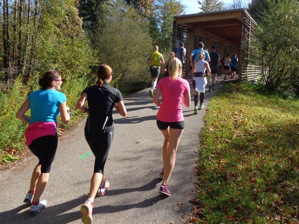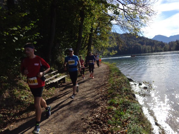 Einen km geht das so, dann sind wir unten, unmittelbar am Ufer des Sees aber immer noch im Wald. Ein Halbmarathon steht uns noch bevor. So, jetzt einmal locker laufen um die Oberschenkel zu entspannen. In Winkl beim Hotel Fürberg wird Stimmung gemacht, außerdem werden wir wieder gelabt. Dieses Hotel könnte man auch mit dem Linienschiff erreichen.