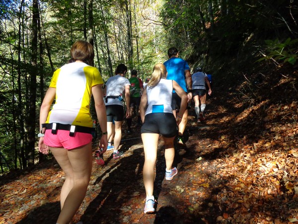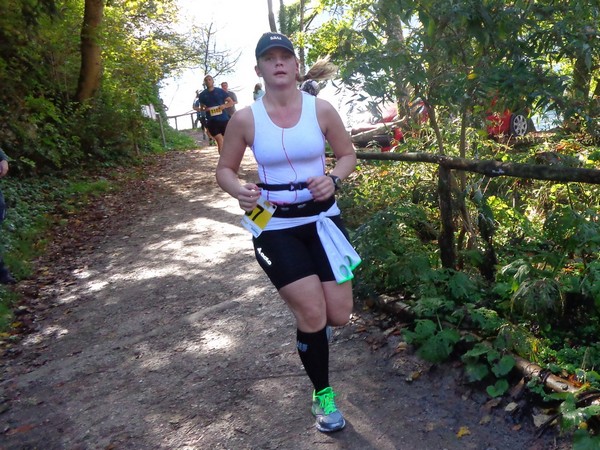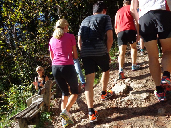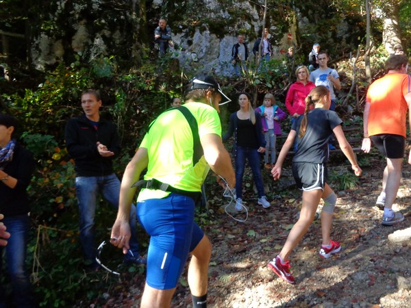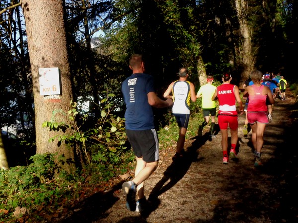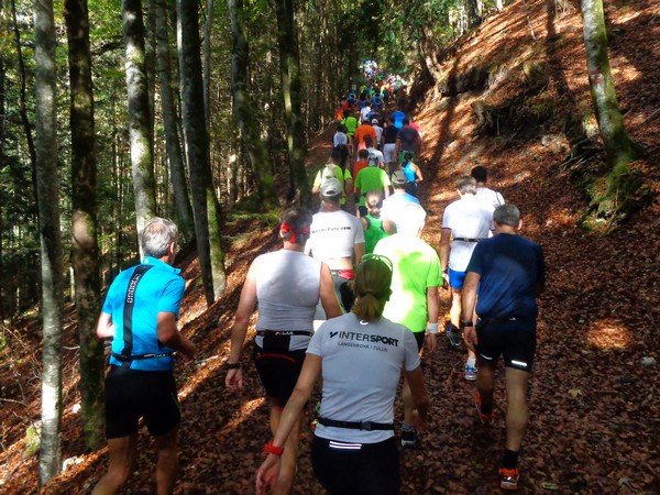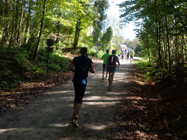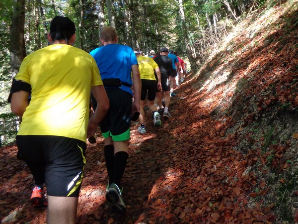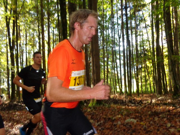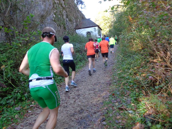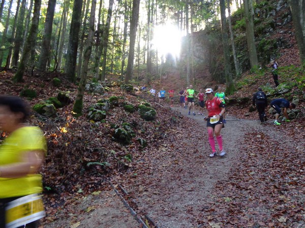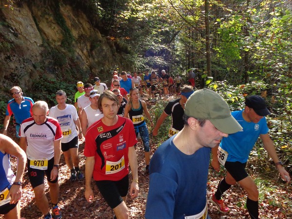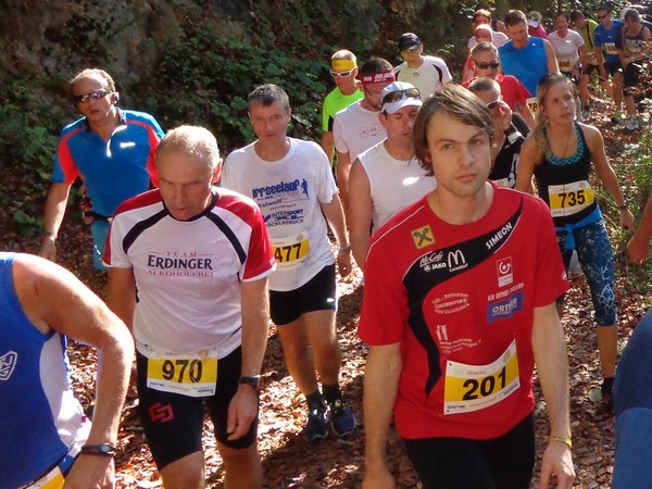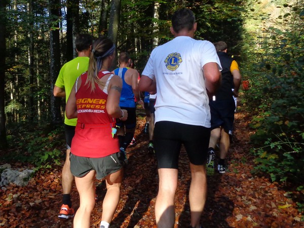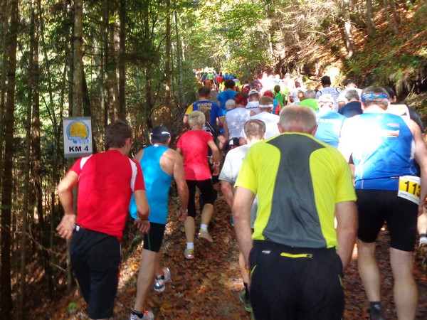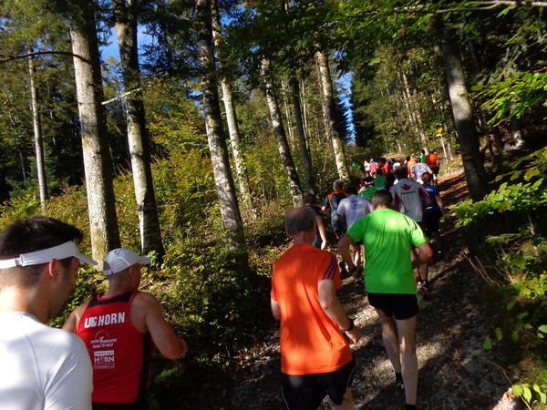 Für uns Läufer bedeutet das Ende der Straße, es geht rauf auf den Falkenstein, das ist die Haifischflosse im Streckenprofil. Vorher gibt es aber noch eine Stärkung. Eine breite Läuferschlange sind wir. Voriges Jahr, als hintergründiger Marathoni, hatte ich hier reichlich Platz. Warm und kurz ist der Anstieg in der Sonne, im Wald geht es dann deutlich kühler weiter. Auf mit Buchenlaub bedecktem Waldweg geht es hoch, viele Bekannte strömen an mir vorbei, blicken nicht nach rechts und links, sie haben es eilig.
