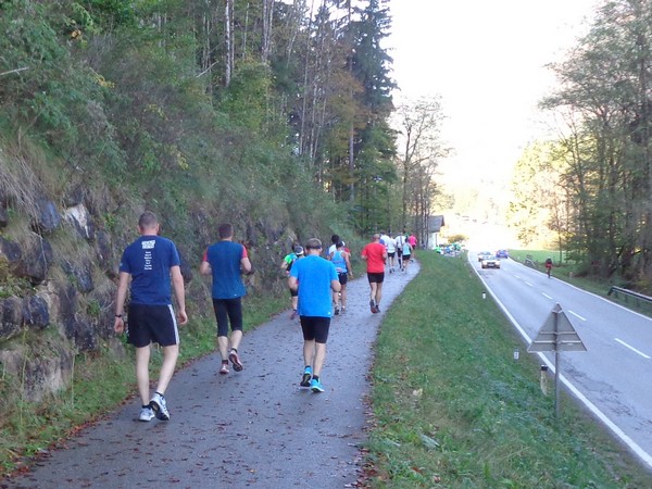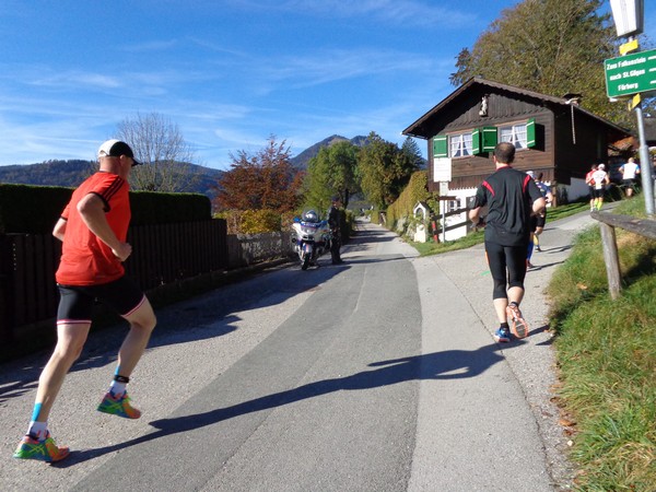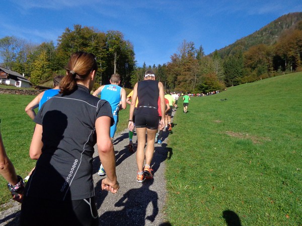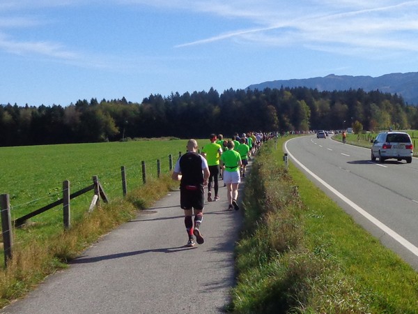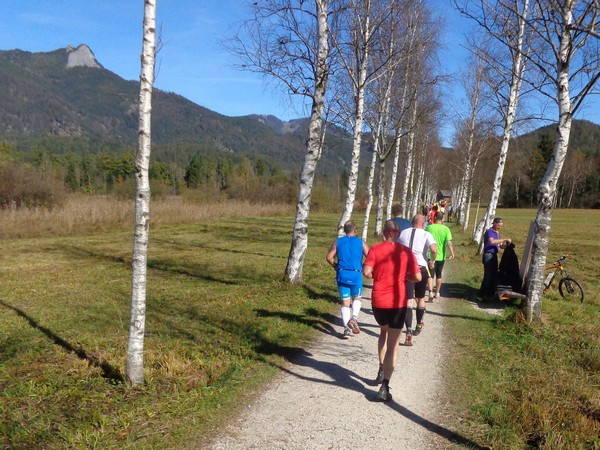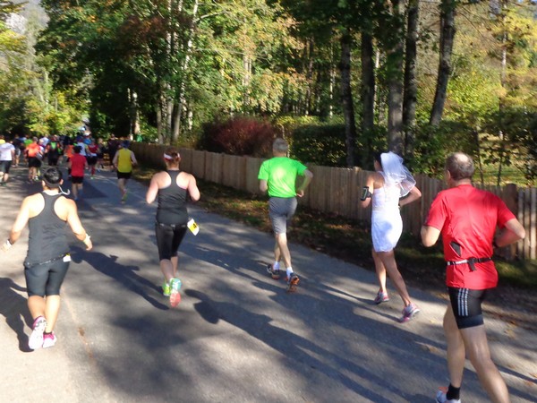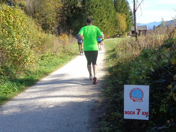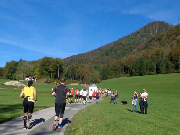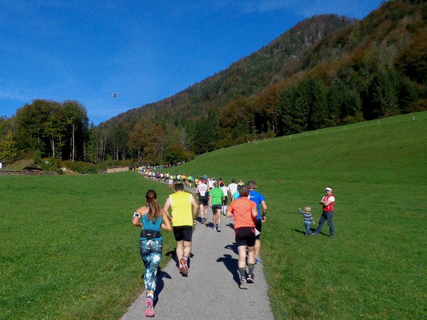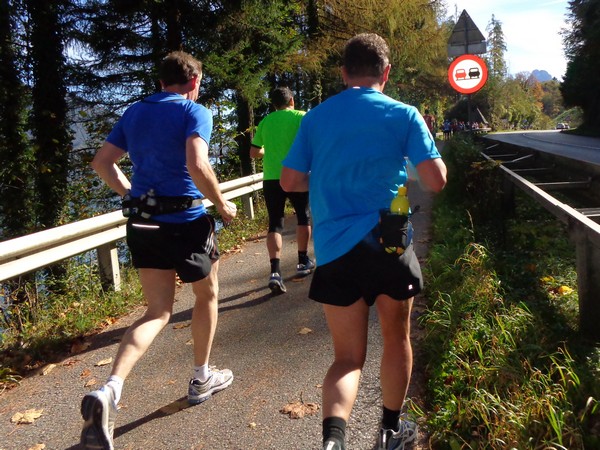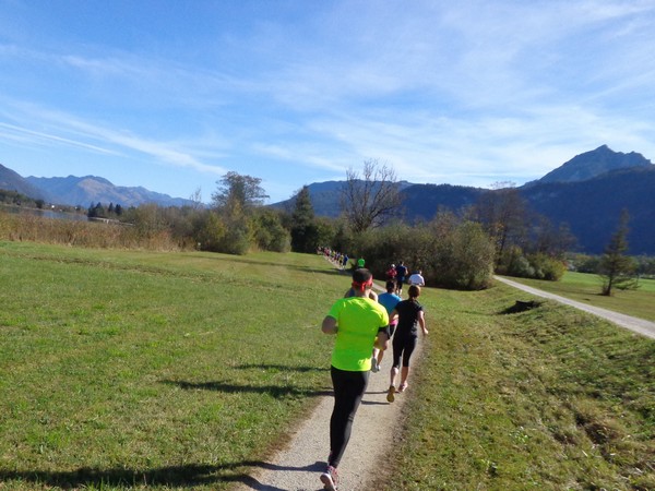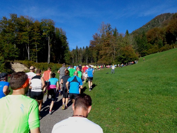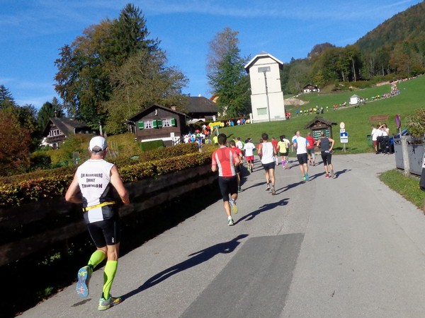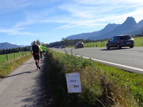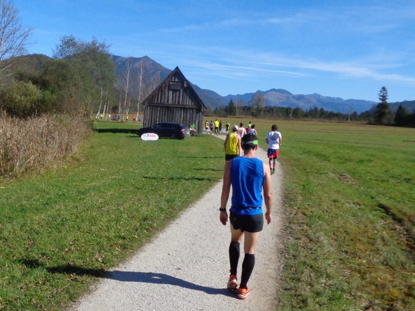 Heuer ist es für mich ein neues Lauferlebnis, weil so viele andere unterwegs sind. 2013 am Ende des Marathonstarterfeldes gab es da und dort noch vereinzelt Läufer, heuer laufe ich im Pulk und habe abgesehen von der schönen Landschaft somit viel mehr Fotomotive. Wie ich hören kann, kommen viele von weit her, alle möglichen Sprachen kommen mir unter. Ungarisch, polnisch, englisch, südtirolerisch …