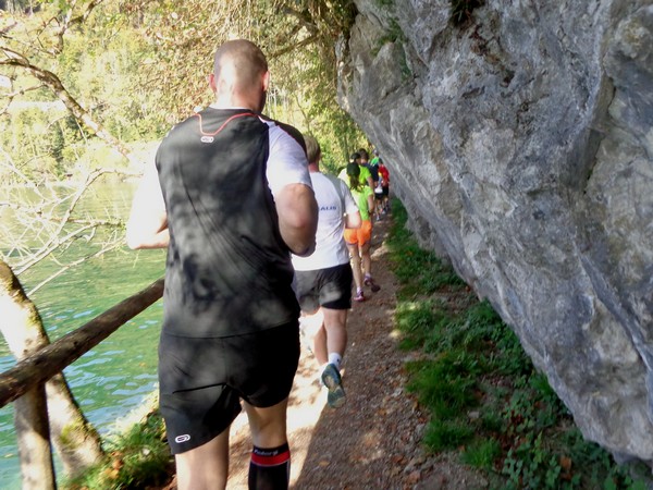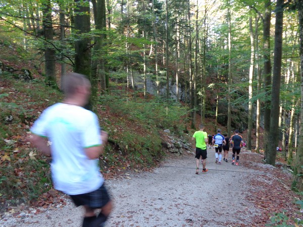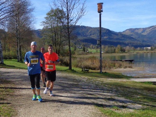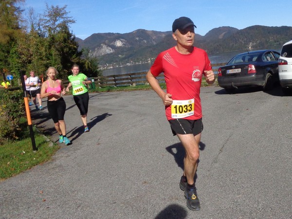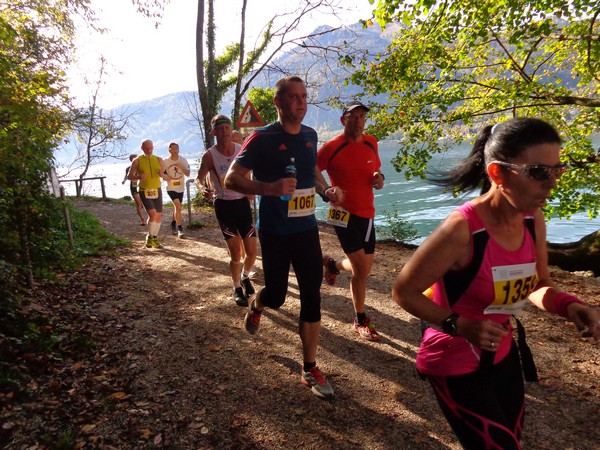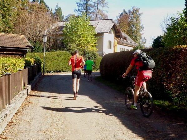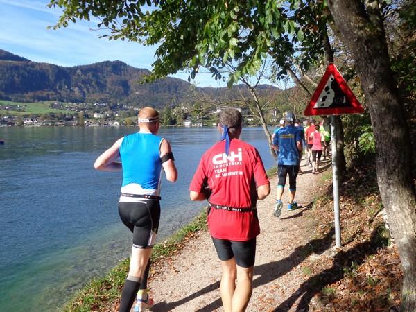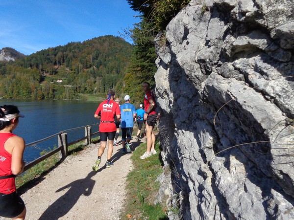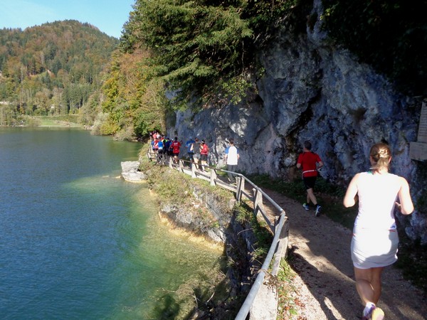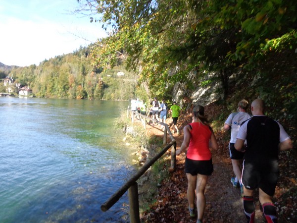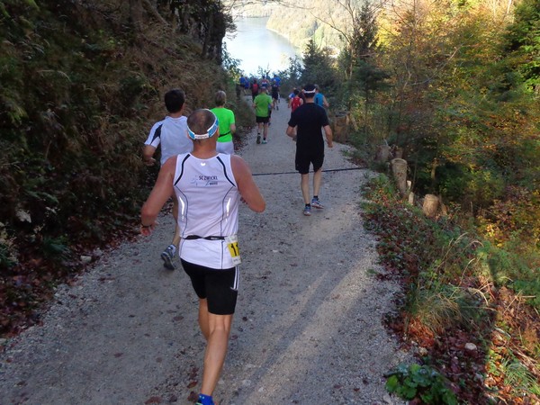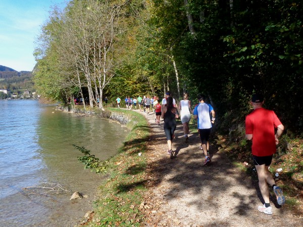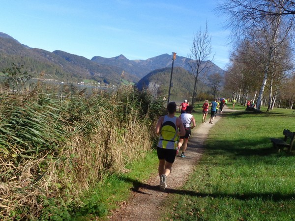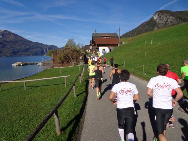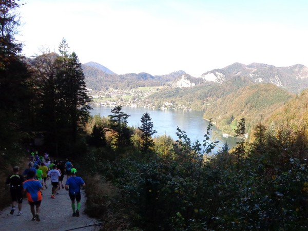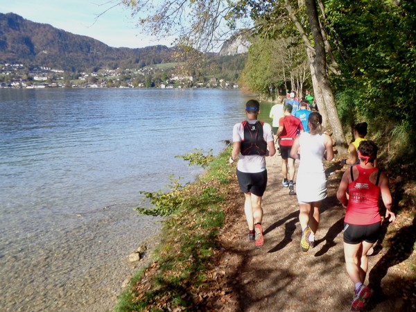 Die nächsten 2km folgt der für mich schönste Streckenabschnitt. Links das klare Wasser des Sees, Blick auf St. Gilgen, rechts Wald und Felswände, teilweise überhängend. Nun sind auch die Tempounterschiede der LäuferInnen nicht mehr so groß, daher gibt es auch kein Gedränge.