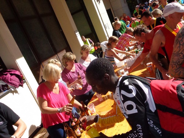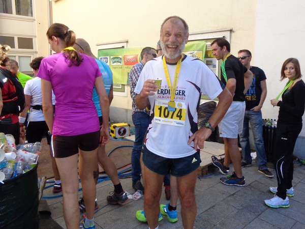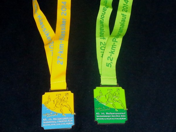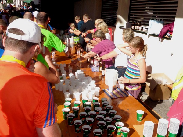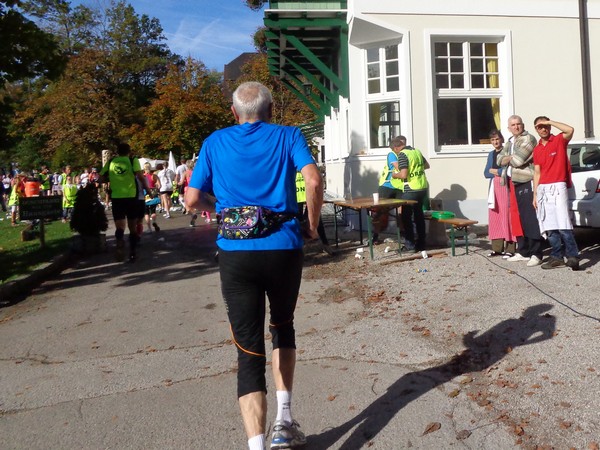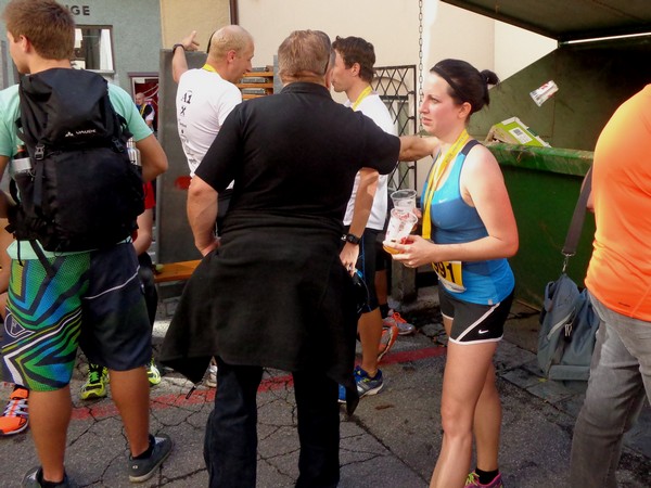 Nachdem ich noch einige Fotos gemacht habe, bekomme ich meine Medaille. Jeder Bewerb hat eine unterschiedlich gefärbte Medaille und sein spezielles Medaillenband. Evi hat ein trockenes Shirt für mich, viele Bekannte treffe ich ihm Ziel. Als ich mich an der Ziellabe stärke, es gibt Müsli, Bananen, klare Suppe und Bier, höre ich, dass der 3-Stunden-Schrittmacher gerade seine Meute ins Ziel gebracht hat.