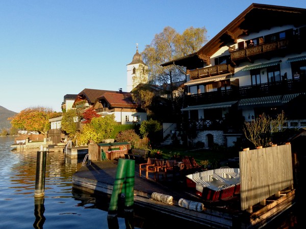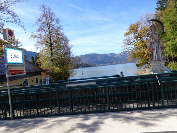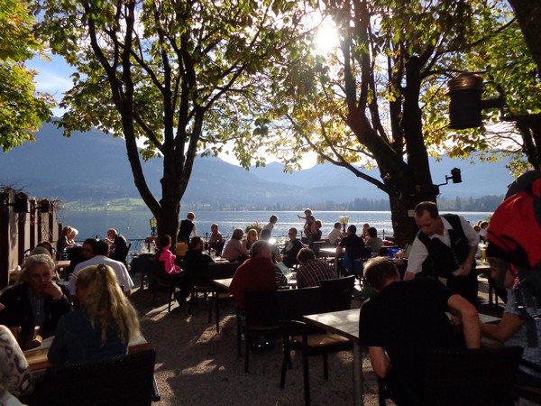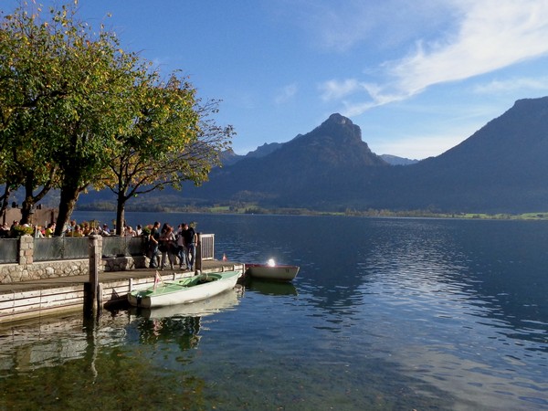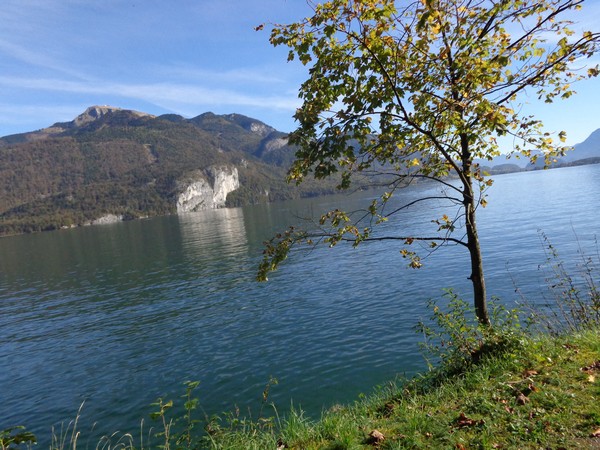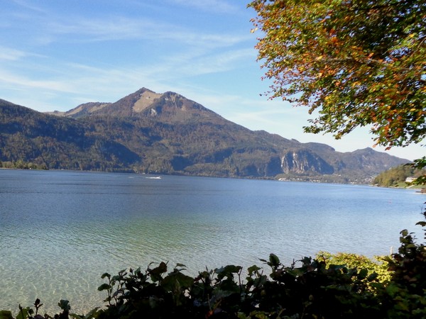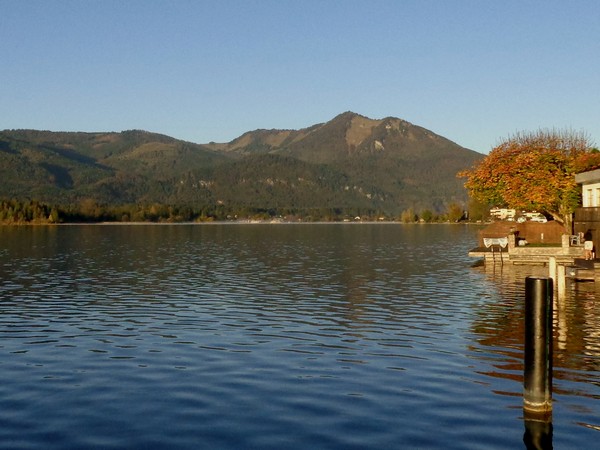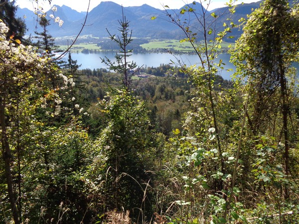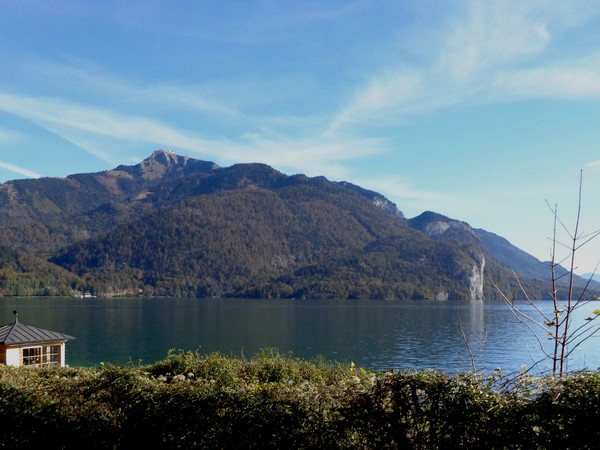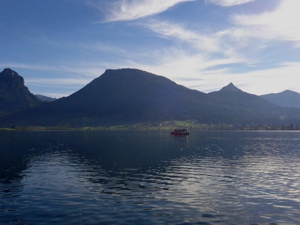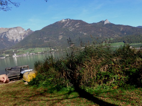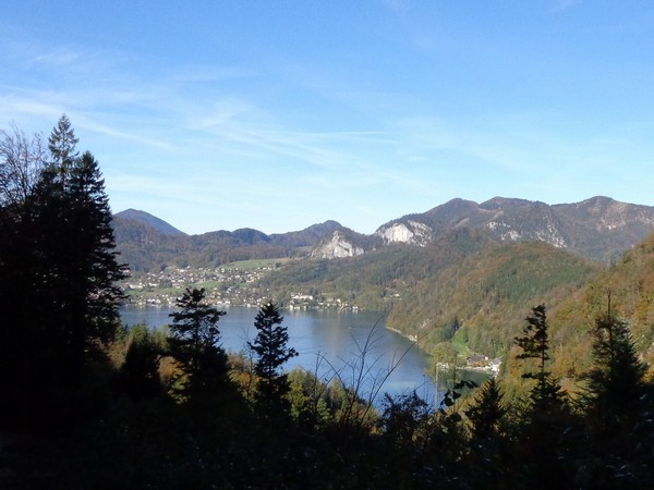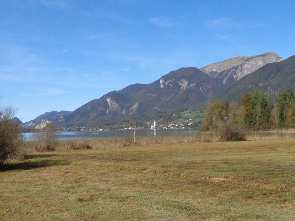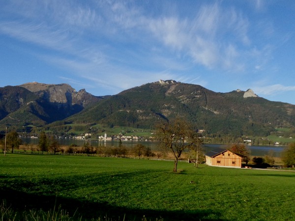 Uns erschließt sich nun der Blick auf den Falkenstein, wo wir vorhin rüber sind, überragt vom Schafberg. Dieses Bergmassiv wird nun schön ausgeleuchtet. Unübersehbar der Felsabbruch, der im Sommer für das 27m-Cliff-Diving verwendet wird. Rechts das Zwölferhorn, mit der Seilbahn ist man im Nu im Hochgebirge. Wir aber bleiben am See, nun 3km an der Bundesstraße entlang auf einem Radweg, ein paar Höhenmeter sind da schon versteckt, aber nichts Steiles mehr.
