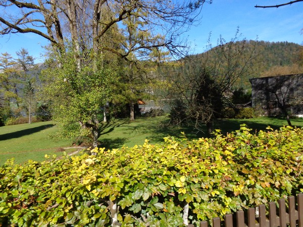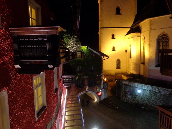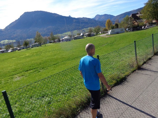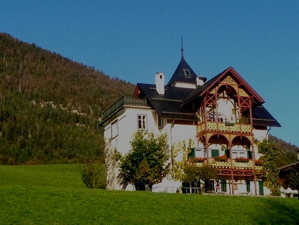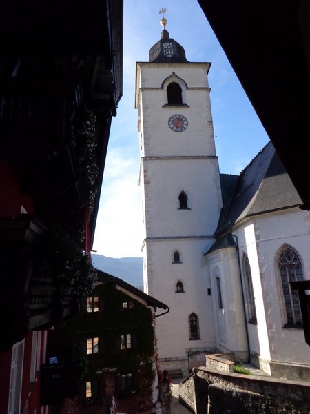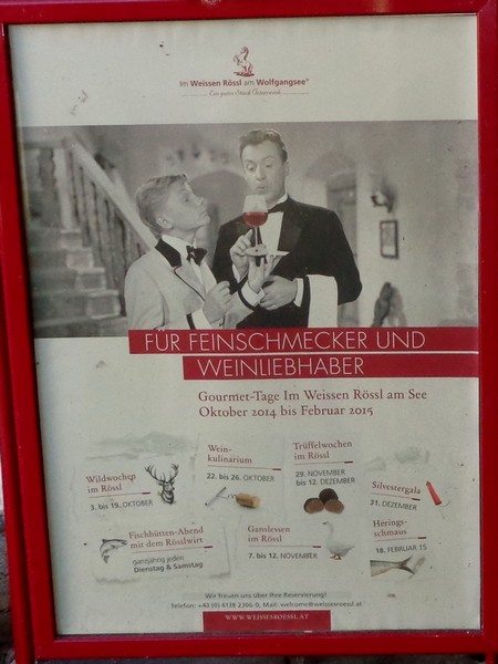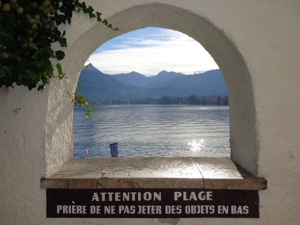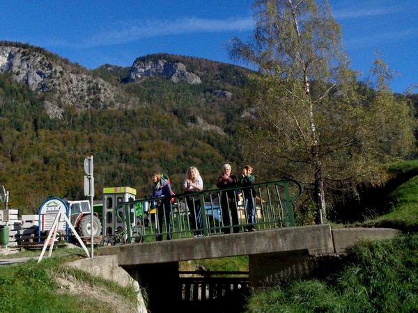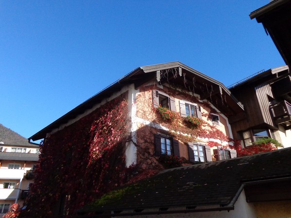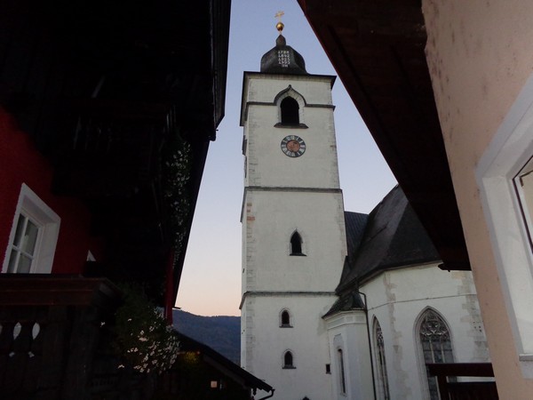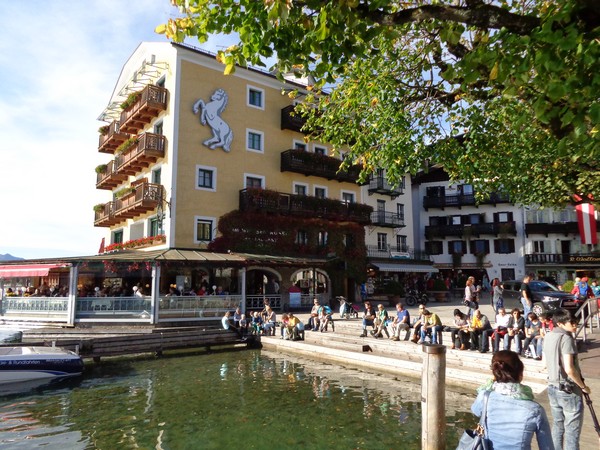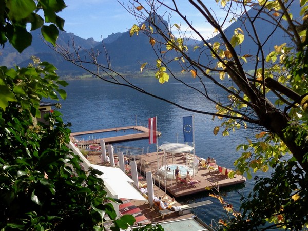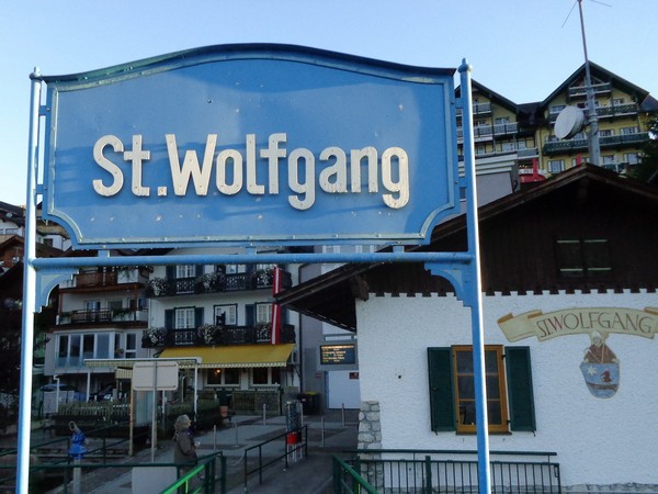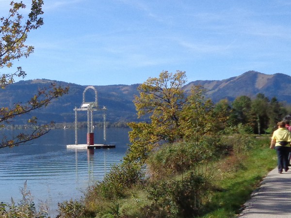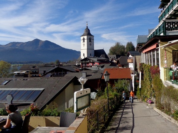 Uns erschließt sich nun der Blick auf den Falkenstein, wo wir vorhin rüber sind, überragt vom Schafberg. Dieses Bergmassiv wird nun schön ausgeleuchtet. Unübersehbar der Felsabbruch, der im Sommer für das 27m-Cliff-Diving verwendet wird. Rechts das Zwölferhorn, mit der Seilbahn ist man im Nu im Hochgebirge. Wir aber bleiben am See, nun 3km an der Bundesstraße entlang auf einem Radweg, ein paar Höhenmeter sind da schon versteckt, aber nichts Steiles mehr.