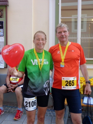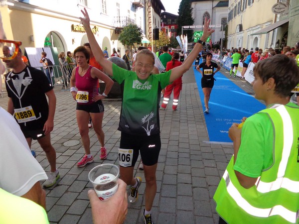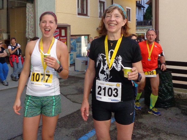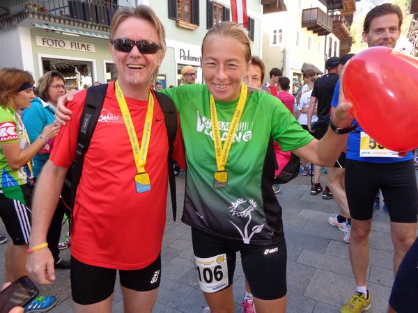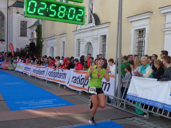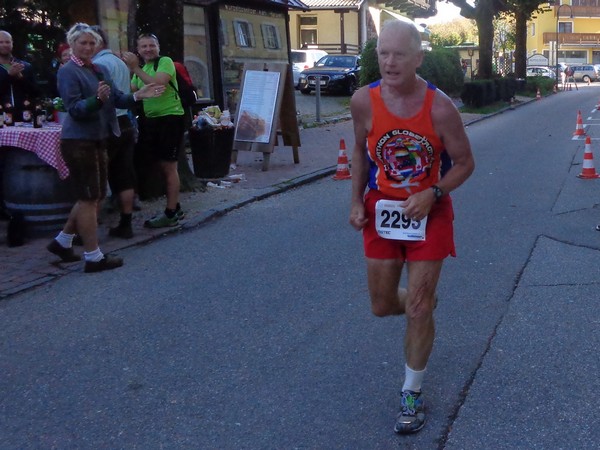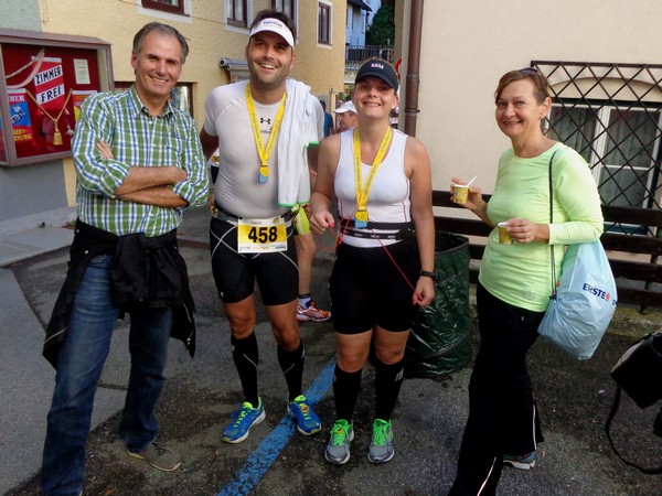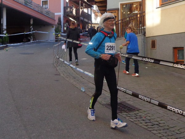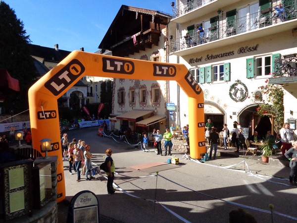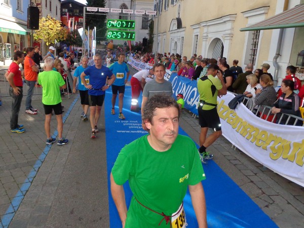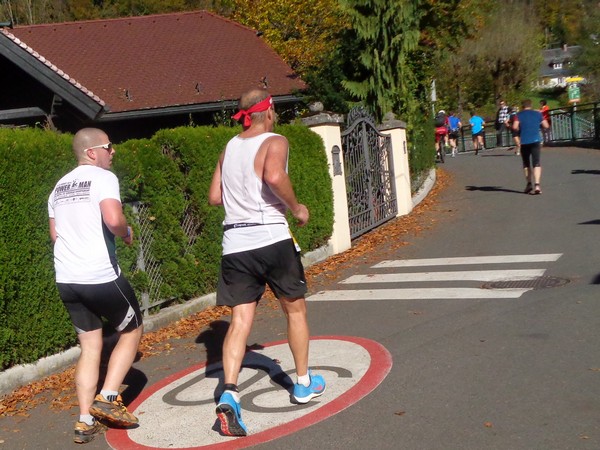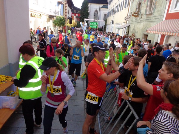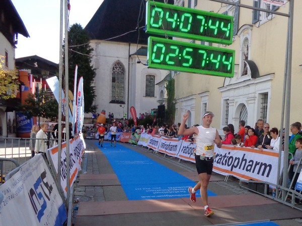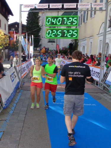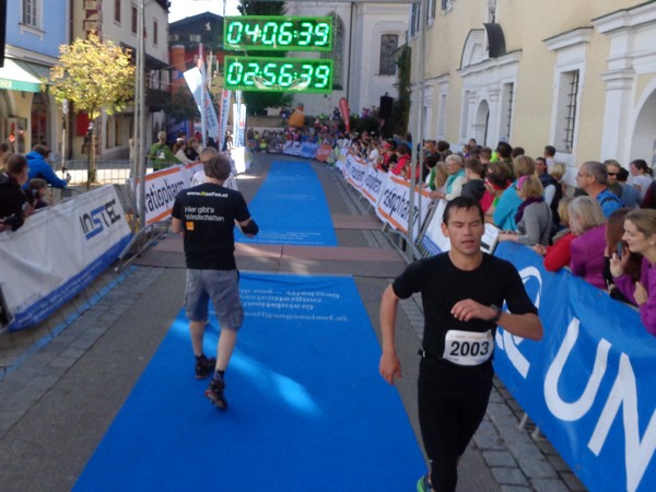 Kurz darauf sehe ich Abby wieder, die hat längst ihren Marathon beendet (2. Dame) und ist bester Laune. Ab jetzt sind es nur mehr ein paar hundert Meter, und diese bergab, vorbei am Hotel Peter. Eine Linkskurve und es geht steiler bergab, Birgit ruft meinen Namen, ich laufe unter dem Bogen eines lokalen TV-Senders durch, den einige bereits für das Ziel halten. Zwischen Hotel „Weißer Bär“ und Hotel „Schwarzer Hirsch“ durch, rechts ums Eck und ich bin im Ziel, um 63 Sekunden(!) schneller als vor acht Jahren bei meinem Debüt hier.