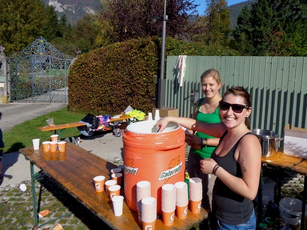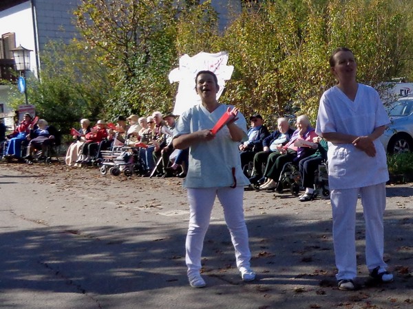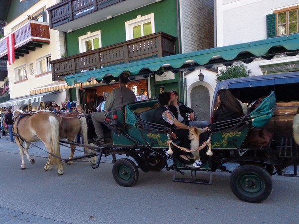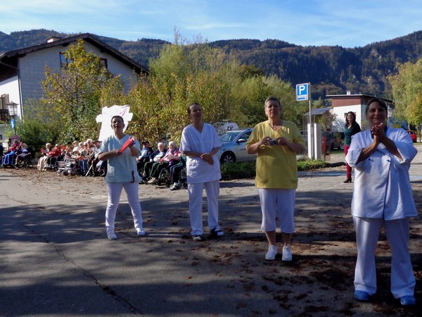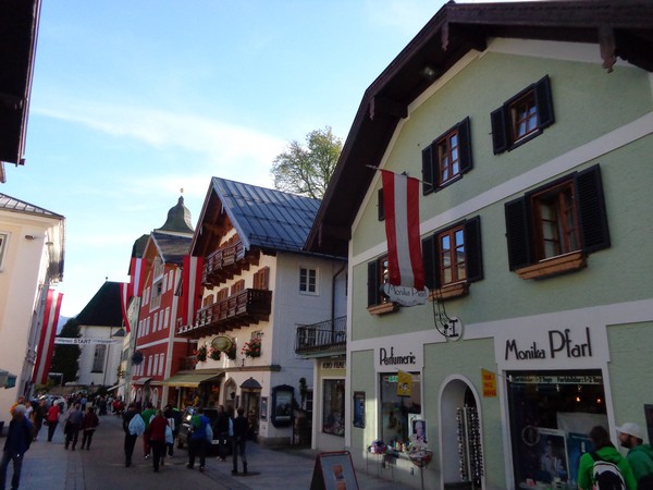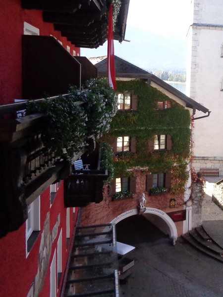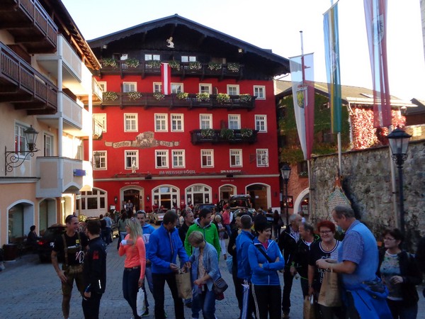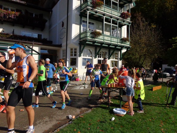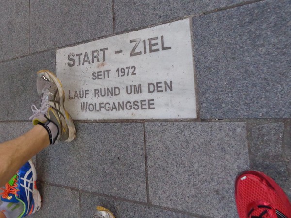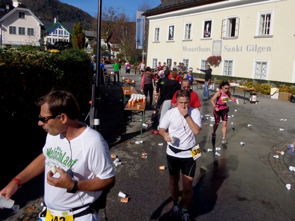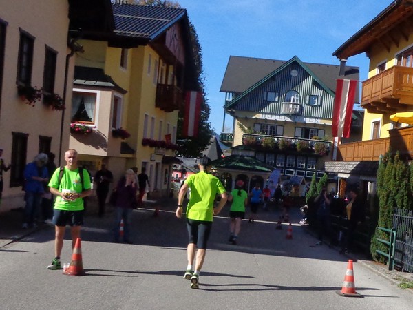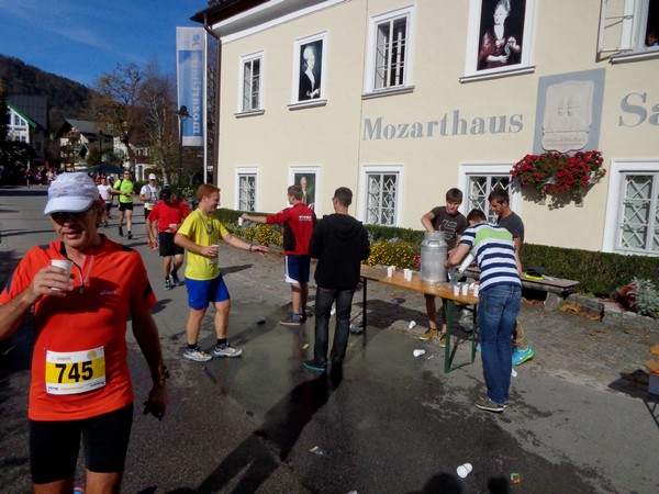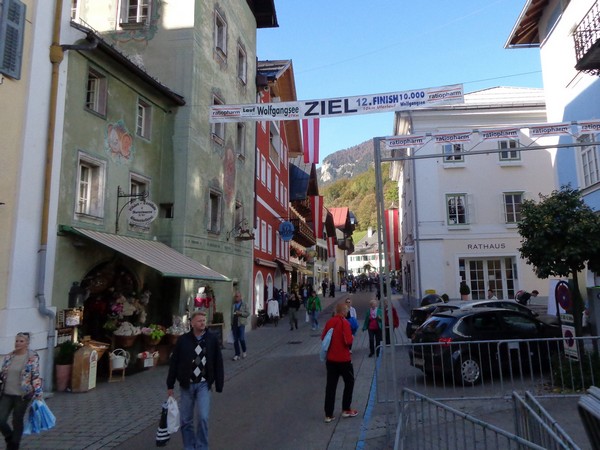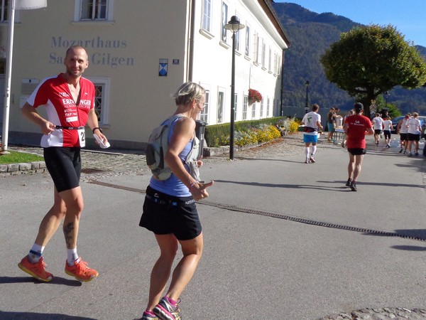 Kurz vor St. Gilgen weitet sich der Weg, weiterhin am Ufer entlang geht es rein in den Ort. Das Personal eines Pflegeheims samt den Pfleglingen hat Aufstellung genommen und feuert uns an. Im Ort treffen Christina und Kurt auf mich, sie machen heute den Marathon. Zuletzt haben wir uns beim Abendessen nach dem Jungfrau-Marathon getroffen. Vor dem Mozarthaus gibt es schon wieder eine Verpflegungsstelle und einen Platzsprecher, der Kontakt mit uns Sportlern aufnimmt.