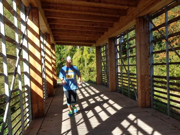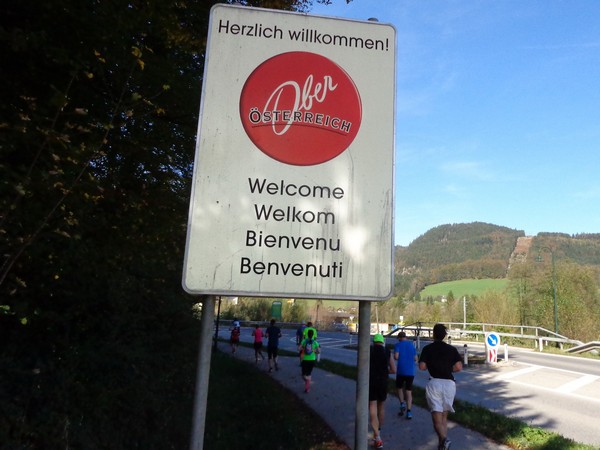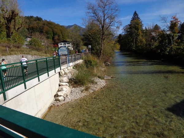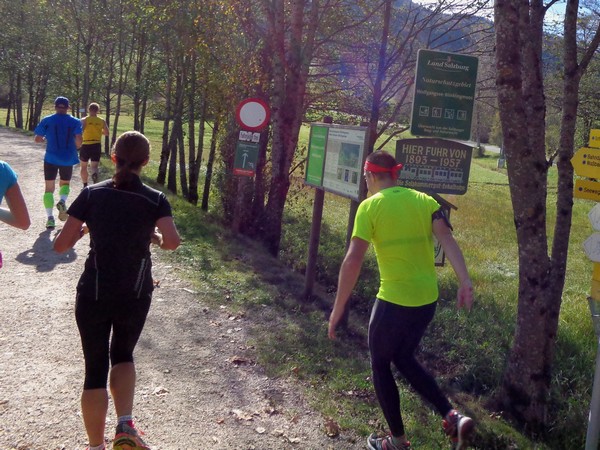 Auf einer neuen überdachten Holzbrücke überqueren wir den Zinkenbach und gelangen wieder in ein Wäldchen. Auf dieser ehemaligen Bahntrasse fuhr bis 1957 eine Schmalspurbahn zwischen Salzburg und Bad Ischl. Von dieser Trasse sollten wir im weiteren Verlauf immer noch was haben. In Gschwendt war der Start des 10km-Laufs, 1.155 LäuferInnen waren am Start. Wir bekommen zu essen und zu trinken und ein freundliches Lächeln. Außerdem wird die Zwischenzeit genommen. Ich darf mir nicht zuviel Zeit lassen, ich will im Ziel sein, wenn Susanne ihren 100. Marathon beendet.