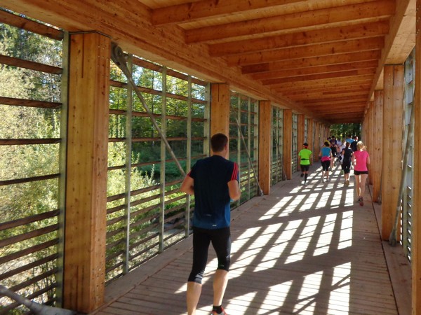 Nun geht es weiter auf der Trasse durch das Naturschutzgebiet Blinklingmoos, fast im Gänsemarsch. Wenn man beim Überholen die Trasse seitlich verlässt, gibt der Boden nach. Leopold kommt vorbei, er ist auf seinem 102. Marathon unterwegs, wir zwei treffen uns auch immer wieder.