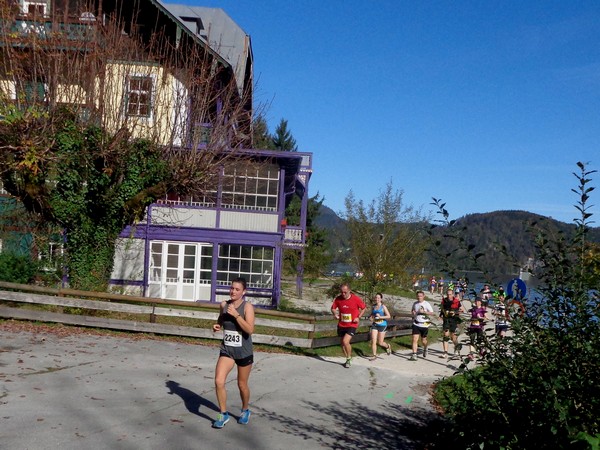 „Chariots of Fire“ ertönt vor dem Start, 70min nach den Marathonis in Bad Ischl starten wir hier. Um den Falkenstein rauf möglichst viele Läufer knipsen zu können, starte ich am Ende des ersten Blocks. 1.600 LäuferInnen sind nun auf der Seerunde. An der Schafbergbahn (1893) vorbei, sie überwindet 1.190 Höhenmeter. Die Aussicht vom Schafberg oben muss heute atemberaubend sein. Schon sind wir im Bundesland Salzburg. Weitere schnelle Marathonis sind bereits unter uns, eine davon aus Omaha. Abby, sie läuft im kurzen Brautkleid mit Brautstrauß. Die Amis sehen Marathons grundsätzlich entspannter als die Europäer, Ausnahmen gibt es da und dort.