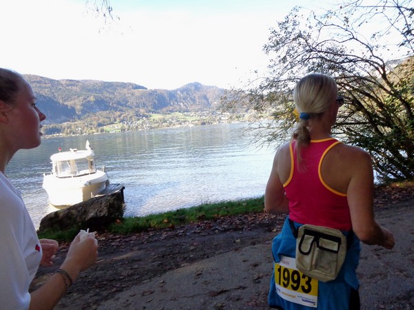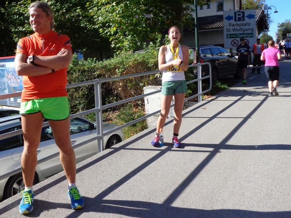 und ein paar freundliche Höhenmeter. Kurz bevor wir wieder an den See kommen, gibt es die letzte Labestelle. An der Straße entlang geht es nun 3km rein nach St. Wolfgang, überraschend wenig Verkehr auf der Straße neben uns. Am Campingplatz geht es im Schatten noch leicht rauf, hier halten einige Ausschau nach ihren Angehörigen. So wie Martina, die längst die 27km beendet hat und hier auf ihre Marathon laufende Mutter wartet.