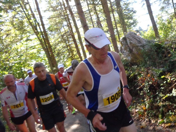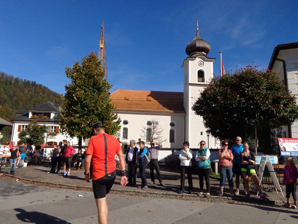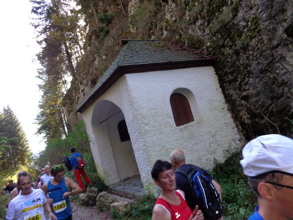 Kurz geht es steil bergab, an einer Kapelle vorbei, dann fast flach über eine Lichtung, an deren linkem Rand die Falkensteinkirche steht, km5. Bald öffnet sich der Blick auf St. Gilgen am westlichen Ende des Wolfgangsees. Noch aber sind wir hoch oben. Richtig steil geht es nun runter. Für mich faszinierend, in was für einem halsbrecherischem Tempo hier runtergelaufen wird. Offenkundig ist nicht immer jeder Herr seines Tempos. In kurzen Abständen stehen aber die Sanitäter bereit.
