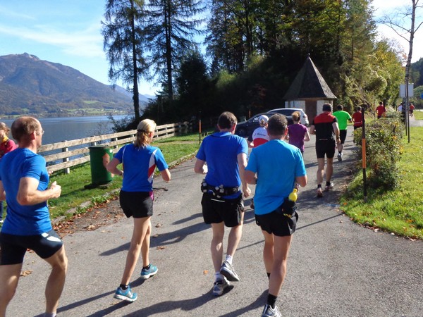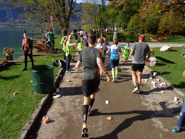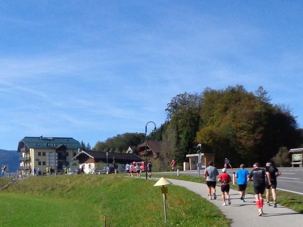 Vorbei an Schilf und Birken, im Sommer ist hier ein Badeplatz. Am gegenüber liegenden Ufer leuchtet die Kirche von St. Wolfgang herüber. Sie gibt einen schönen Hintergrund für die Streckenfotografen. Ich freue mich schon auf die Labestelle in Strobl, Evi ist da gestartet, mit ihr über 400 weitere LäuferInnen über die 5,2km Panoramastrecke. In Strobl gibt es alles, da was das Herz begehrt, für mich zwei Becher Iso.