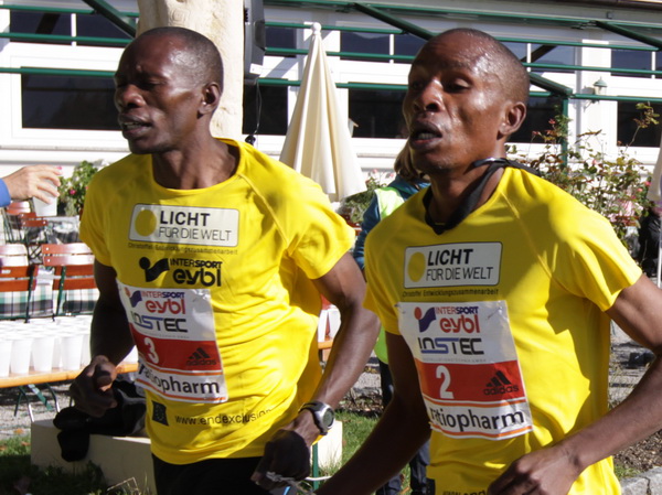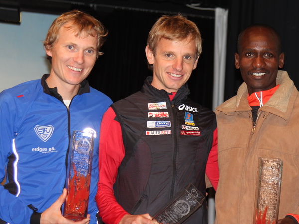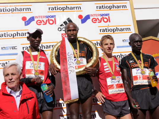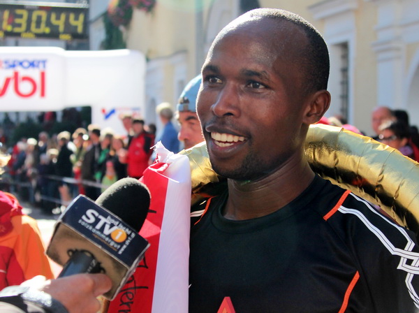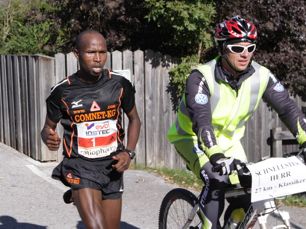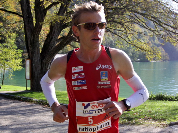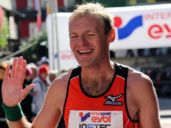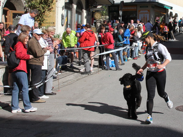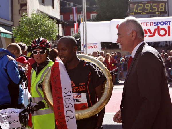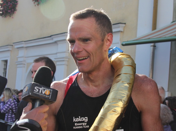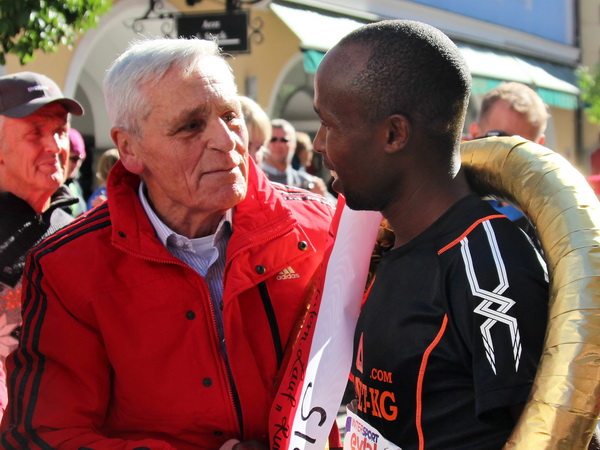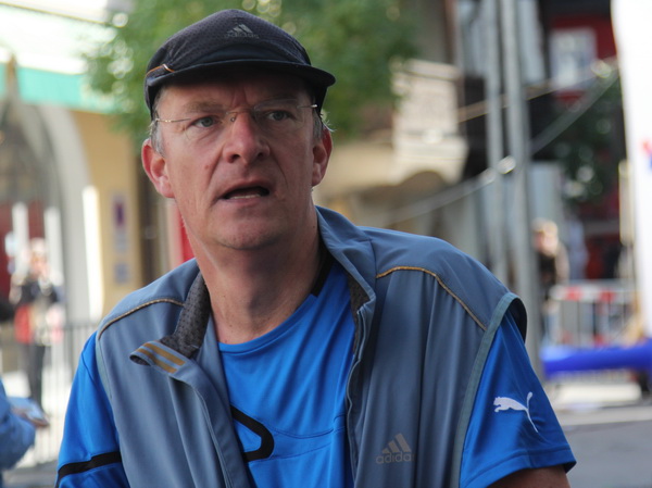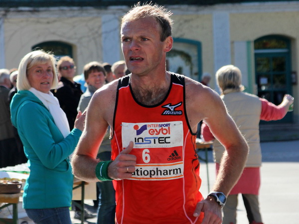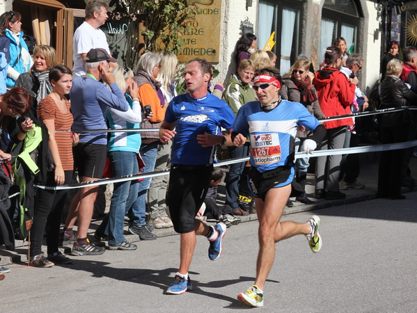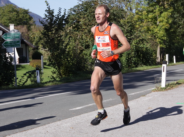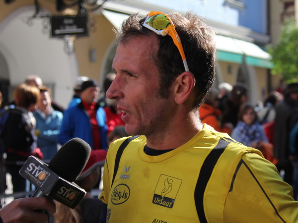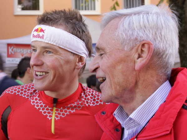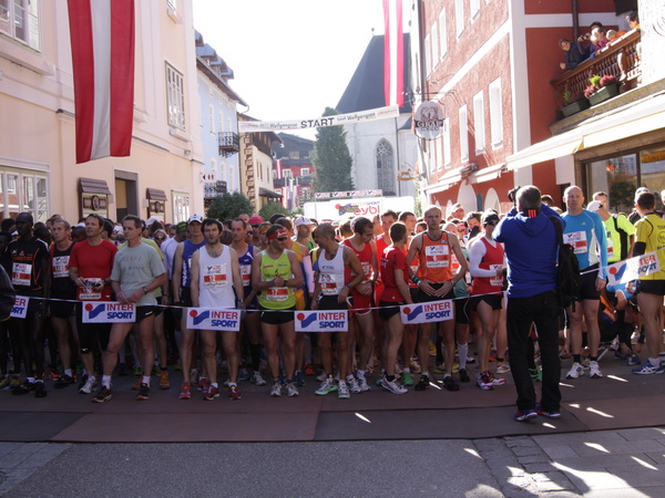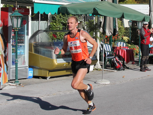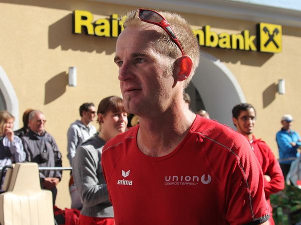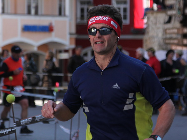 Gleich vor der Pfarrkirche St. Sigismund hat Peter Wundsam seinen Info-Point aufgebaut. In Österreichs Laufszene ist er bekannt wie ein bunter Hund. Aber was heißt hier „wie“, er ist einer. Was der schon alles gemacht hat! Läuferisch ragen sein 12 Staatsmeistertitel heraus und die Qualifikation zu vier Europameisterschaften. Dass er wegen anderer Prioritäten seine Marathonzeit nicht unter 2:20 drückte, wurmt ihn noch heute. In der ewigen nationalen Bestenliste des Wolfgangseelaufes wird er übrigens heute von Markus Hohenwarter wegen ein paar Sekunden auf Platz 7 verdrängt.