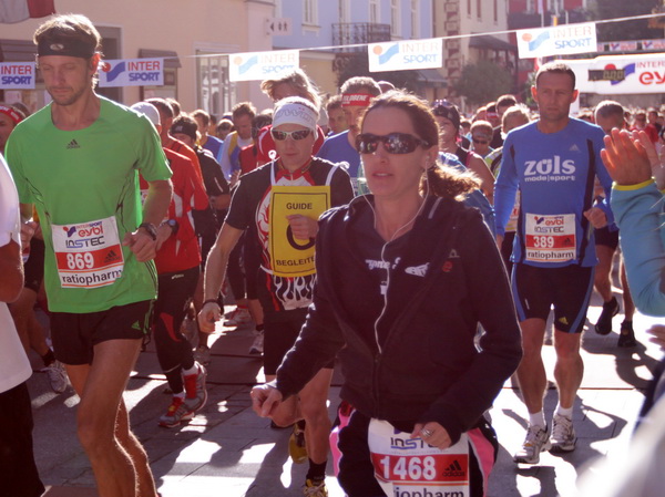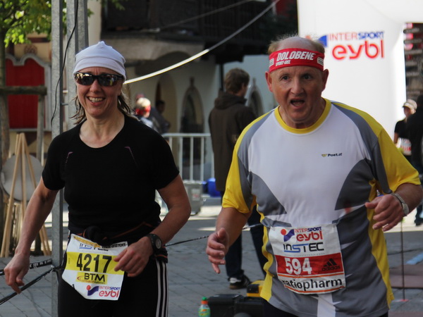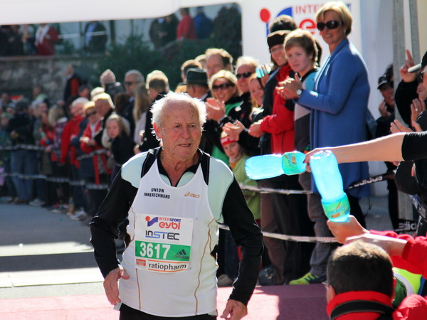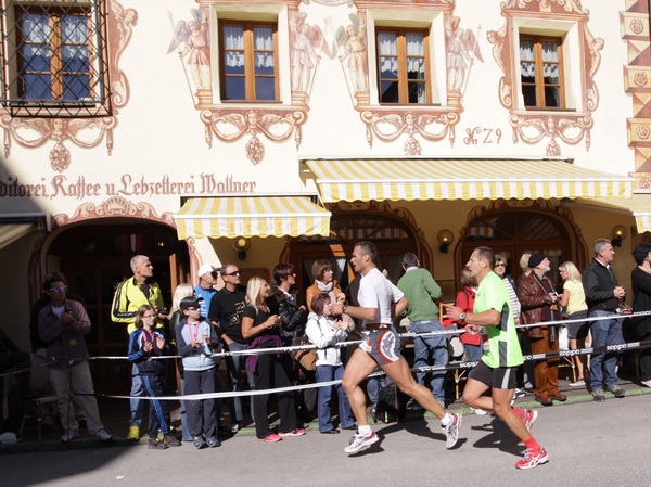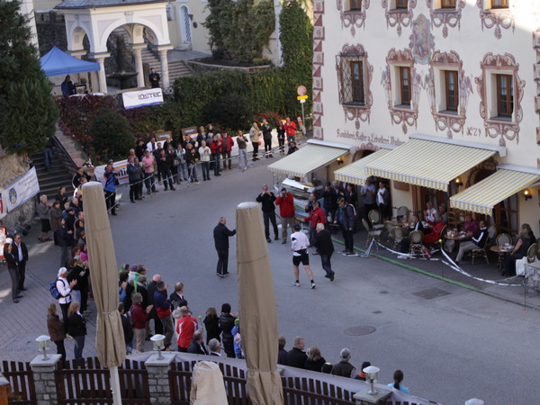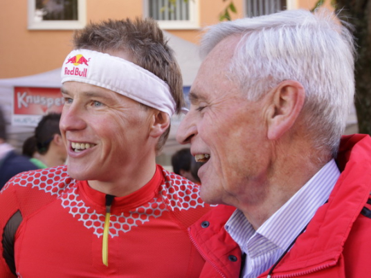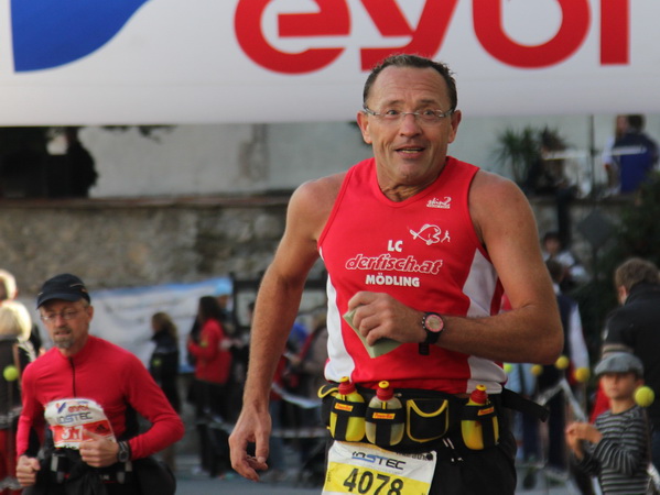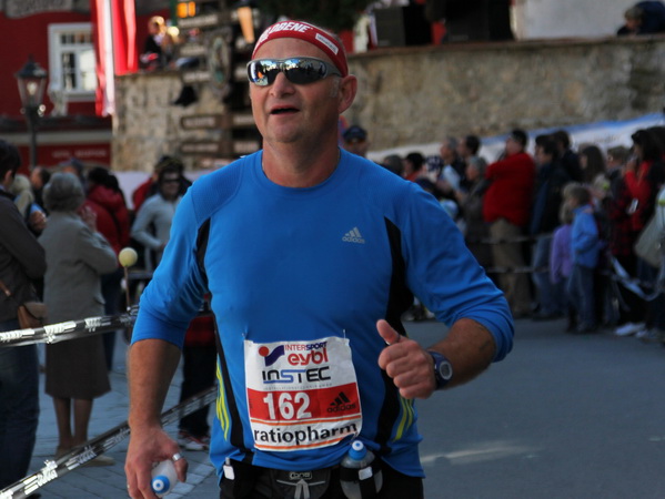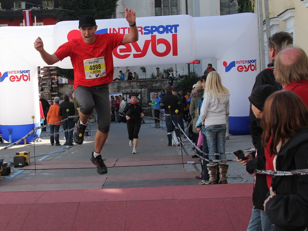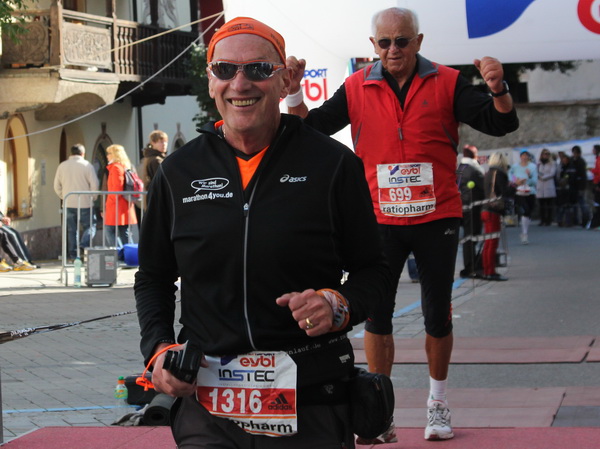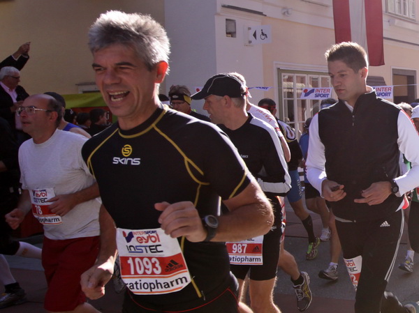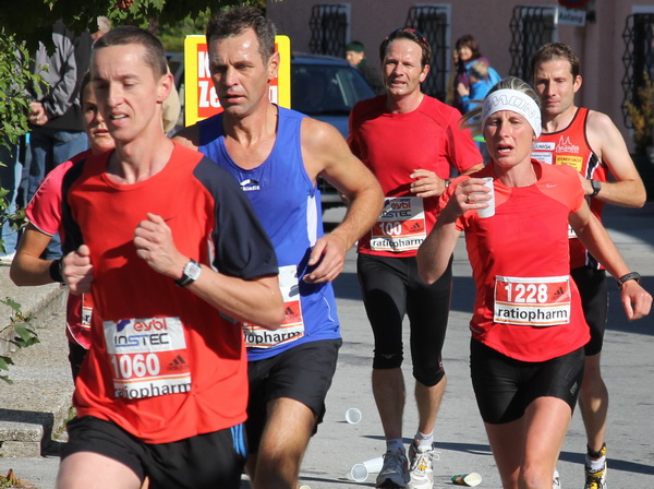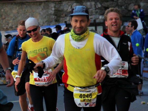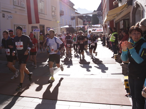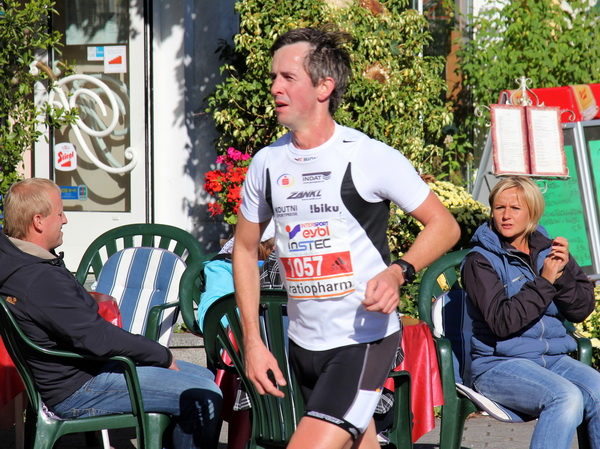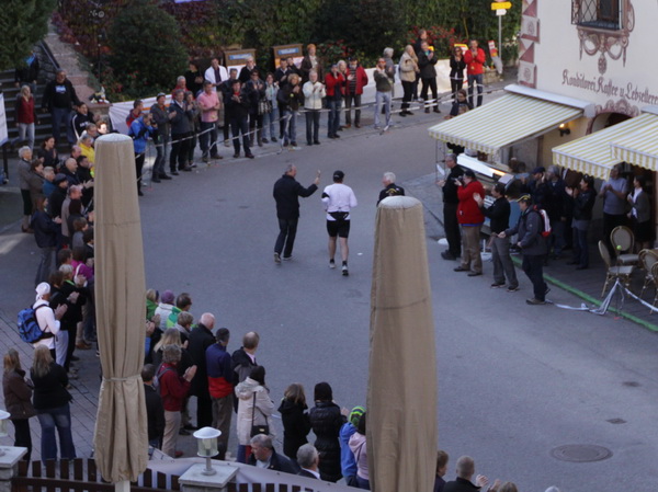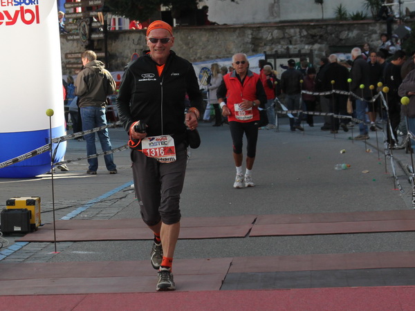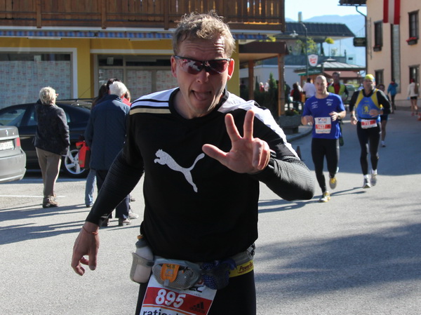Ich renne auf den Balkon und schaue auf die Strecke. Nicht abgekämpft oder auf dem Zahnfleisch kommt der Erich aus Wien daher, sondern quitschvergnügt, aber humpelnd. Er ist verletzt und hat sich trotzdem durchgebissen. Das gibt Sympathiepunkte und spornt die vielen Zuschauer zu noch mehr Applaus an. Dankbar verneigt er sich und genießt die tolle Atmosphäre. Glück für ihn, dass ich gekniffen habe. Ich hätte ihm heute den Triumph streitig gemacht.