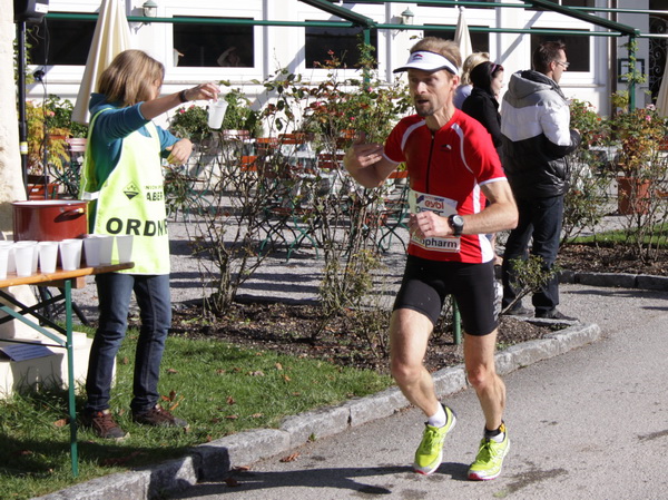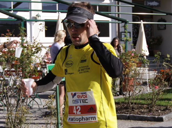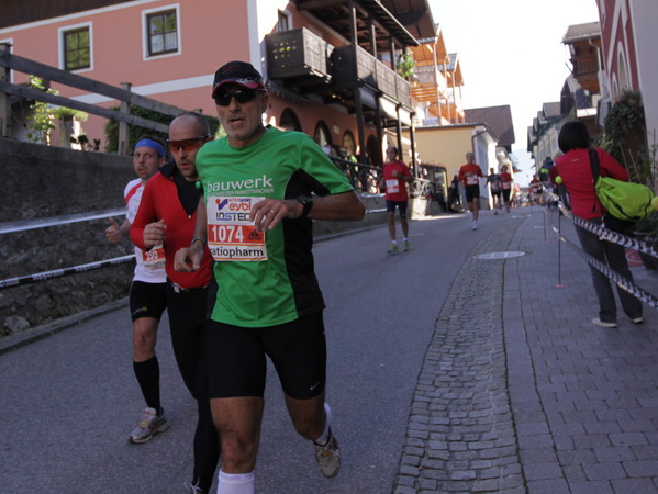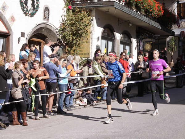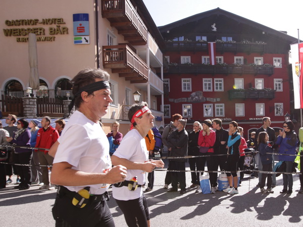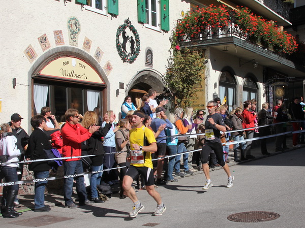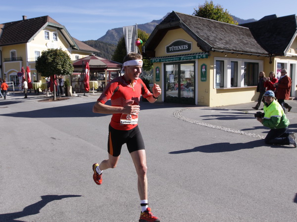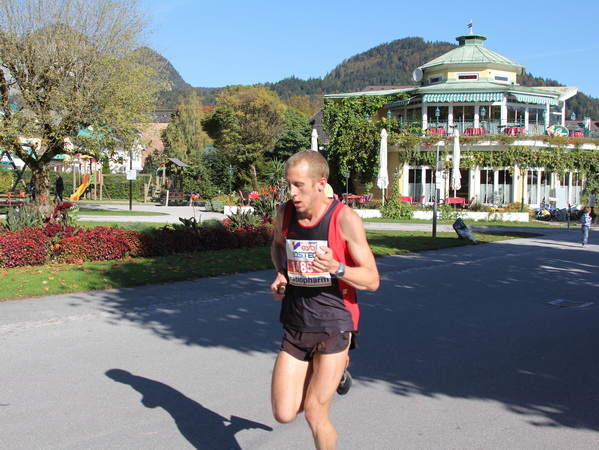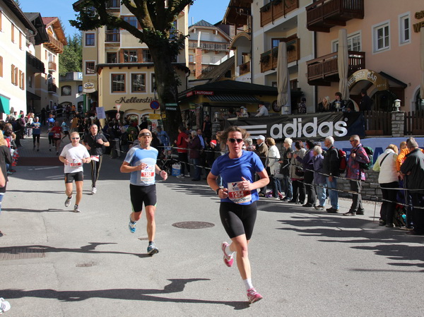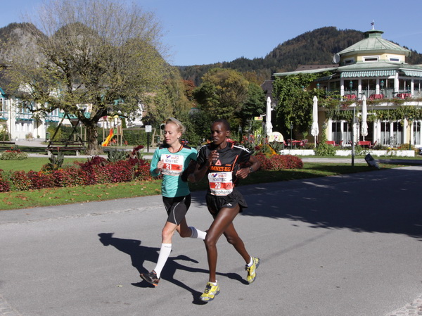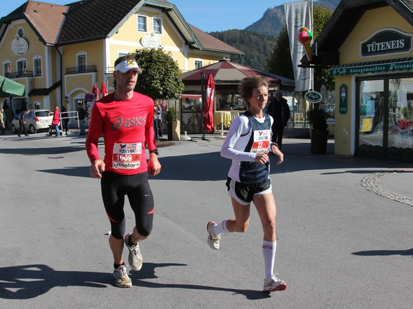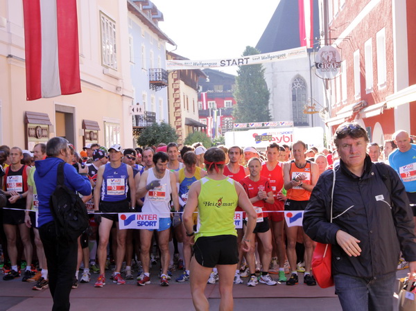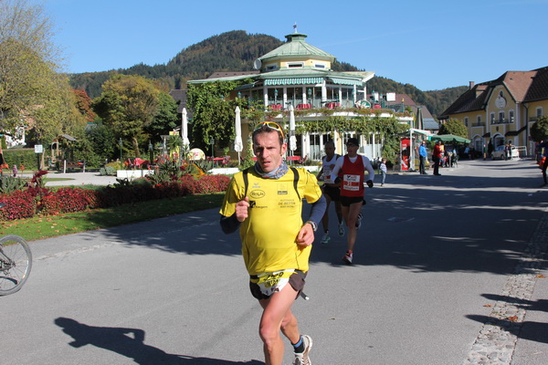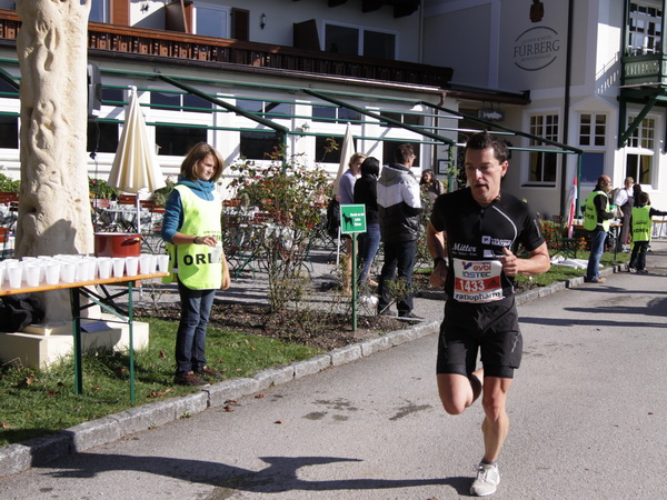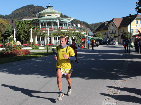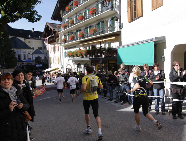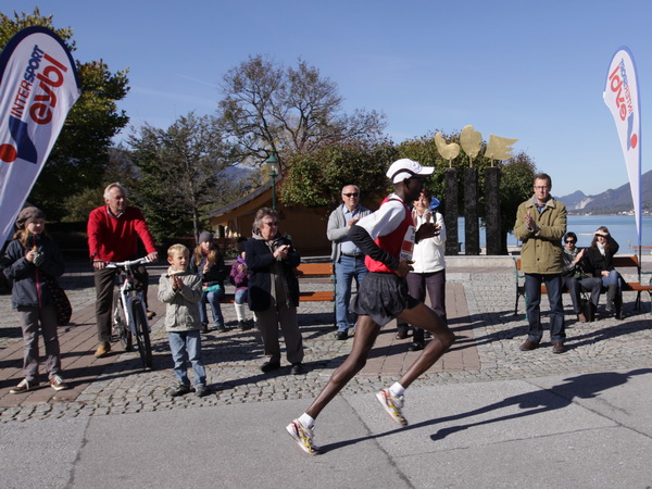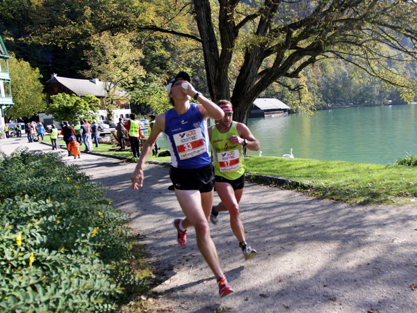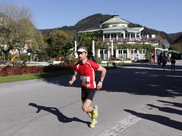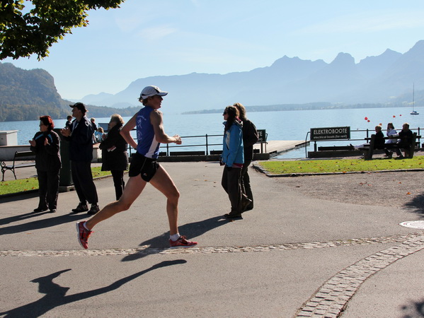 Man könnte ja sagen, man hat genug gesehen und tut jetzt was für eine akzeptable Zeit. Aber ausgerechnet jetzt steigt die Strecke etwas an. Gleich liefern aber wieder herrliche Blicke über den See genügend Alibis für eine Foto- und Gehpause. Zwei Kilometer vor dem Ziel kann man sich noch einmal erfrischen. Damit man nicht gar so fertig ausschaut, wenn man gleich vor großem Publikum hinunter auf den Markt spurtet, zwischen Weißem und Schwarzem Rössl und vor der Wallfahrtskirche die letzte Kurve kriegt und ins Ziel rennt.