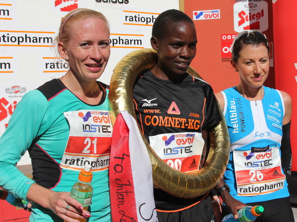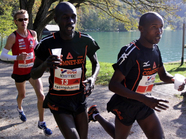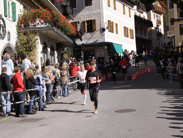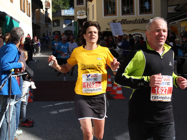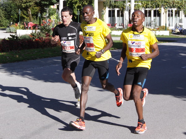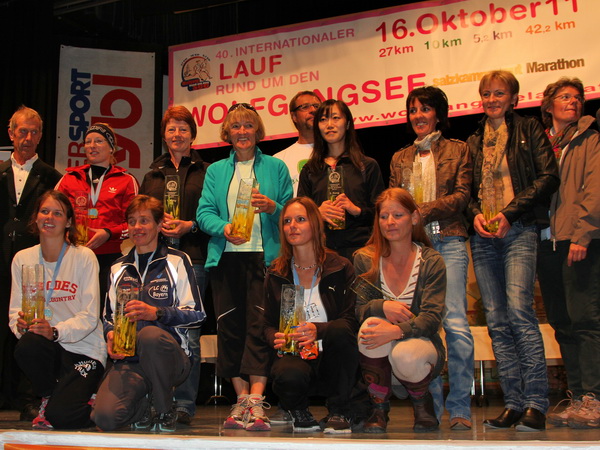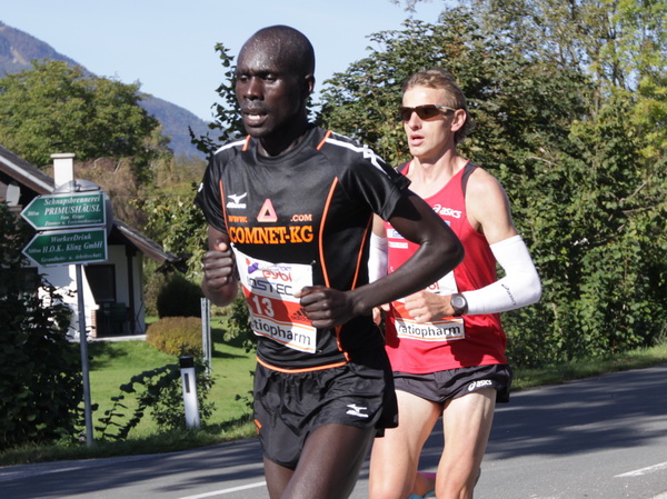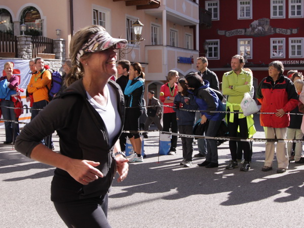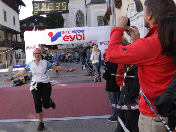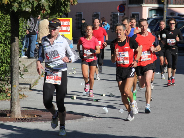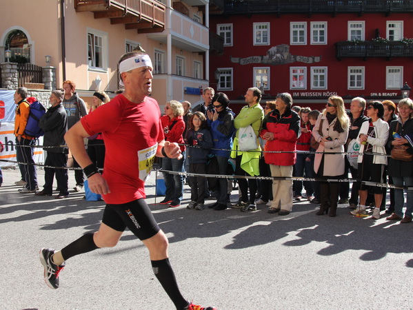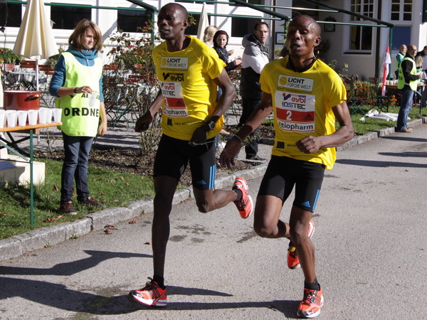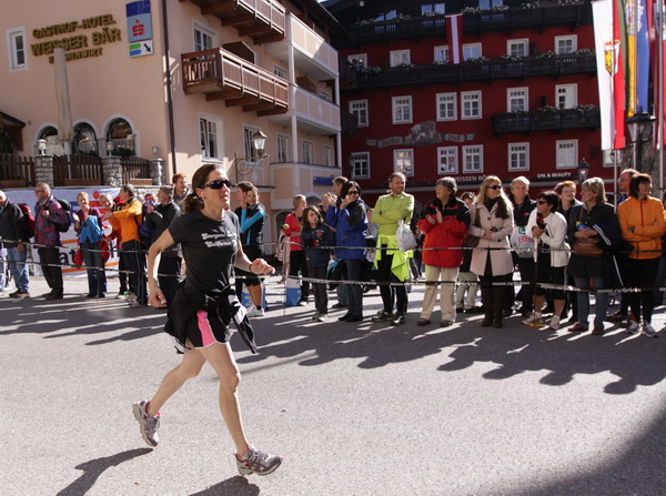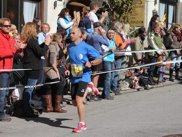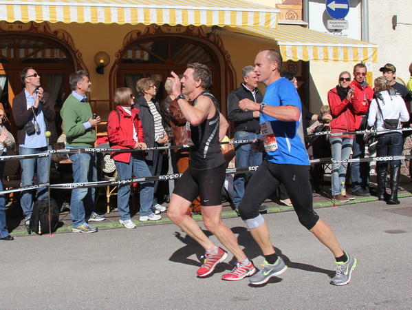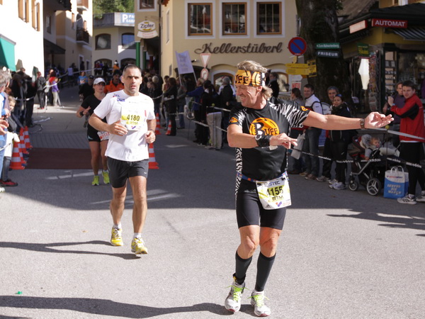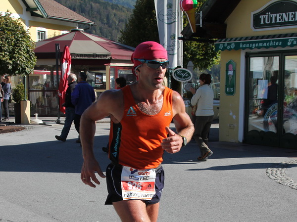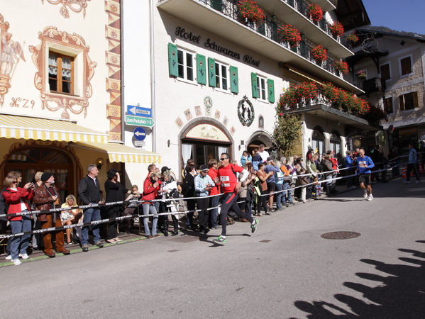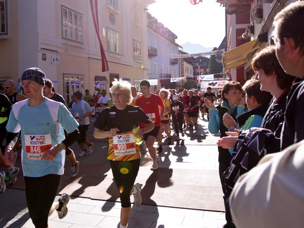 Man könnte ja sagen, man hat genug gesehen und tut jetzt was für eine akzeptable Zeit. Aber ausgerechnet jetzt steigt die Strecke etwas an. Gleich liefern aber wieder herrliche Blicke über den See genügend Alibis für eine Foto- und Gehpause. Zwei Kilometer vor dem Ziel kann man sich noch einmal erfrischen. Damit man nicht gar so fertig ausschaut, wenn man gleich vor großem Publikum hinunter auf den Markt spurtet, zwischen Weißem und Schwarzem Rössl und vor der Wallfahrtskirche die letzte Kurve kriegt und ins Ziel rennt.