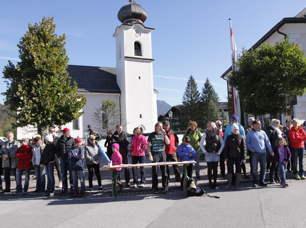 Drei unvergleichlich schöne Kilometer durch Wiesen, Schilf, kleine Wäldchen und eine herbstlich bunte Birkenallee liegen hinter uns, als wir Strobl (km 21/36) erreichen. Zusammen mit St. Gilgen und St. Wolfgang gehört Strobl zur Wolfgangsee Tourismus Gesellschaft (WTG), die für die Veranstaltung verantwortlich zeichnet. Den Namen des Ferienortes muss man unbedingt erklären. Strobl nannte man einen „struwweligen“ Mann. Und im 14. Jahrhundert, als der Wolfgangsee noch der Abersee war, lebte hier so einer, der Friedrich Stroblo nämlich. Ihm gehörte zunächst nur ein kleiner Fischteich. Tüchtig muss die Familie gewesen sein, denn 160 Jahre später werden die Strobl’s als Besitzer von Liegenschaften geführt, die den Kern der gesamten Ansiedlung ausmachten. Man nannte sie ganz einfach Strobl, was 1593 erstmals auch dokumentiert wurde. Das Wappen von Strobl zeigt logischerweise ein unverkennbar schlecht frisiertes Mannsbild.