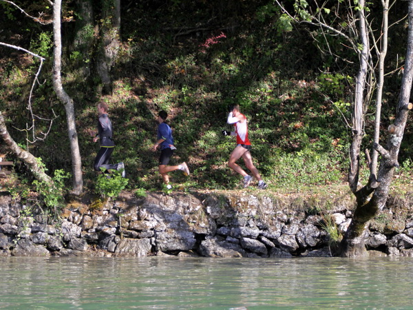 Auf dem asphaltierten Uferweg ist trotz leichter Steigung gut laufen. Von vielen Bootshäusern reichen Anlegestege in den See. Kein Boot ist zu sehen. Ganz still ist es, auch der See zeigt keine Bewegung. Keiner spricht. Man schaut auf Wälder und Berge, die sich im See spiegeln und hält manchmal sein Gesicht genussvoll in die wärmende Sonne. Welch ein Tag.