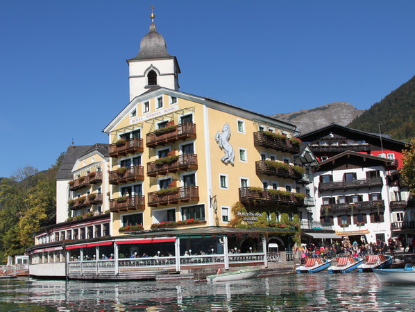 „Noch 9 Km“ wird uns drohend angezeigt. Über Wiesen und verschilfte Flächen schauen wir auf den See und erkennen unschwer am anderen Ufer am Fuß des Schafberg St. Wolfgang und das direkt am See liegende legendäre Hotel „Zum weißen Rössl“. Seit über 500 Jahren gibt es den Beherbergungsbetrieb schon, seit fast 100 Jahren ist er im Familienbesitz. Ein Glücksfall für das Haus und die ganze Region war, als Ralph Benatzky es als Kulisse für sein Singspiel auserwählte. Ich bin sicher, irgendwann diesen Winter läuft auf irgendeinem Kanal die 99. Wiederholung der Verfilmung aus dem Jahr 1960 mit Peter Alexander als liebeskranken Oberkellner Leopold. Sein „Im Salzkammergut, da man gut lustig sein“ ist fast zum geflügelten Wort geworden.