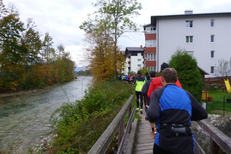 Die ersten Meter gehen noch durch Bad Ischl, vorbei an einigen Prachtbauten. Danach rechne ich im Geheimen mit mehr oder weniger langweiligen 15 km und werde sehr angenehm enttäuscht, denn fast drei km verlaufen unmittelbar am Ufer der Ischl, für einen Wasserliebhaber wie mich ein Hochgenuss. Ich freue mich, sehr bald auf den bereits erwähnten Josy Simon, den neuen Weltrekordinhaber der M80 im 6-Stunden-Lauf zu treffen und beglückwünschen zu können. Ich möchte auch gerne mit 82 so fit sein und so gut aussehen! Den folgenden vierten km absolvieren wir über einen kleinen Trail, auch der ist so richtig nach meinem Geschmack. Weiter parallel zur Ischl, allerdings mit einigem Abstand, führt die Strecke weiter.