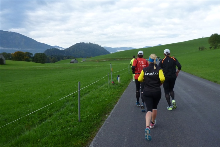Danach gibt’s tatsächlich elf Landstraßenkilometer, die aber garniert mit jeder Menge schöner Landschaft, also alles andere als langweilig. Oliver ist als Ossi selber Marathonveranstalter, läuft mit seinem Wessi-Kumpel und grüßt auf diesem Weg einen gewissen Joe K., der mir persönlich leider unbekannt ist. Vielleicht liest er ja diese Zeilen. Die erste von vielen, vielen Labestationen versorgt uns mit allem Notwendigen. In Radau ist es wider Erwarten ruhig, daher lassen wir es, wie vorher schon Kreutern, Wirling, später Rußbach und Bürglstein – dazu später mehr - bald hinter uns.