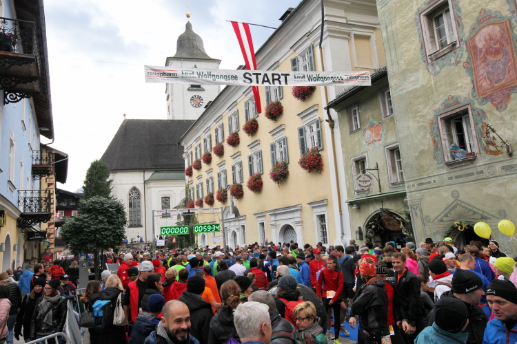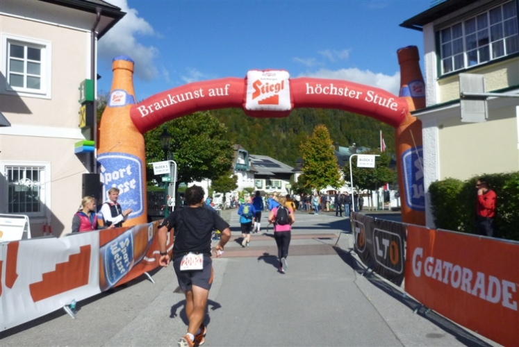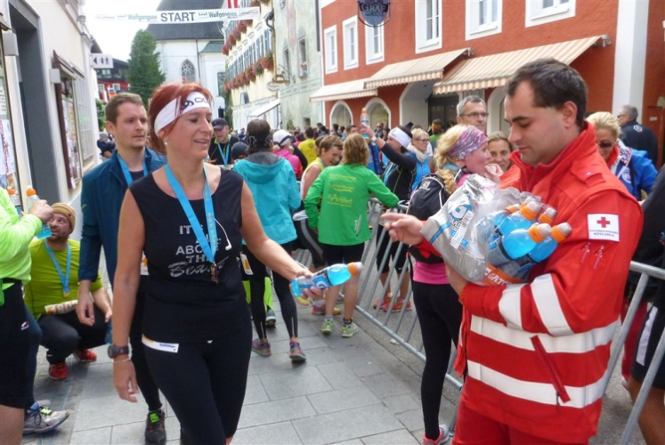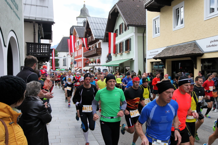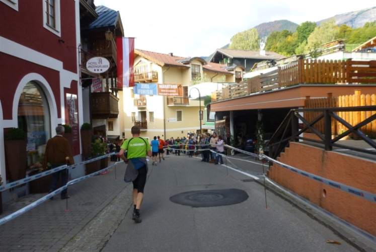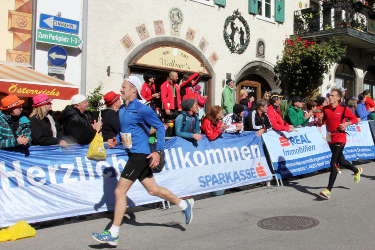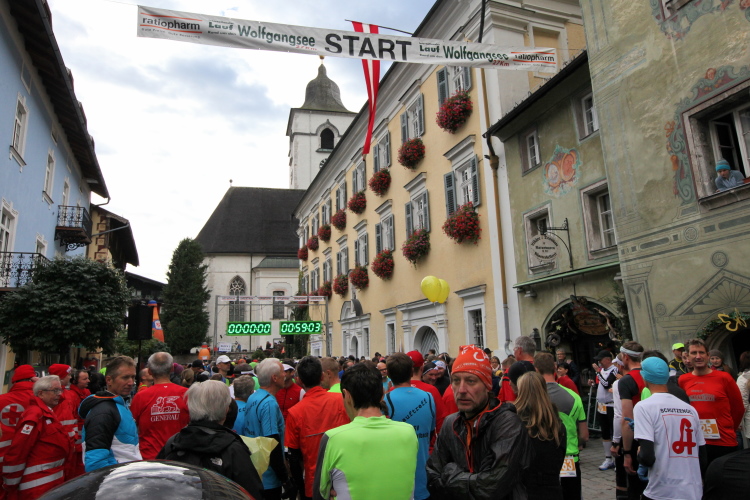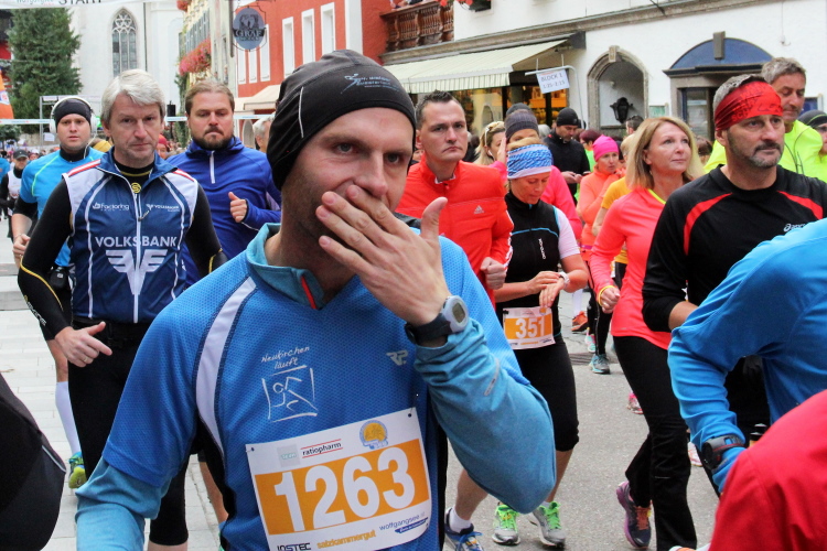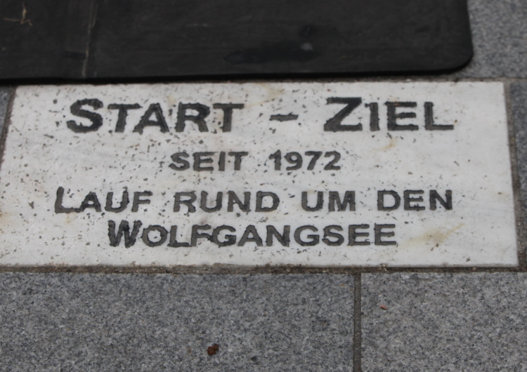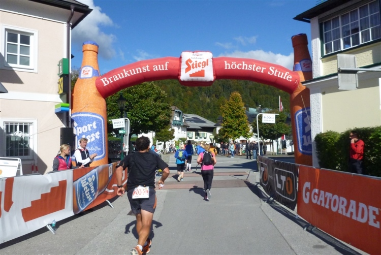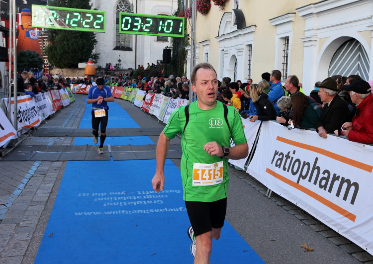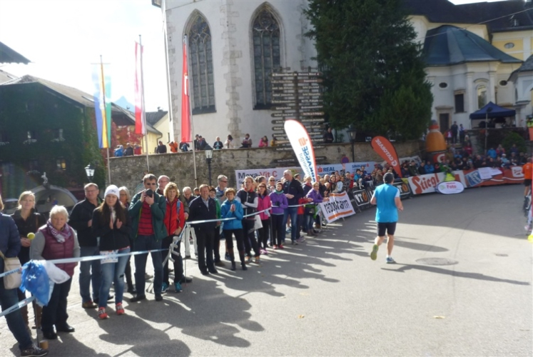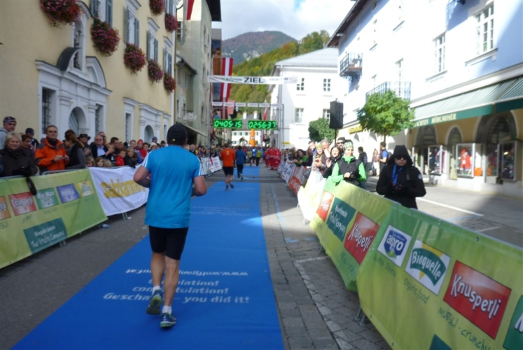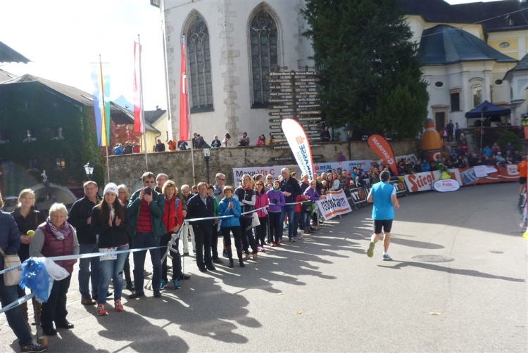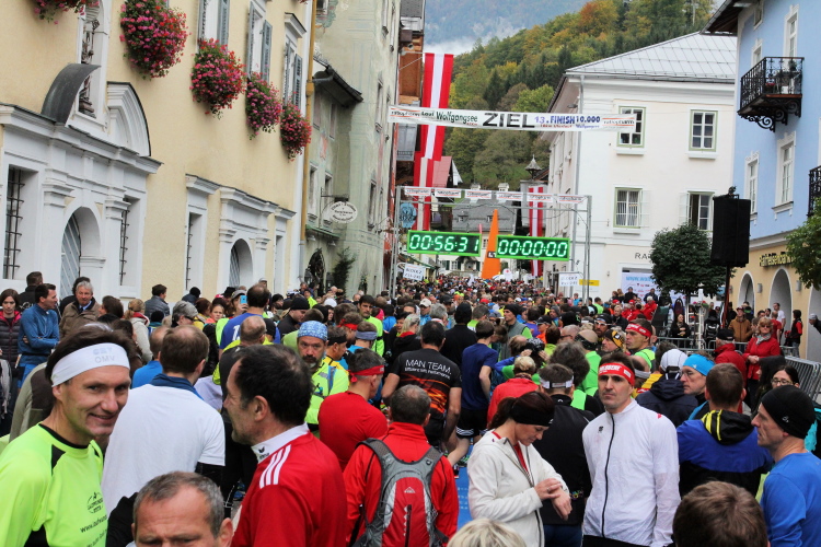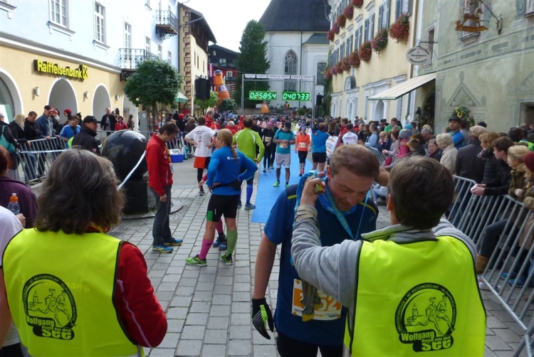 In St. Wolfgang auf den letzten Metern erfolgt wieder das hochbeliebte Schaulaufen, jede Menge Leute haben sich eingefunden, uns den Abschluss dieses tollen Laufs zu versüßen. Unmittelbar auf die Kirche mit ihrem Pilgerbrunnen zu, das „Weiße Rössl“ zur Linken, geht es ein letztes Mal rechts um die Kurve und auf blauem Teppich sehr nett vom Moderator begleitet, hat dieser Lauf – wirklich! - leider schon sein Ende. Der Sperrer Franz fängt mich sofort ab und will wissen, wie es mir gefallen hat. Gerechnet hat er wahrscheinlich mit zwei Sätzen, bekommt aber diesen Bericht in Kurzform aufs Ohr gedrückt. Ja, lieber Franz, da mußtetst Du jetzt durch, situationselastisch quasi, wie der AUT-Verteidigungsminister beim Graz-Marathon! Seinem breiten Grinsen entnehme ich jedoch, dass er mit meinem Redeschwall gut umgehen kann.