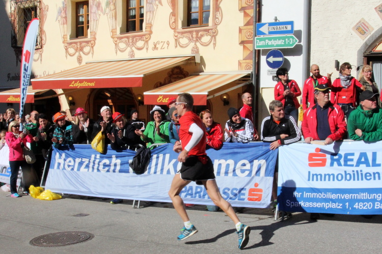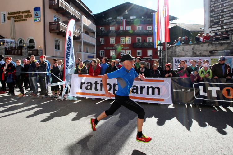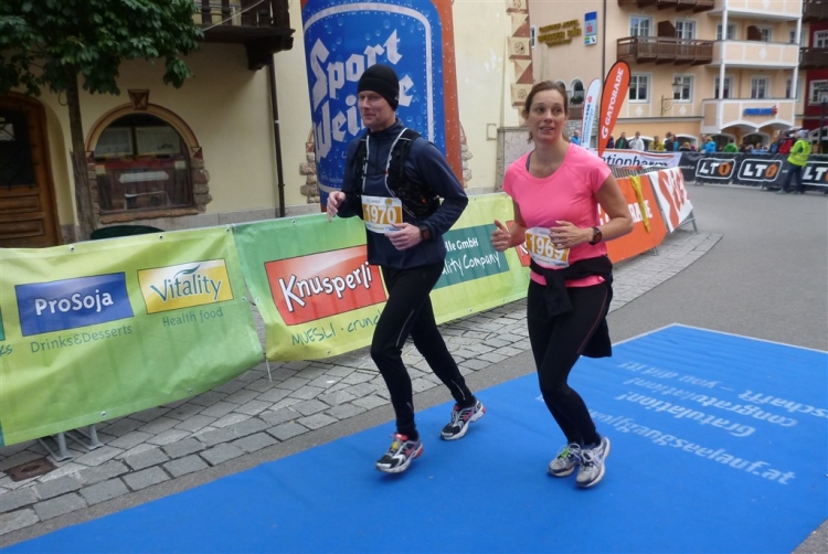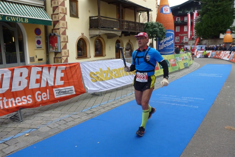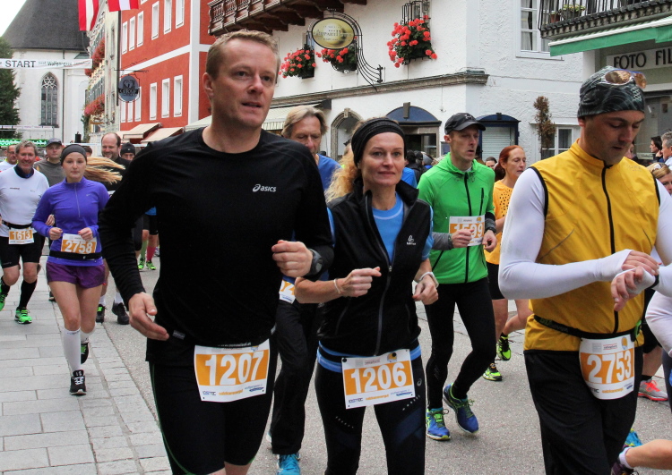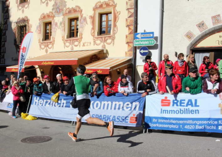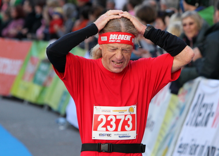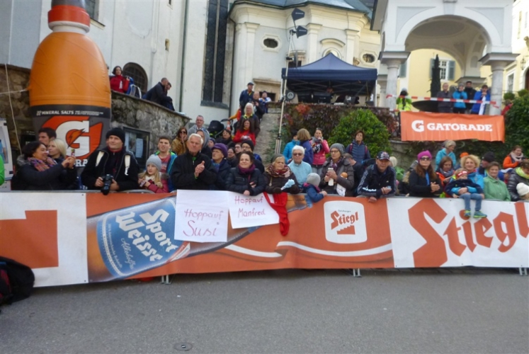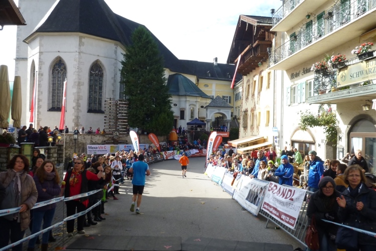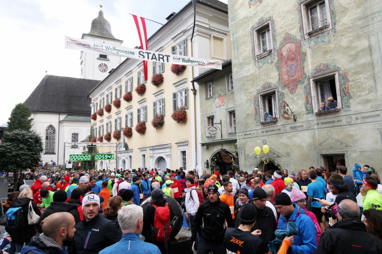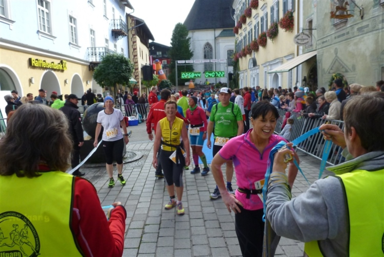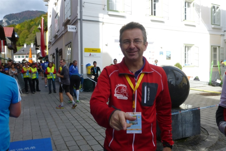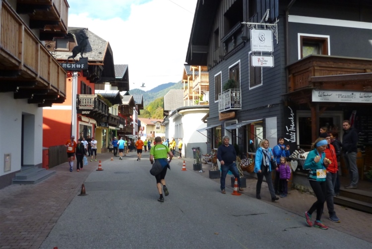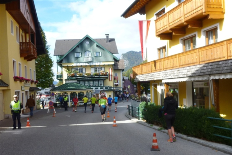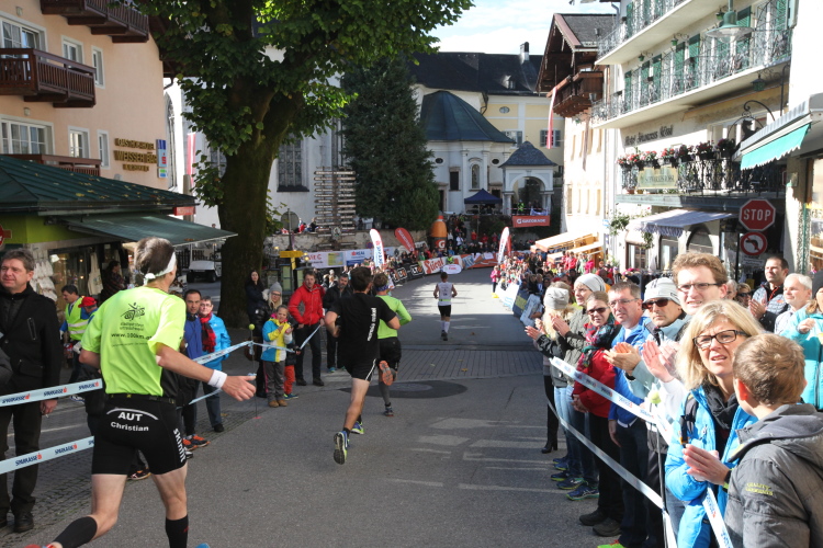 In St. Wolfgang auf den letzten Metern erfolgt wieder das hochbeliebte Schaulaufen, jede Menge Leute haben sich eingefunden, uns den Abschluss dieses tollen Laufs zu versüßen. Unmittelbar auf die Kirche mit ihrem Pilgerbrunnen zu, das „Weiße Rössl“ zur Linken, geht es ein letztes Mal rechts um die Kurve und auf blauem Teppich sehr nett vom Moderator begleitet, hat dieser Lauf – wirklich! - leider schon sein Ende. Der Sperrer Franz fängt mich sofort ab und will wissen, wie es mir gefallen hat. Gerechnet hat er wahrscheinlich mit zwei Sätzen, bekommt aber diesen Bericht in Kurzform aufs Ohr gedrückt. Ja, lieber Franz, da mußtetst Du jetzt durch, situationselastisch quasi, wie der AUT-Verteidigungsminister beim Graz-Marathon! Seinem breiten Grinsen entnehme ich jedoch, dass er mit meinem Redeschwall gut umgehen kann.
