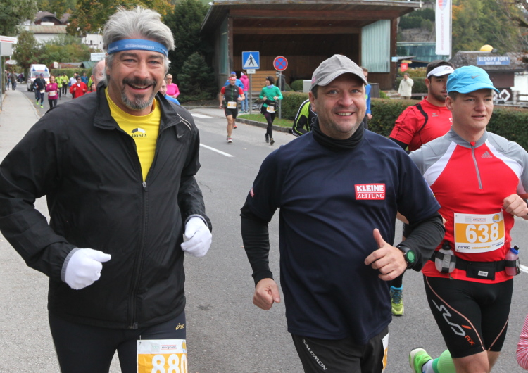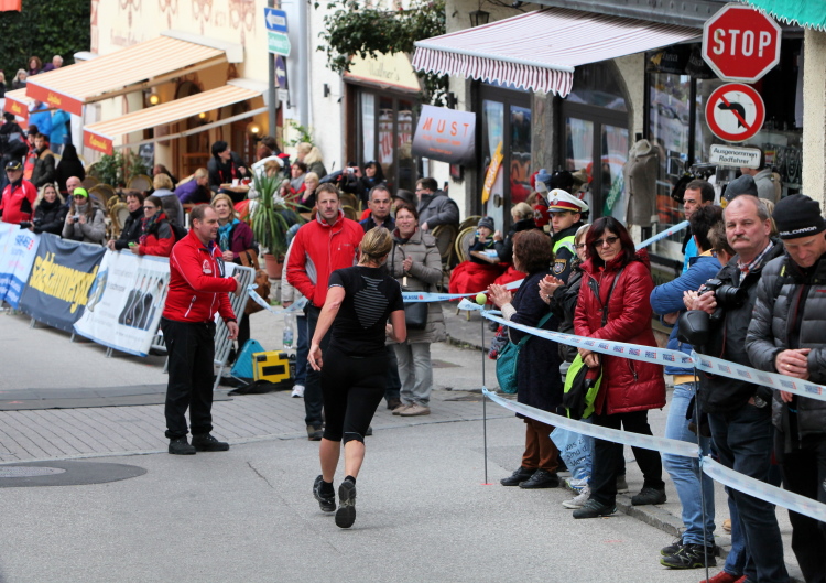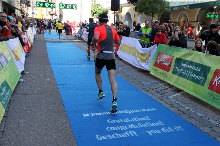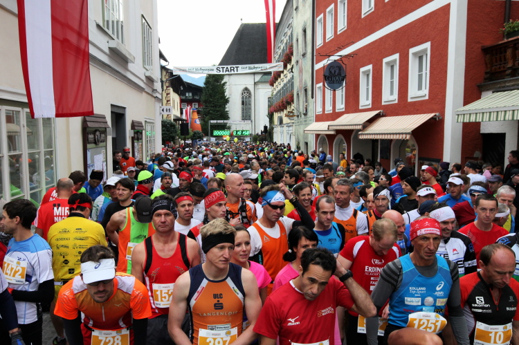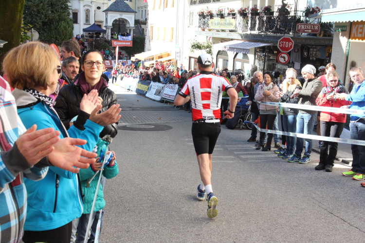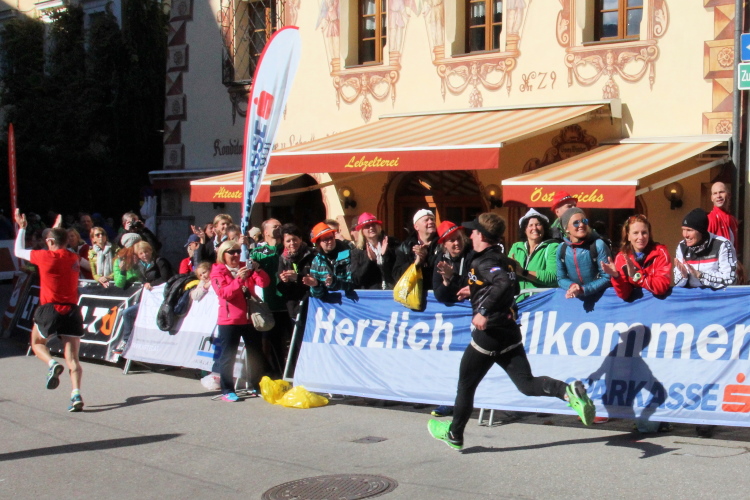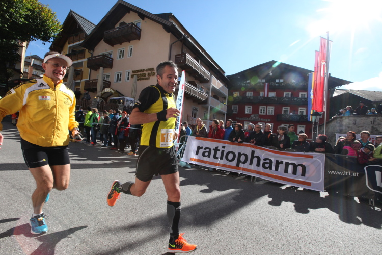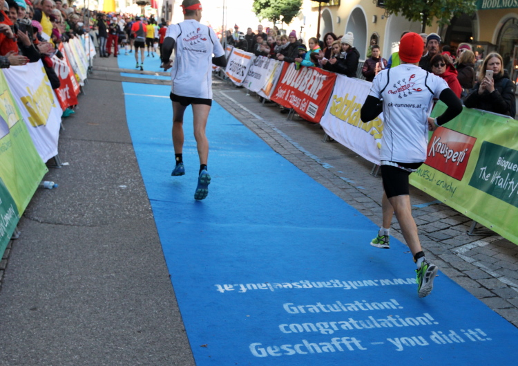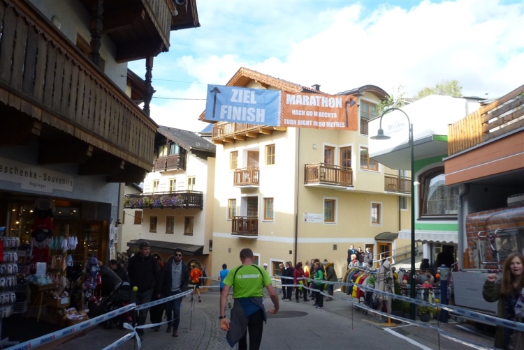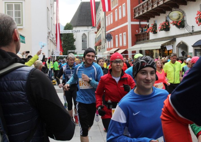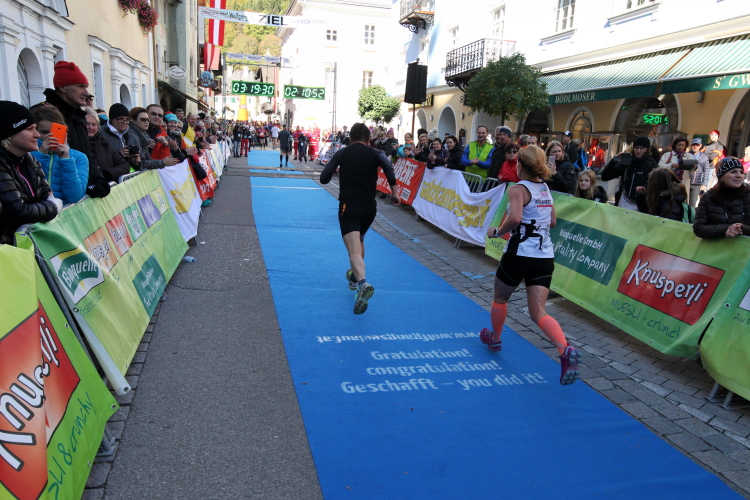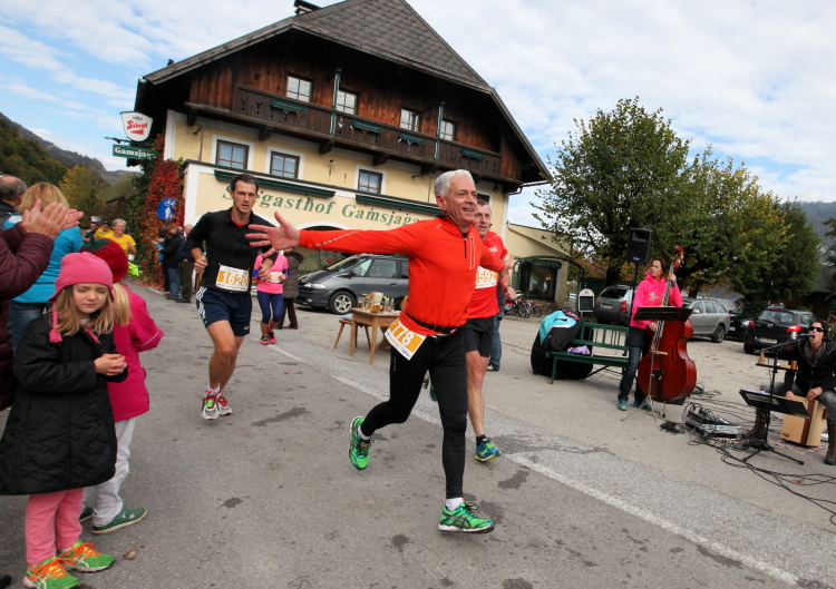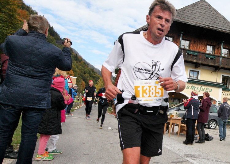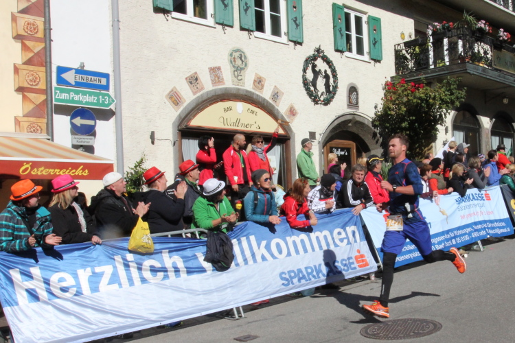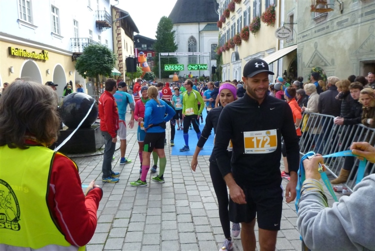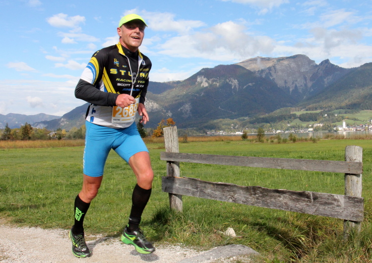 In St. Wolfgang auf den letzten Metern erfolgt wieder das hochbeliebte Schaulaufen, jede Menge Leute haben sich eingefunden, uns den Abschluss dieses tollen Laufs zu versüßen. Unmittelbar auf die Kirche mit ihrem Pilgerbrunnen zu, das „Weiße Rössl“ zur Linken, geht es ein letztes Mal rechts um die Kurve und auf blauem Teppich sehr nett vom Moderator begleitet, hat dieser Lauf – wirklich! - leider schon sein Ende. Der Sperrer Franz fängt mich sofort ab und will wissen, wie es mir gefallen hat. Gerechnet hat er wahrscheinlich mit zwei Sätzen, bekommt aber diesen Bericht in Kurzform aufs Ohr gedrückt. Ja, lieber Franz, da mußtetst Du jetzt durch, situationselastisch quasi, wie der AUT-Verteidigungsminister beim Graz-Marathon! Seinem breiten Grinsen entnehme ich jedoch, dass er mit meinem Redeschwall gut umgehen kann.