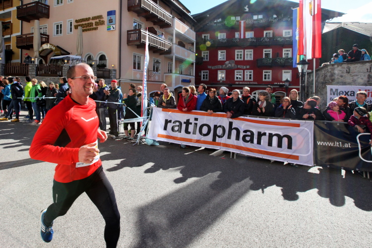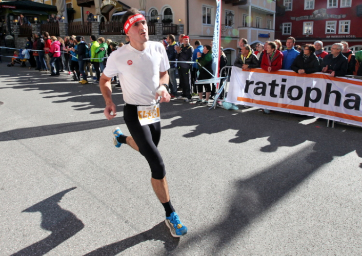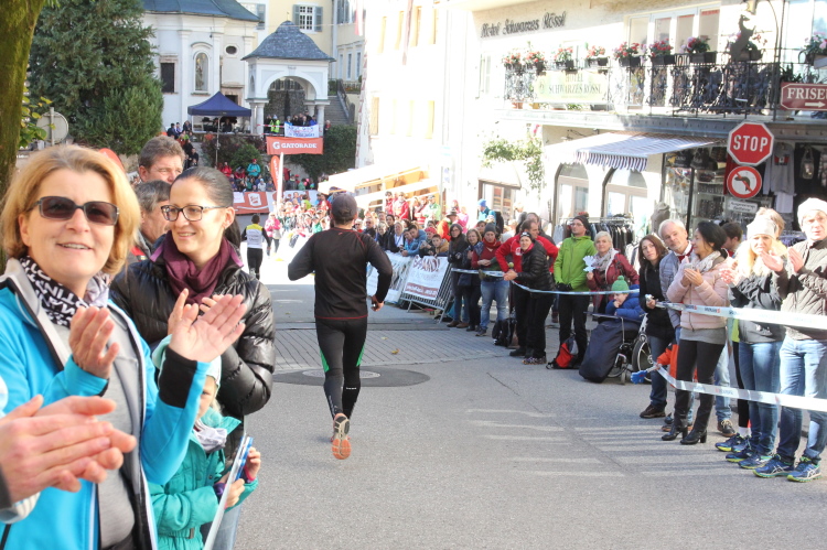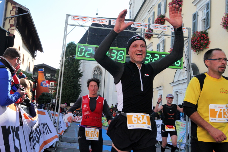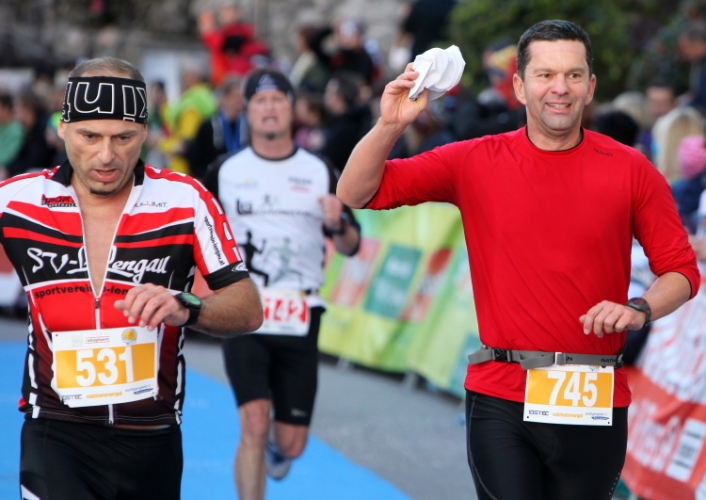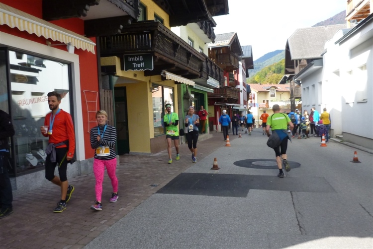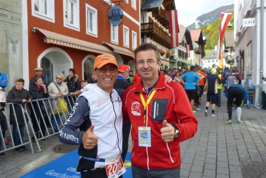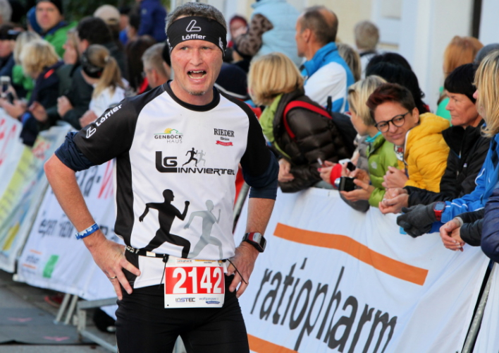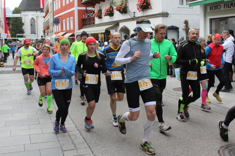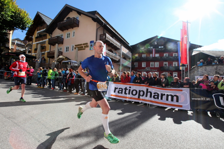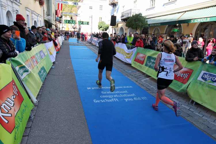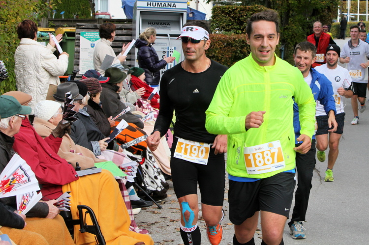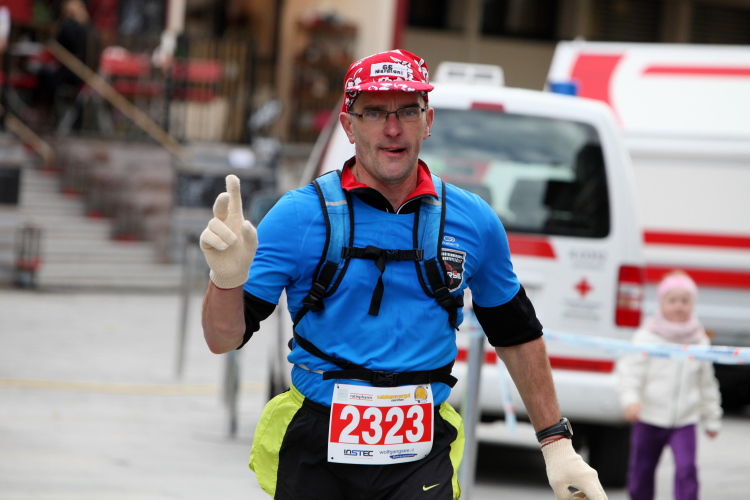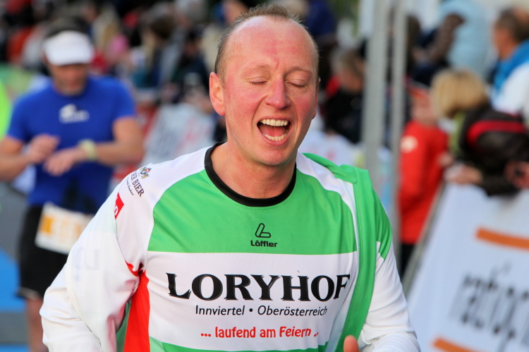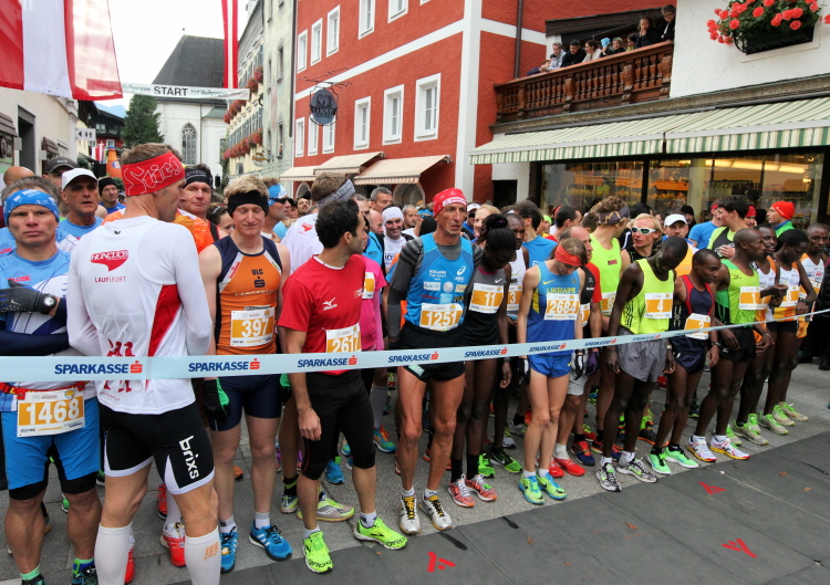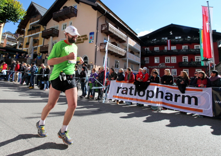 In St. Wolfgang auf den letzten Metern erfolgt wieder das hochbeliebte Schaulaufen, jede Menge Leute haben sich eingefunden, uns den Abschluss dieses tollen Laufs zu versüßen. Unmittelbar auf die Kirche mit ihrem Pilgerbrunnen zu, das „Weiße Rössl“ zur Linken, geht es ein letztes Mal rechts um die Kurve und auf blauem Teppich sehr nett vom Moderator begleitet, hat dieser Lauf – wirklich! - leider schon sein Ende. Der Sperrer Franz fängt mich sofort ab und will wissen, wie es mir gefallen hat. Gerechnet hat er wahrscheinlich mit zwei Sätzen, bekommt aber diesen Bericht in Kurzform aufs Ohr gedrückt. Ja, lieber Franz, da mußtetst Du jetzt durch, situationselastisch quasi, wie der AUT-Verteidigungsminister beim Graz-Marathon! Seinem breiten Grinsen entnehme ich jedoch, dass er mit meinem Redeschwall gut umgehen kann.