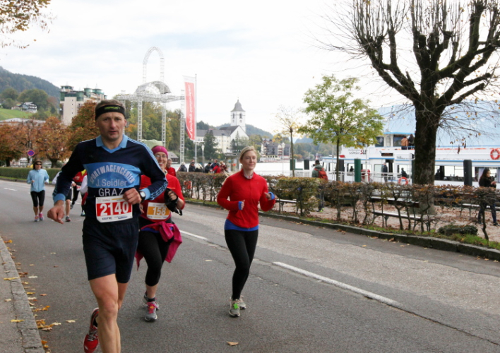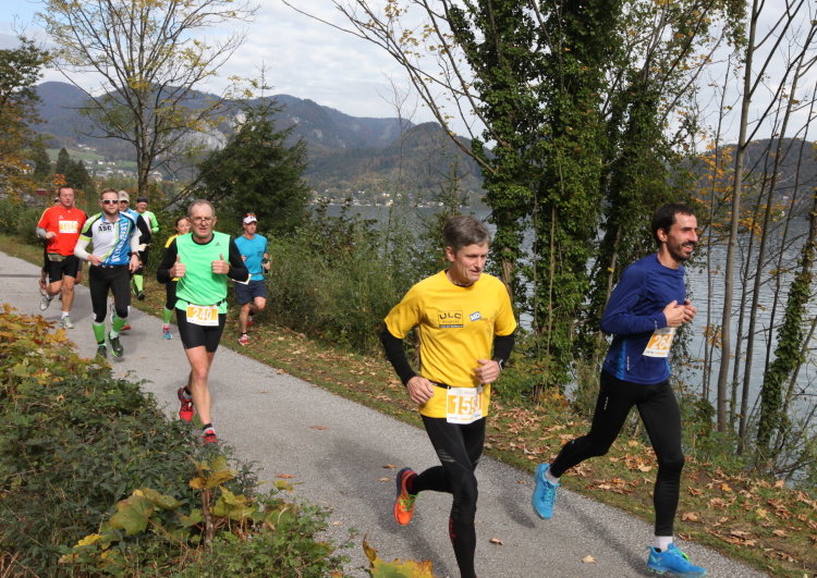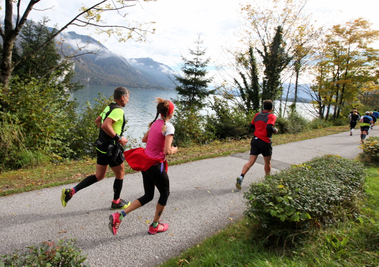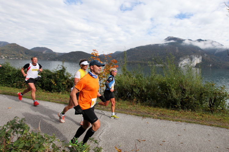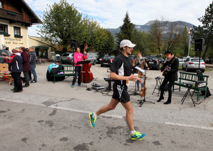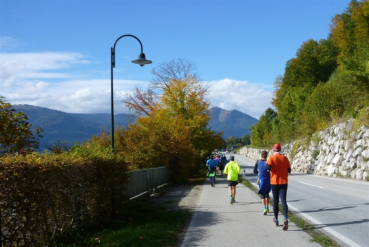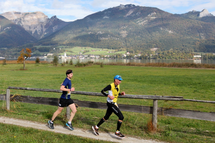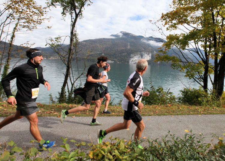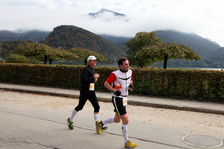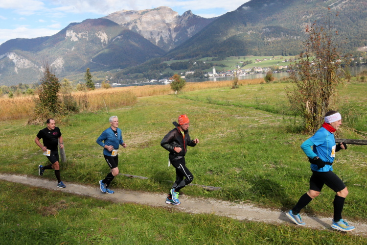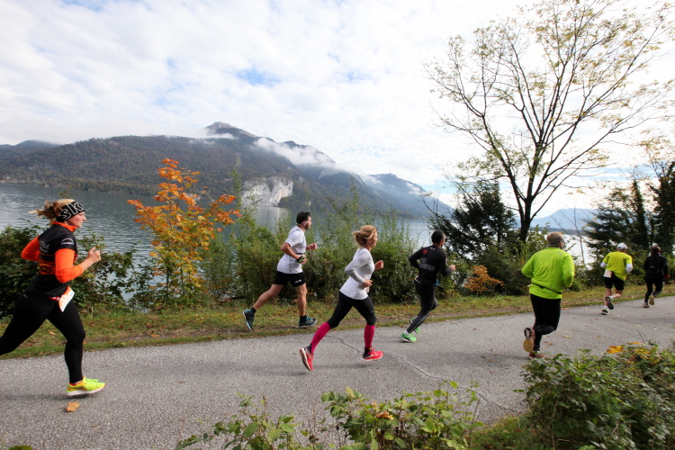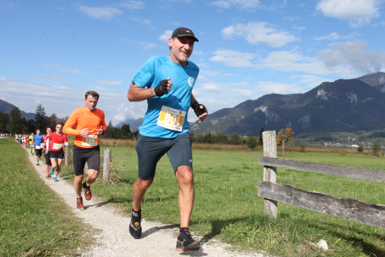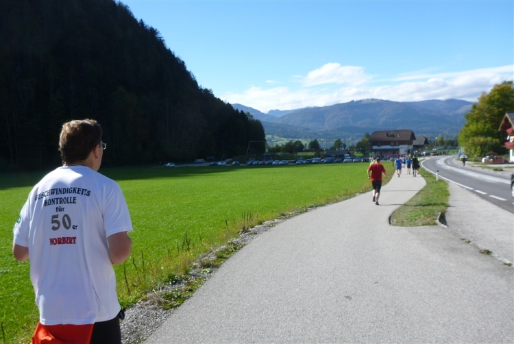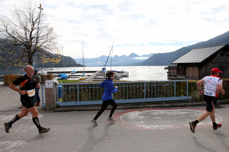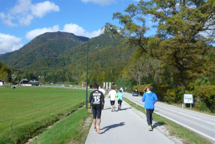 Ein wunderbarer Spazierweg ist der nächste Untergrund, fast trailartig geht es wieder zum See. Der Bürgelstein, ein riesiger, in den See ragender Felsen, ist bereits auszumachen. Ich weiß, dass die Panoramaläufer diesen im Gegensatz zu uns seeseitig über eine lange Bohlenbrücke passieren dürfen. Da entgeht uns echt etwas! Das jammere ich später dem Zimmermann Franz, dem „Erfinder“ und stolze 40 Jahre langen Gesamtleiter des Laufs (Vorgänger vom Sperrer Franz) vor und bilde mir ein, einen klugen Vorschlag gemacht zu haben. Weit gefehlt, denn der Franz fragt zu recht, wo er denn die Mehrkilometer einsparen solle? Nee, dann doch lieber wie gehabt an der tollen Trinkhalle in Bad Ischl starten. Gut, wenn man sich mit Erwachsenen unterhält!