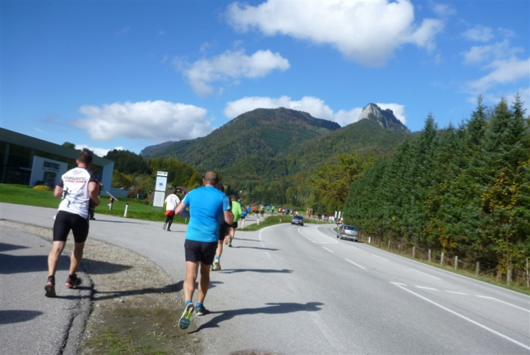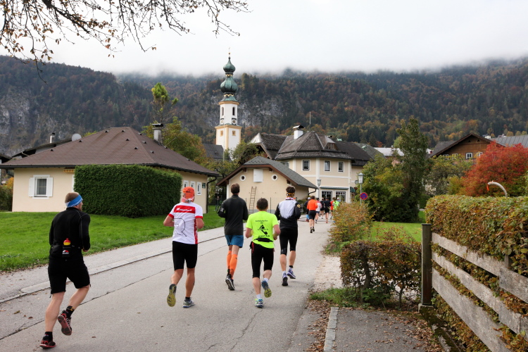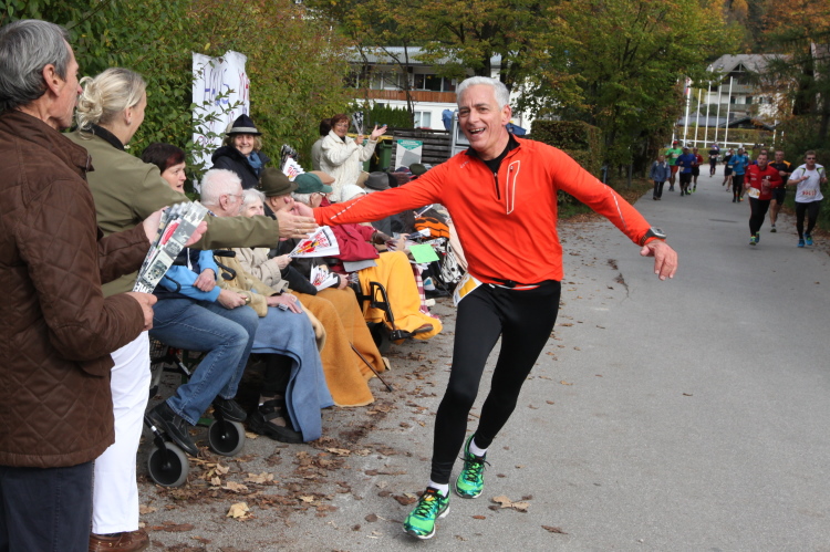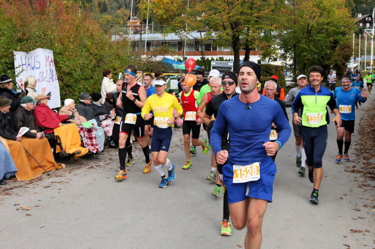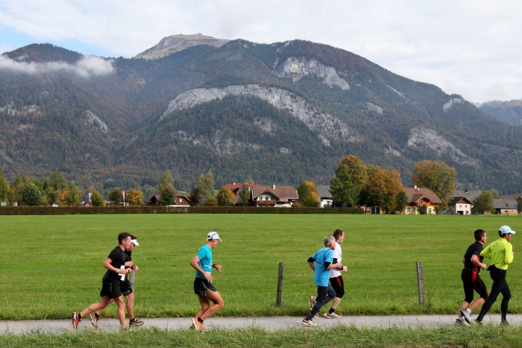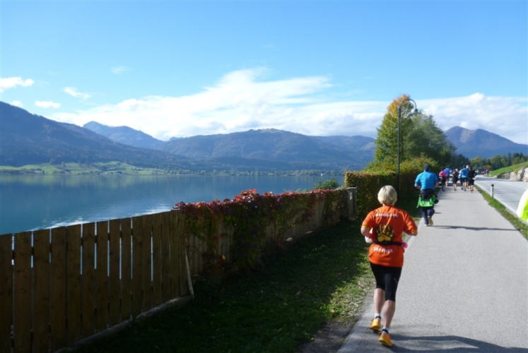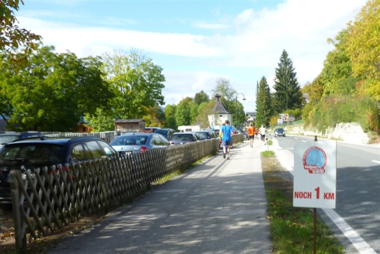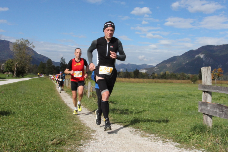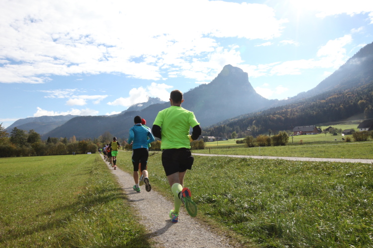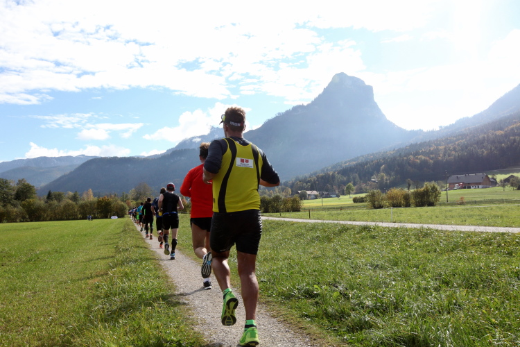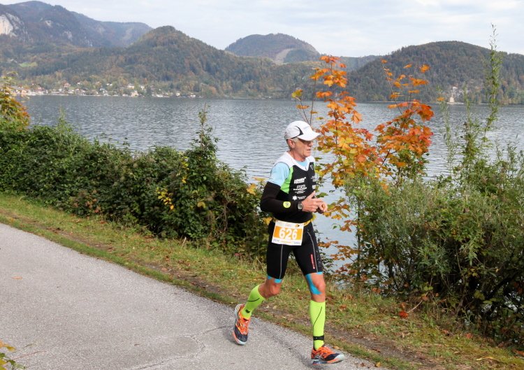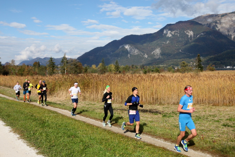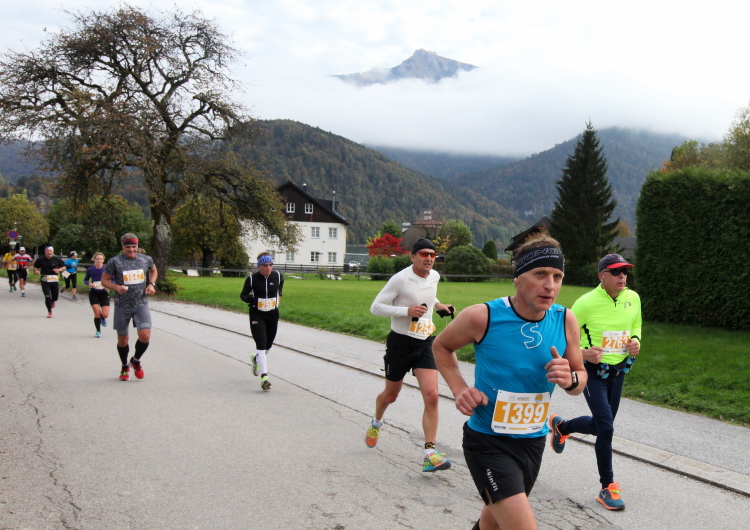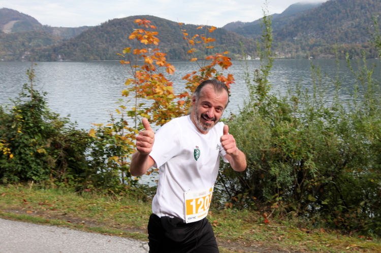 Ein wunderbarer Spazierweg ist der nächste Untergrund, fast trailartig geht es wieder zum See. Der Bürgelstein, ein riesiger, in den See ragender Felsen, ist bereits auszumachen. Ich weiß, dass die Panoramaläufer diesen im Gegensatz zu uns seeseitig über eine lange Bohlenbrücke passieren dürfen. Da entgeht uns echt etwas! Das jammere ich später dem Zimmermann Franz, dem „Erfinder“ und stolze 40 Jahre langen Gesamtleiter des Laufs (Vorgänger vom Sperrer Franz) vor und bilde mir ein, einen klugen Vorschlag gemacht zu haben. Weit gefehlt, denn der Franz fragt zu recht, wo er denn die Mehrkilometer einsparen solle? Nee, dann doch lieber wie gehabt an der tollen Trinkhalle in Bad Ischl starten. Gut, wenn man sich mit Erwachsenen unterhält!