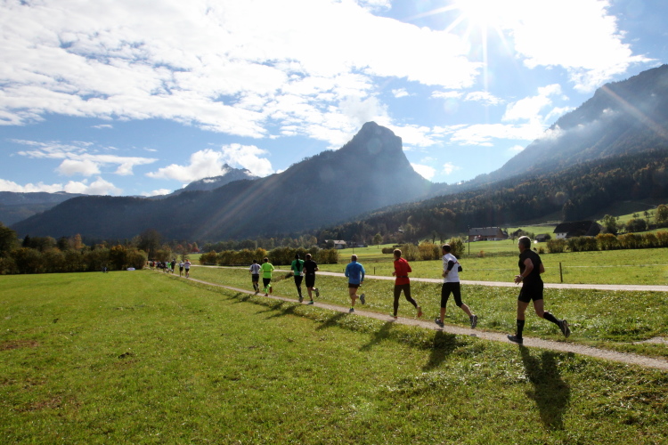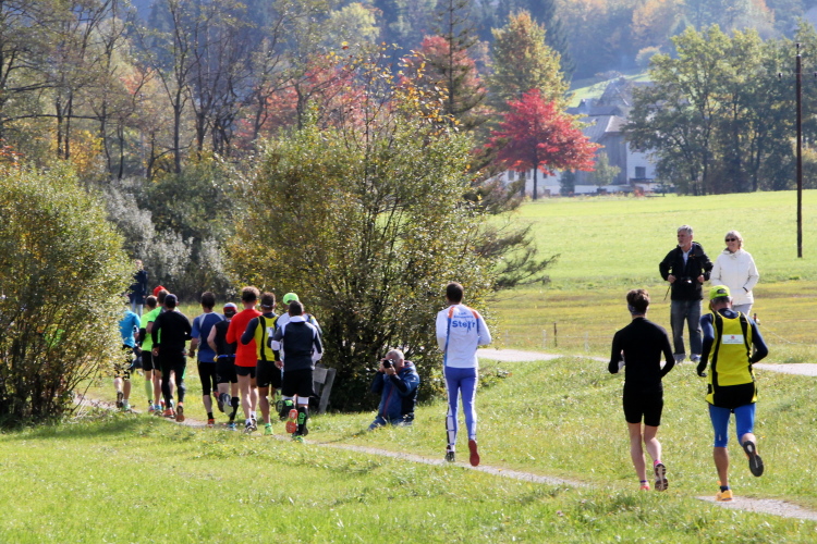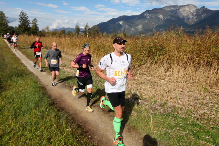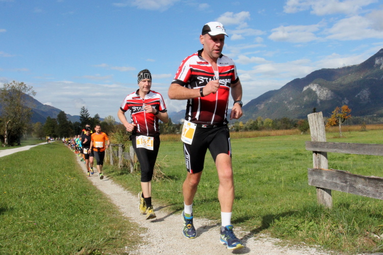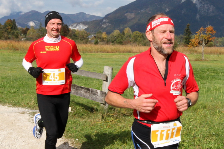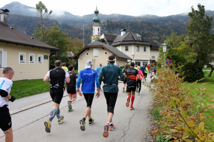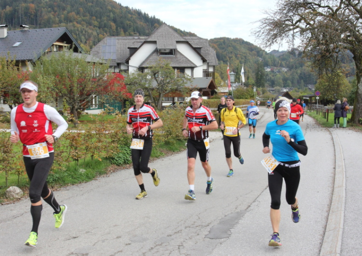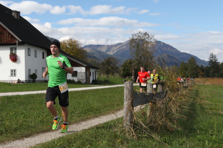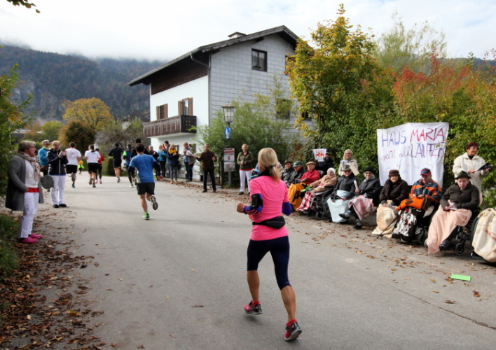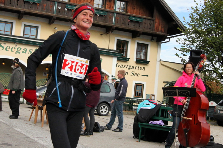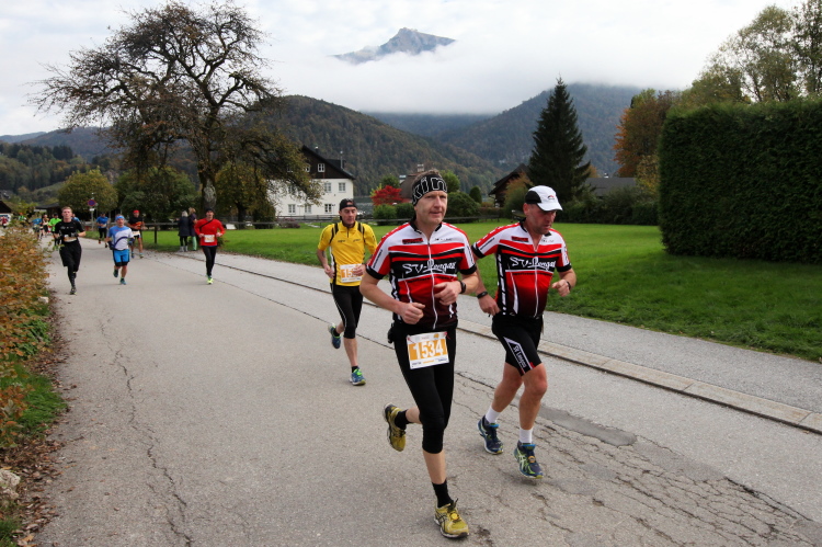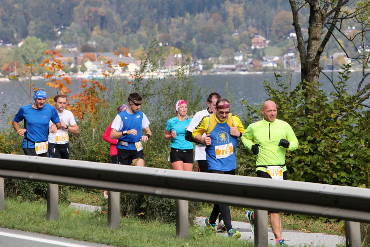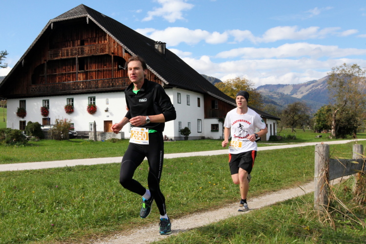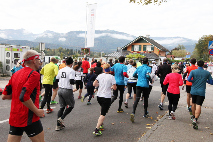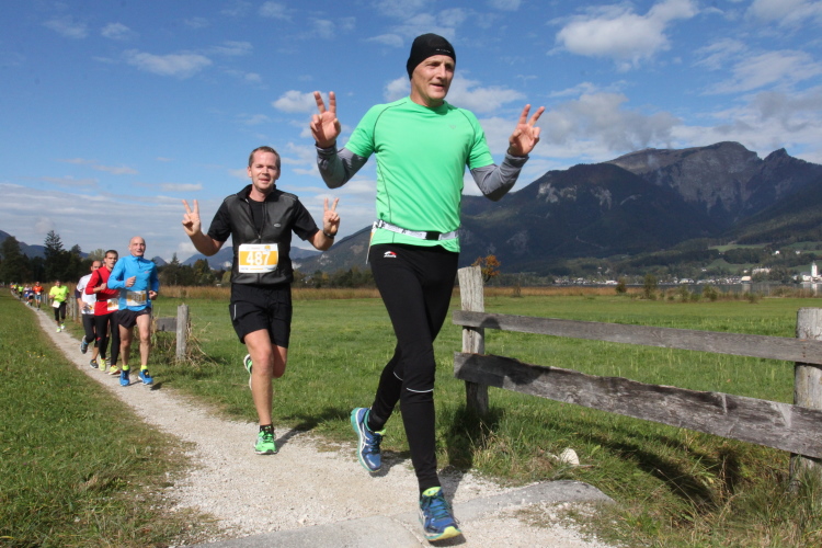 Ein wunderbarer Spazierweg ist der nächste Untergrund, fast trailartig geht es wieder zum See. Der Bürgelstein, ein riesiger, in den See ragender Felsen, ist bereits auszumachen. Ich weiß, dass die Panoramaläufer diesen im Gegensatz zu uns seeseitig über eine lange Bohlenbrücke passieren dürfen. Da entgeht uns echt etwas! Das jammere ich später dem Zimmermann Franz, dem „Erfinder“ und stolze 40 Jahre langen Gesamtleiter des Laufs (Vorgänger vom Sperrer Franz) vor und bilde mir ein, einen klugen Vorschlag gemacht zu haben. Weit gefehlt, denn der Franz fragt zu recht, wo er denn die Mehrkilometer einsparen solle? Nee, dann doch lieber wie gehabt an der tollen Trinkhalle in Bad Ischl starten. Gut, wenn man sich mit Erwachsenen unterhält!
