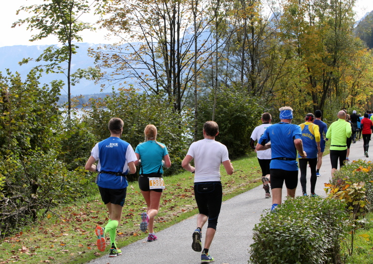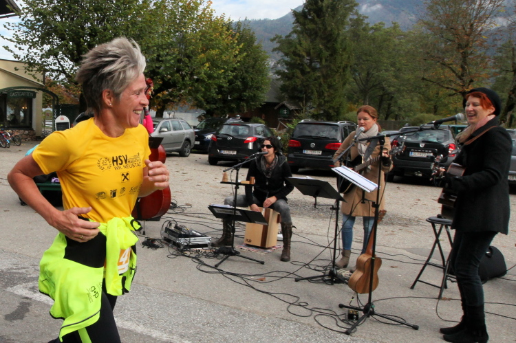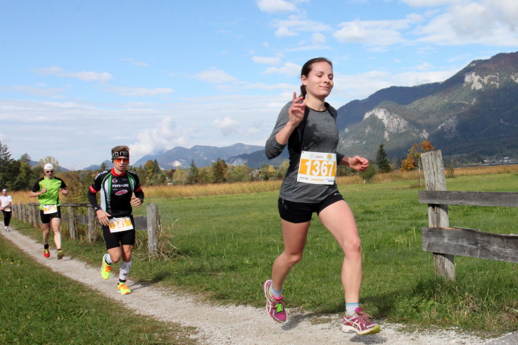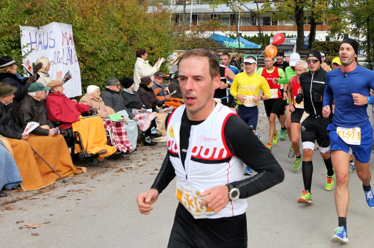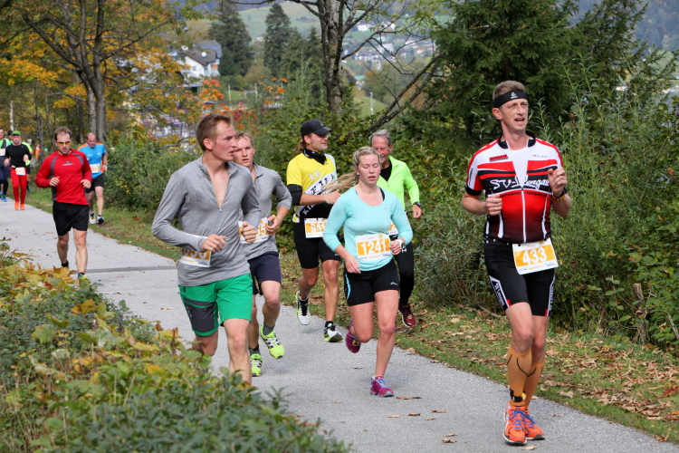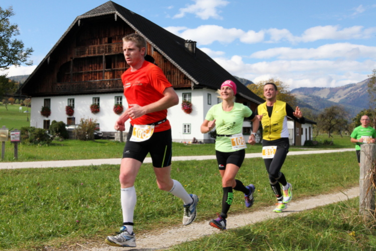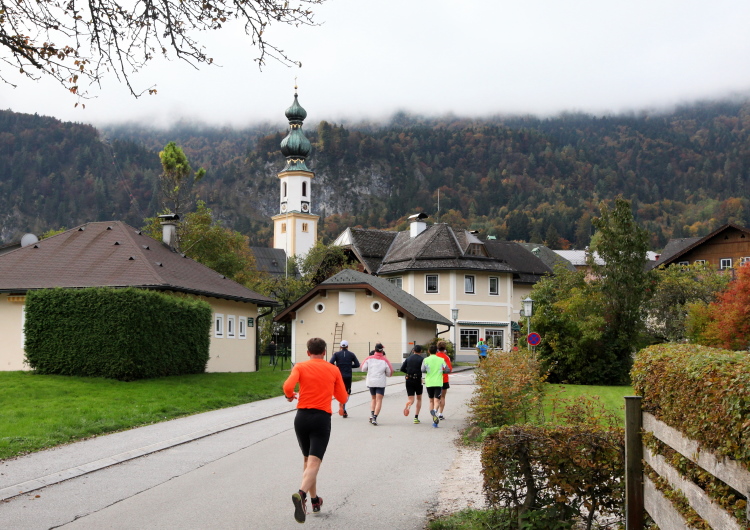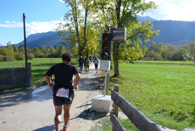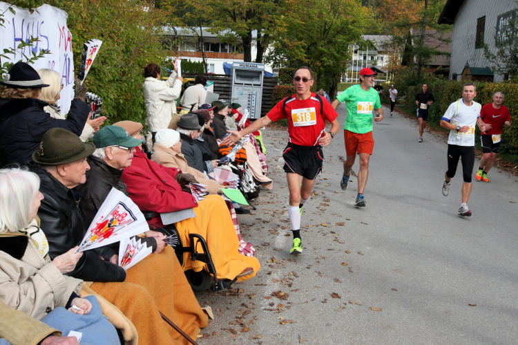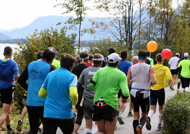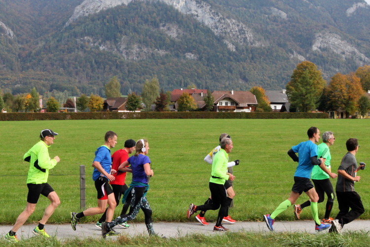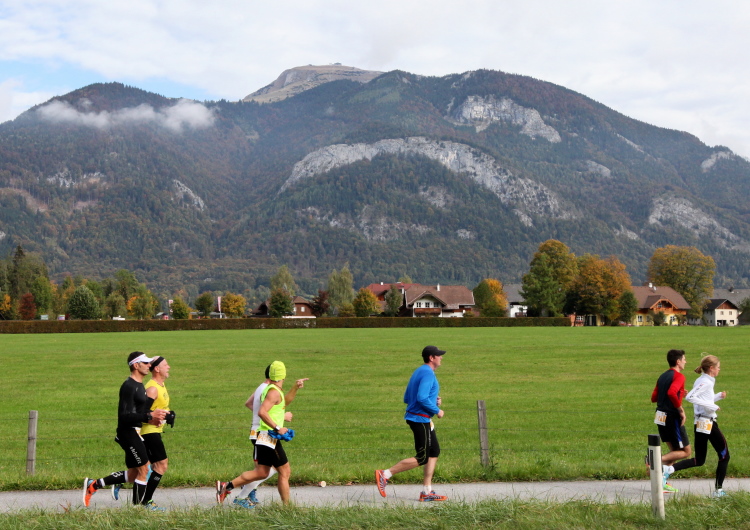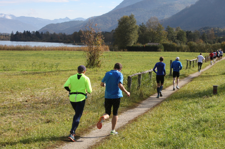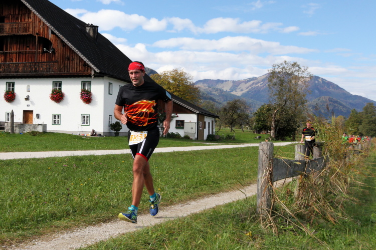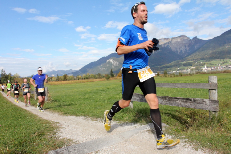 Ein wunderbarer Spazierweg ist der nächste Untergrund, fast trailartig geht es wieder zum See. Der Bürgelstein, ein riesiger, in den See ragender Felsen, ist bereits auszumachen. Ich weiß, dass die Panoramaläufer diesen im Gegensatz zu uns seeseitig über eine lange Bohlenbrücke passieren dürfen. Da entgeht uns echt etwas! Das jammere ich später dem Zimmermann Franz, dem „Erfinder“ und stolze 40 Jahre langen Gesamtleiter des Laufs (Vorgänger vom Sperrer Franz) vor und bilde mir ein, einen klugen Vorschlag gemacht zu haben. Weit gefehlt, denn der Franz fragt zu recht, wo er denn die Mehrkilometer einsparen solle? Nee, dann doch lieber wie gehabt an der tollen Trinkhalle in Bad Ischl starten. Gut, wenn man sich mit Erwachsenen unterhält!